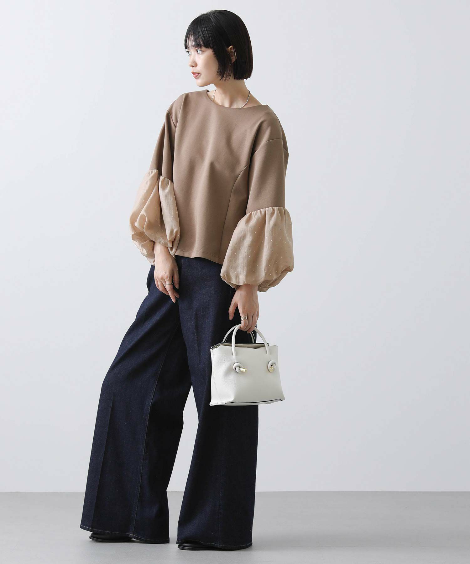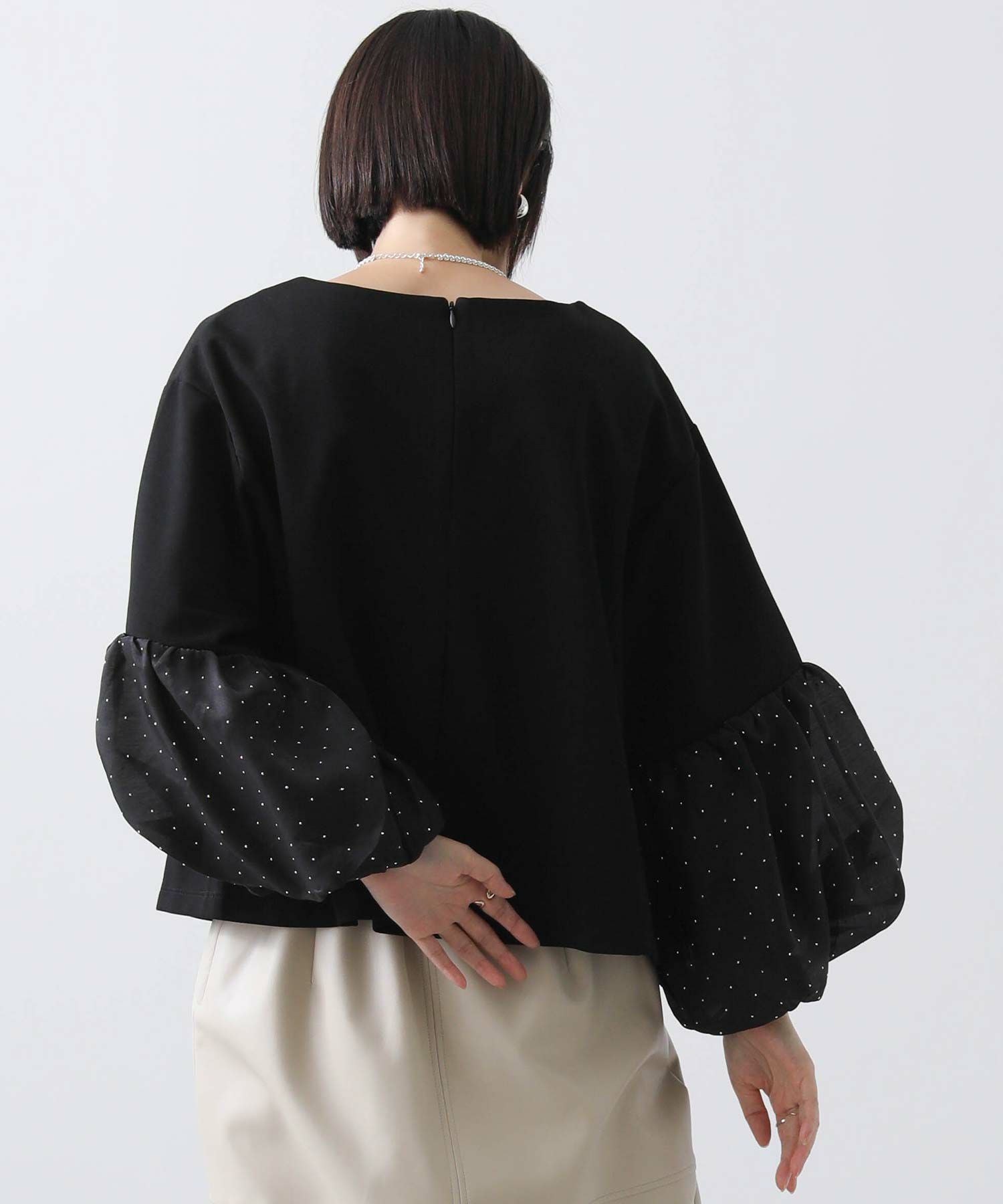 異素材のパフスリーブに、ランダムにつけられたラインストーンがキラキラと光り、コーディネートのポイントに。