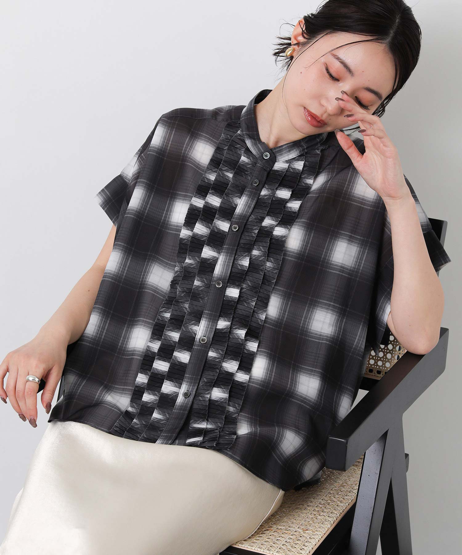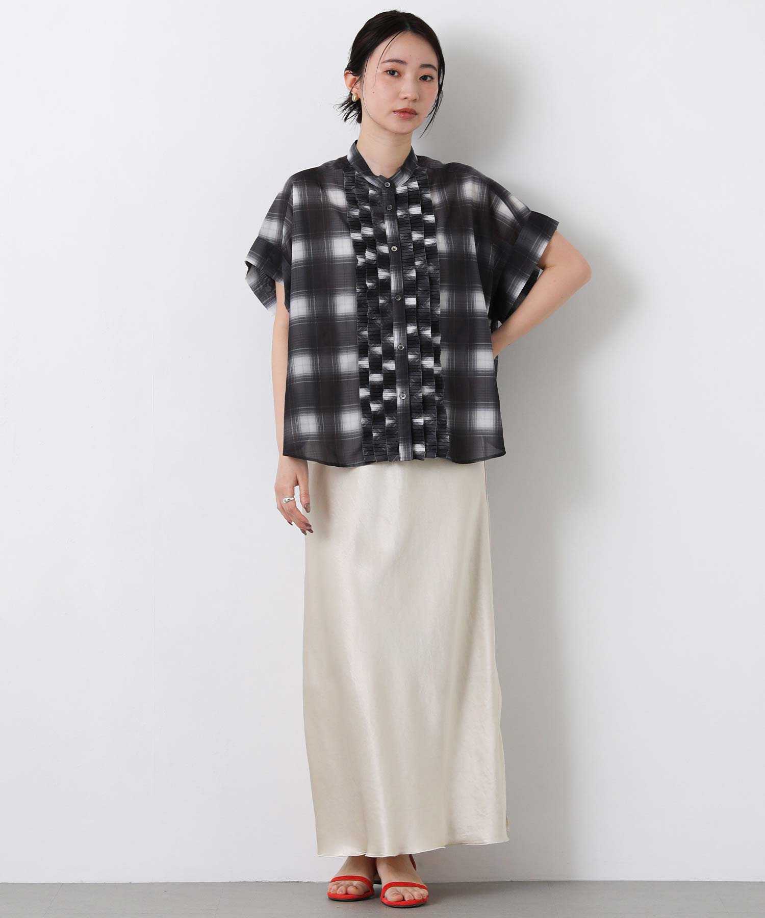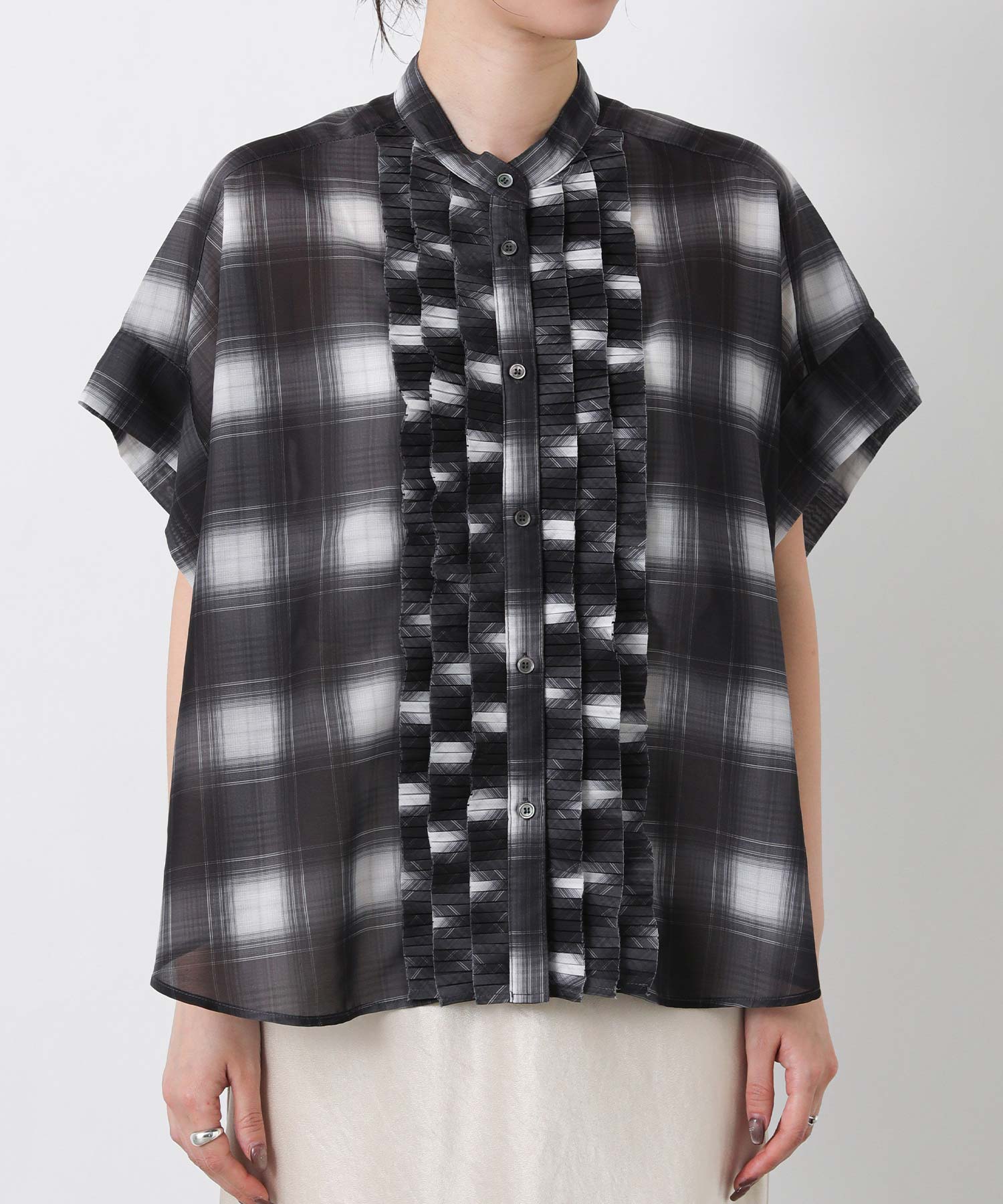 フロントのプリーツフリルが繊細で華やかな印象に。