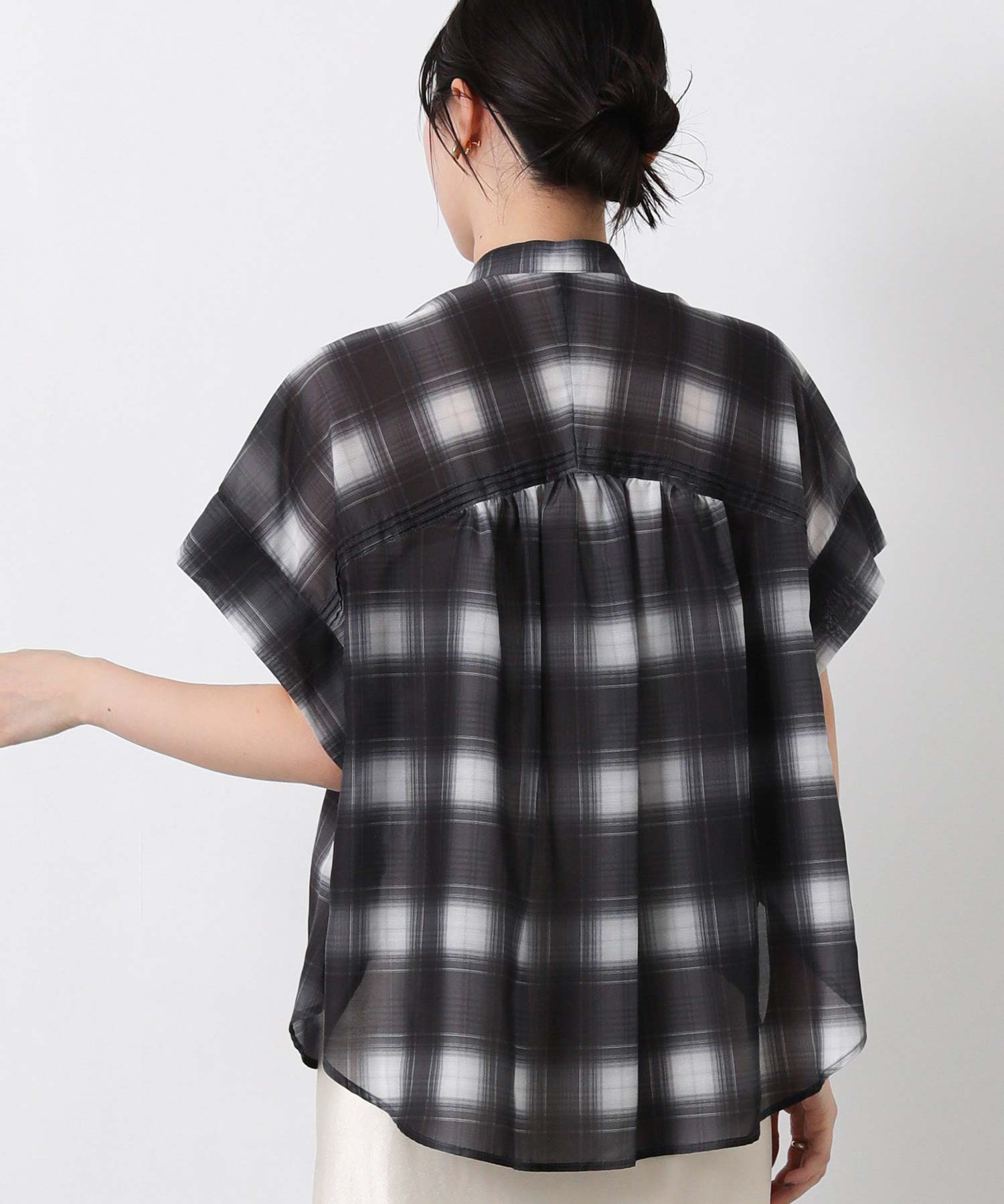1着持っておくと様々なシーンで着回しできるオンオフ兼用ブラウス。