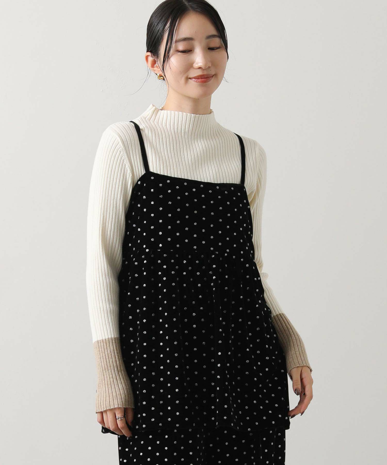 今年注目素材のベロアにラメドットのプリントを施したキャミソール。