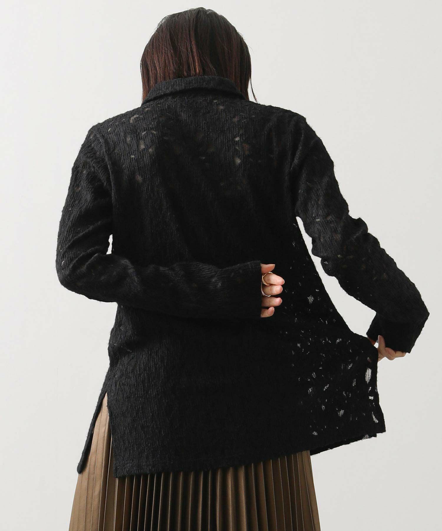 起毛したストレッチレース素材が柔らかく女性らしい印象を与え、インナーやボトム次第でさまざまなカジュアルスタイルに合わせやすいアイテム。