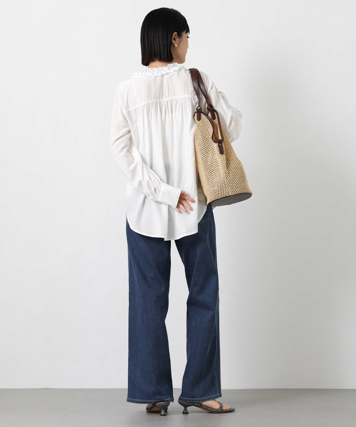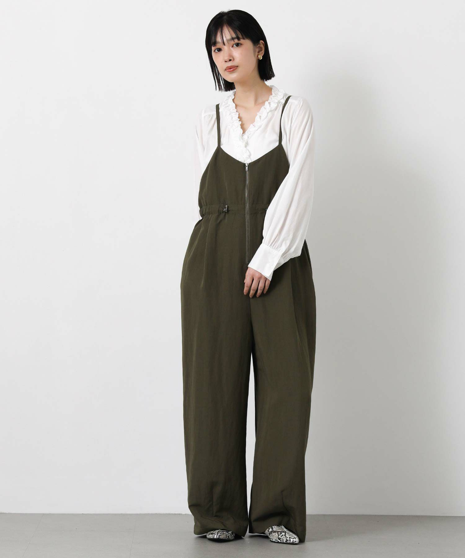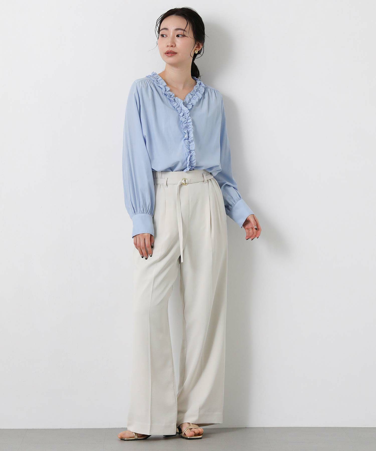 甘くなりがちなフリルも、とろみのある素材で落ち着いた雰囲気に仕上げました。