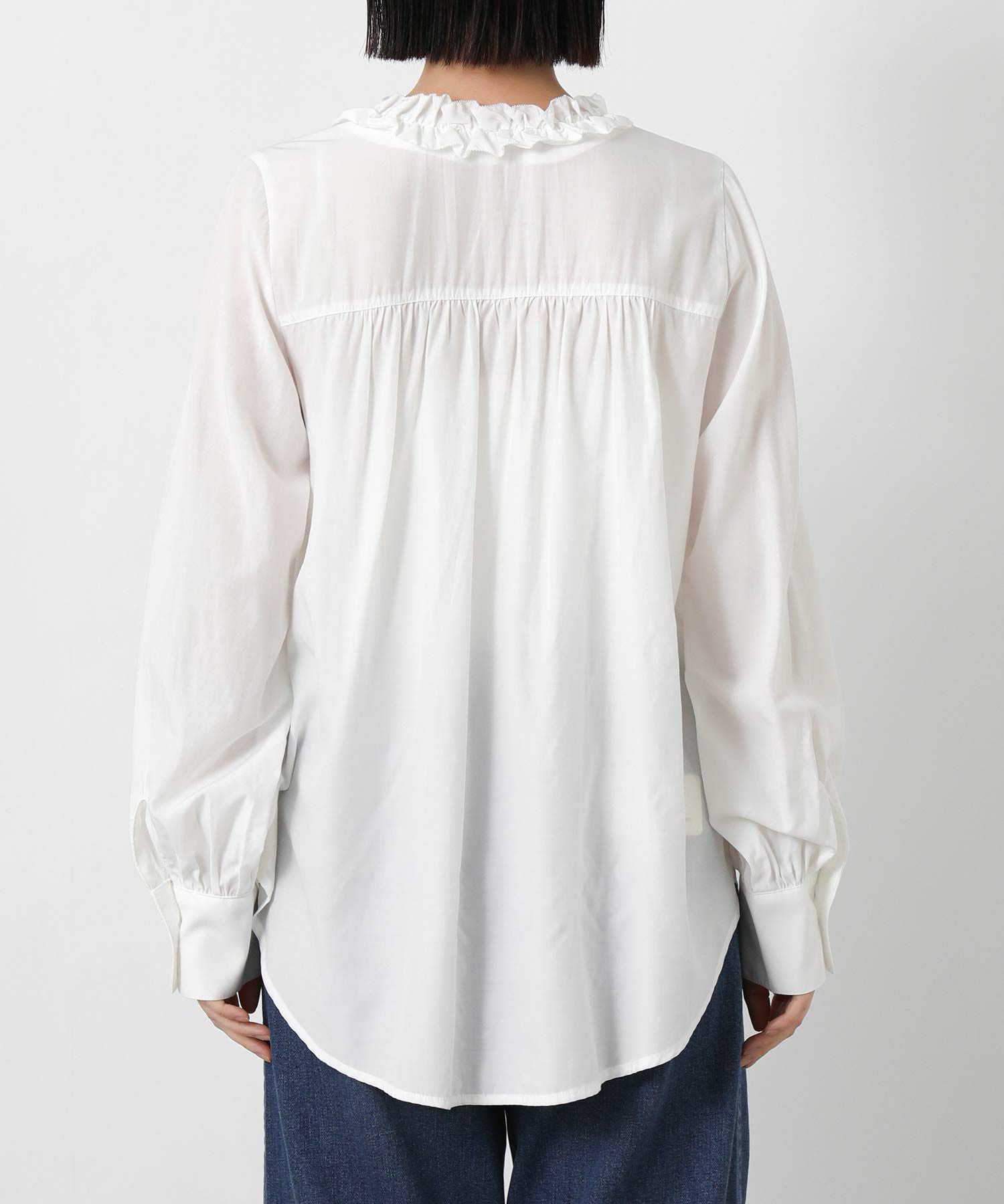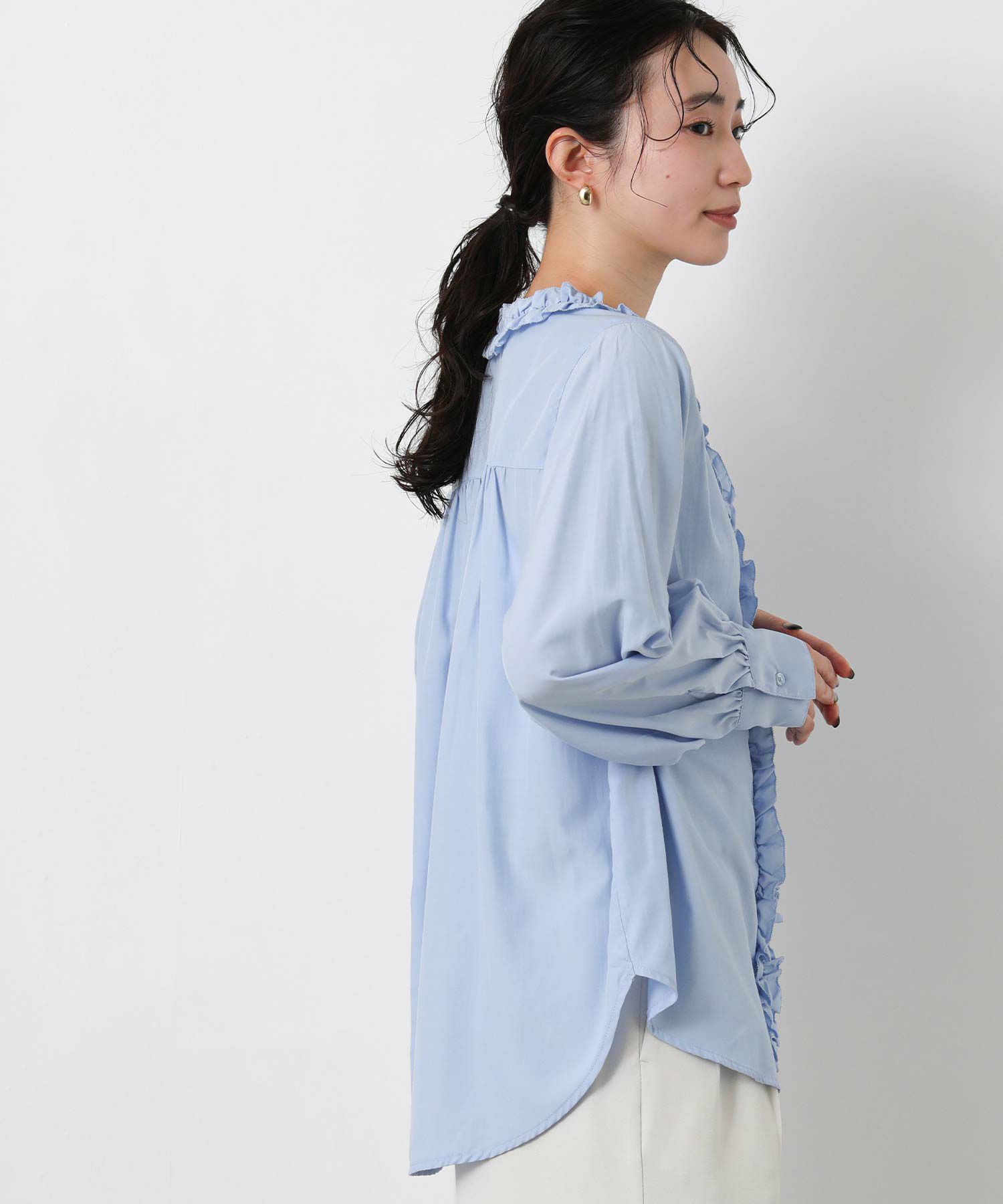ボタンを隠した比翼仕立てのデザインがフリルの存在感を際立たせます。
