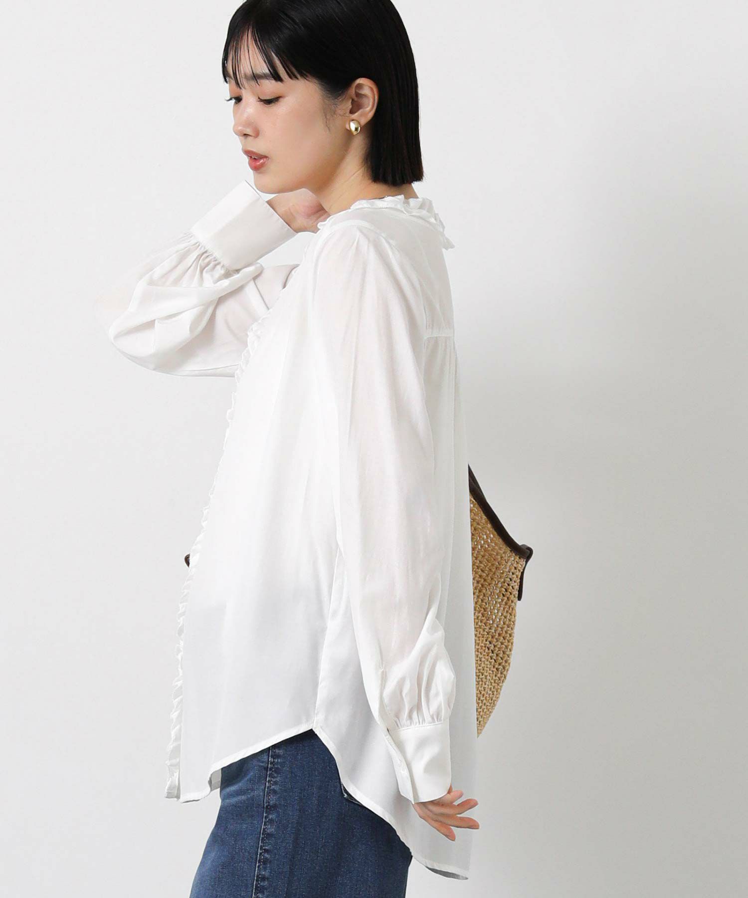 ジャケットのインナーとして、フロントのフリルを覗かせるスタイリングも華やかです。
