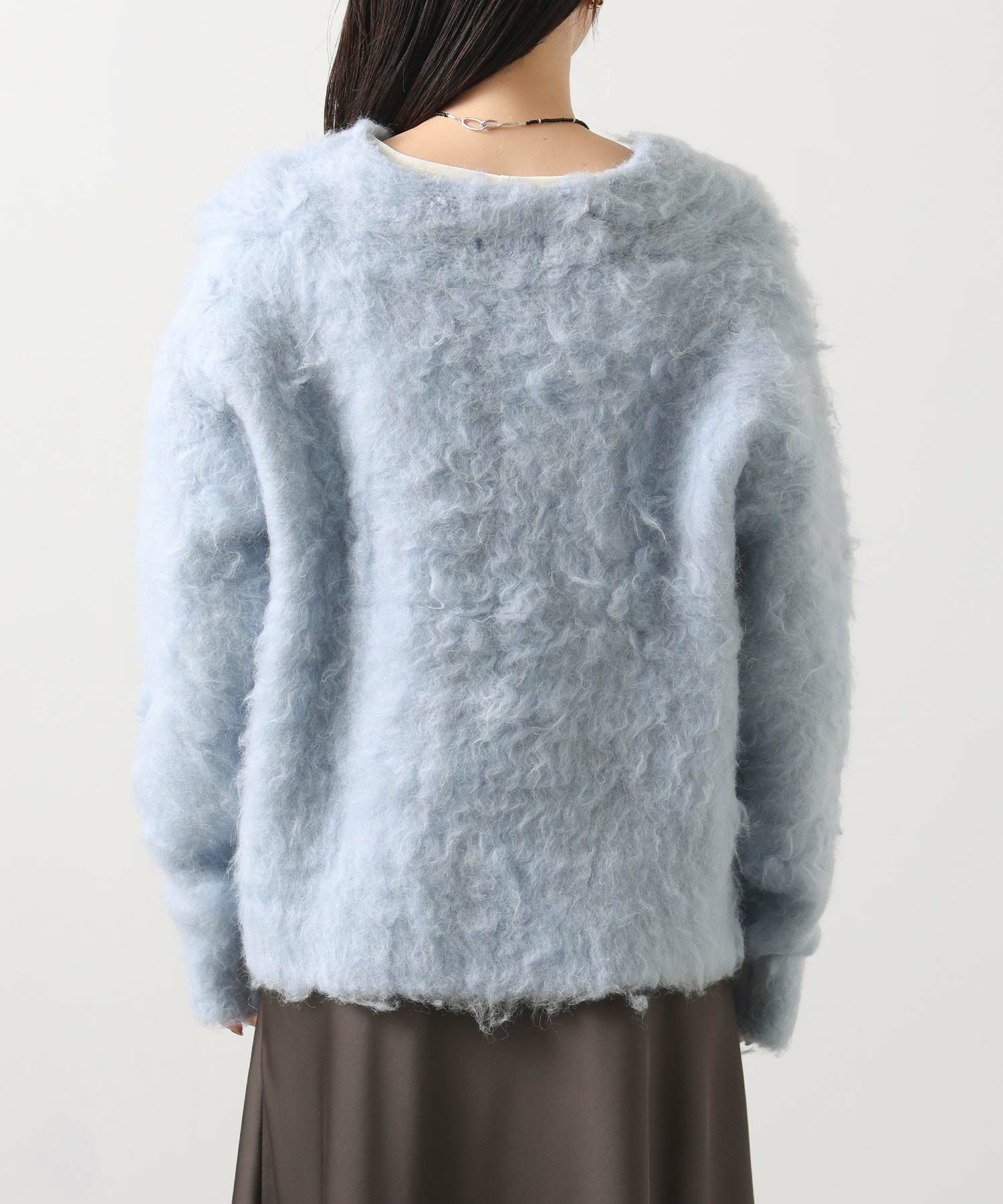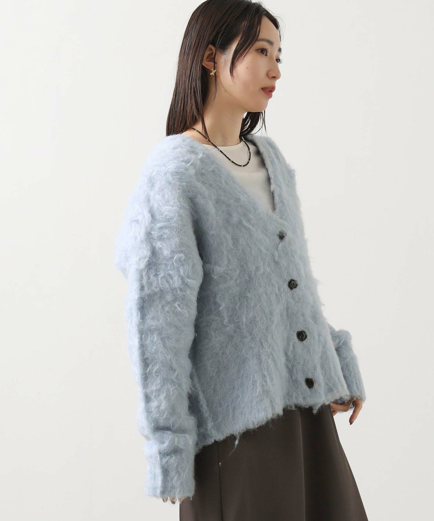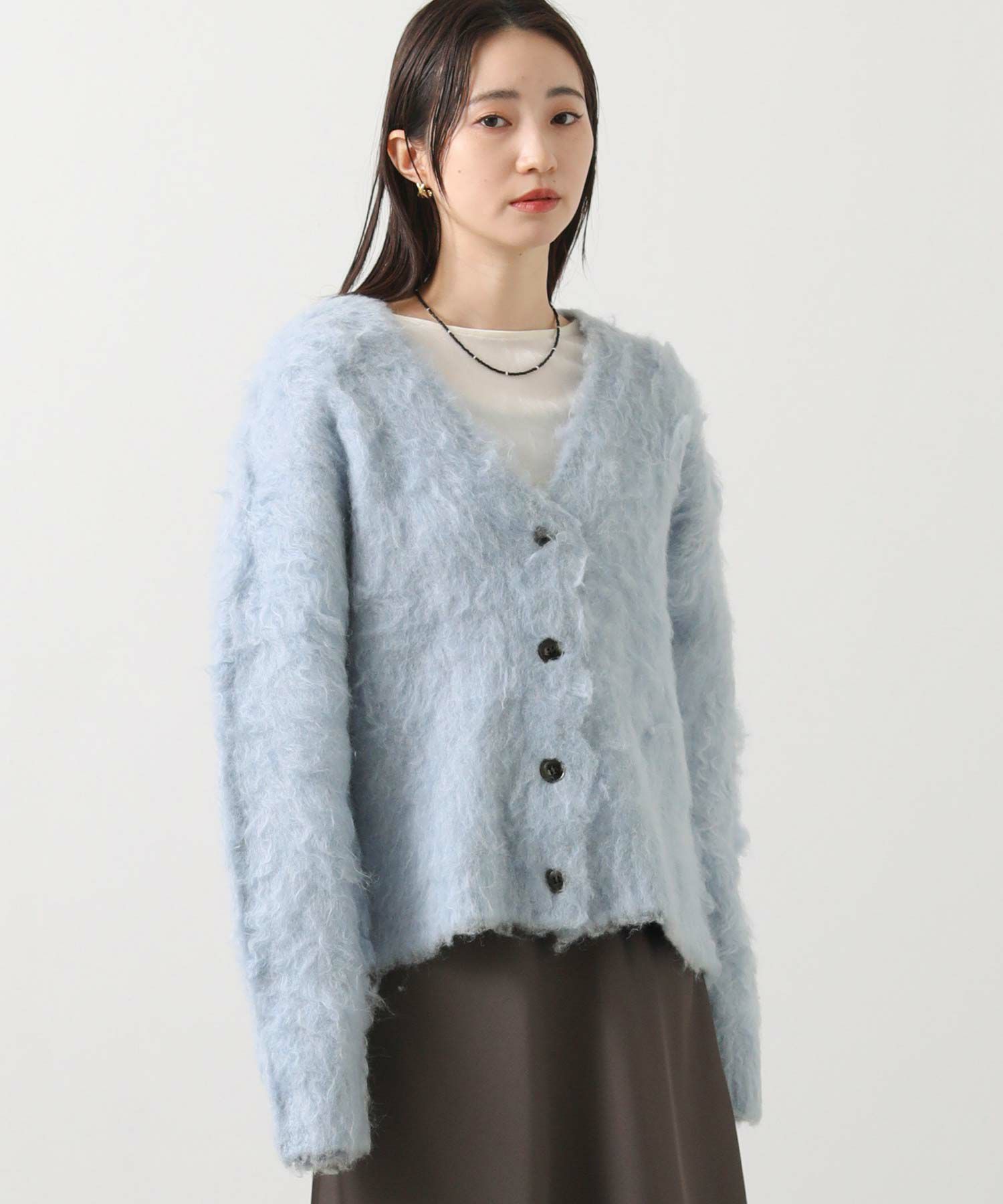思わず触りたくなるふわふわの毛足の起毛加工カーディガン。