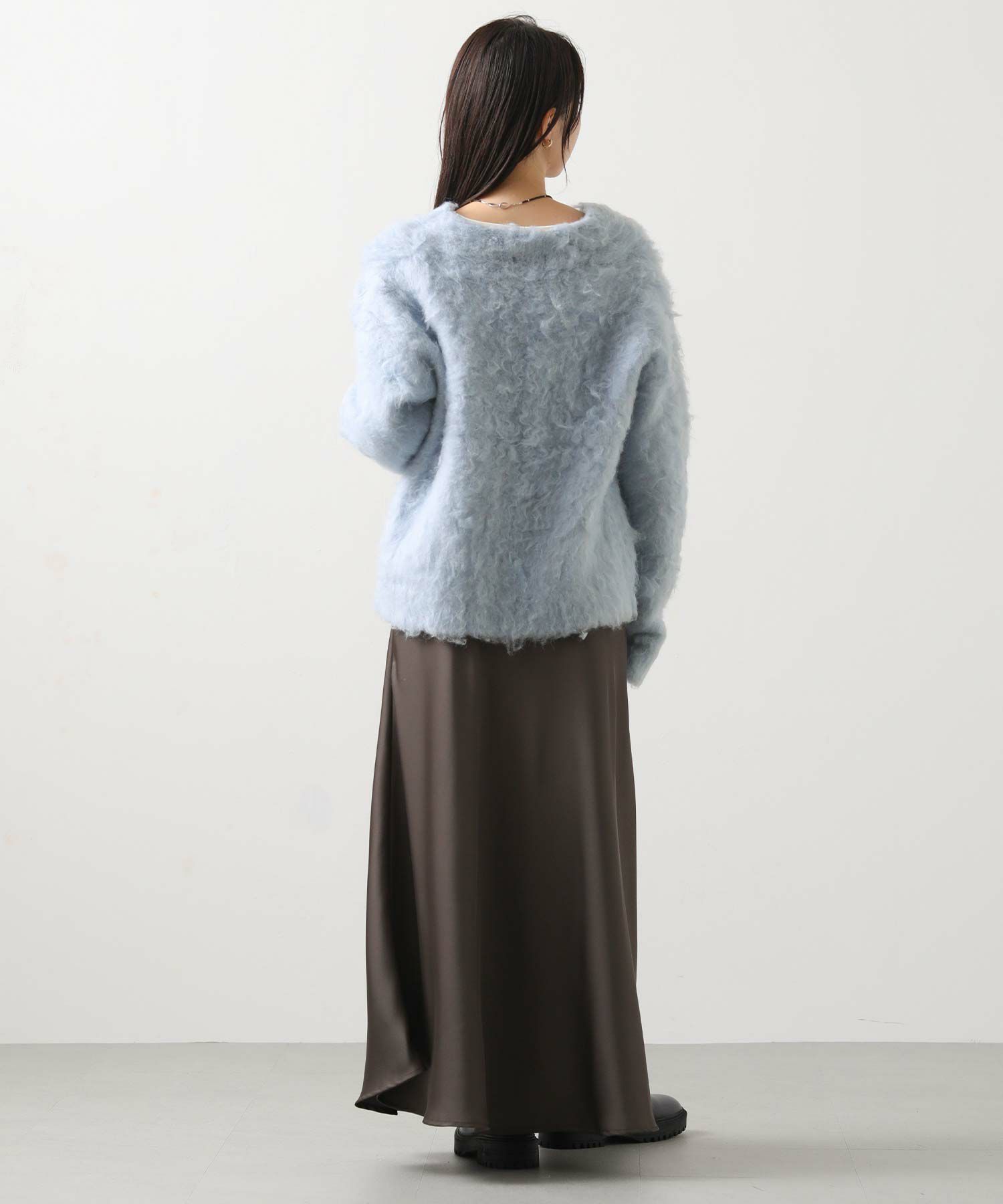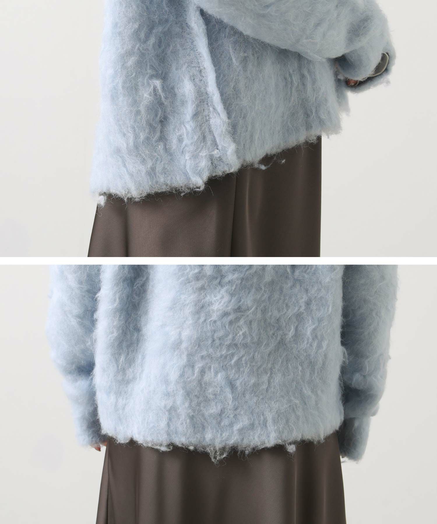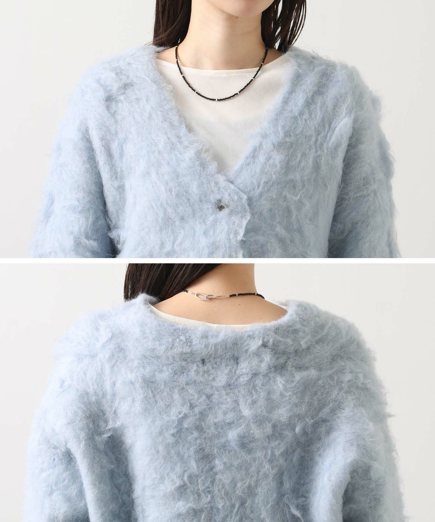 思わず触りたくなるふわふわの毛足の起毛加工カーディガン。