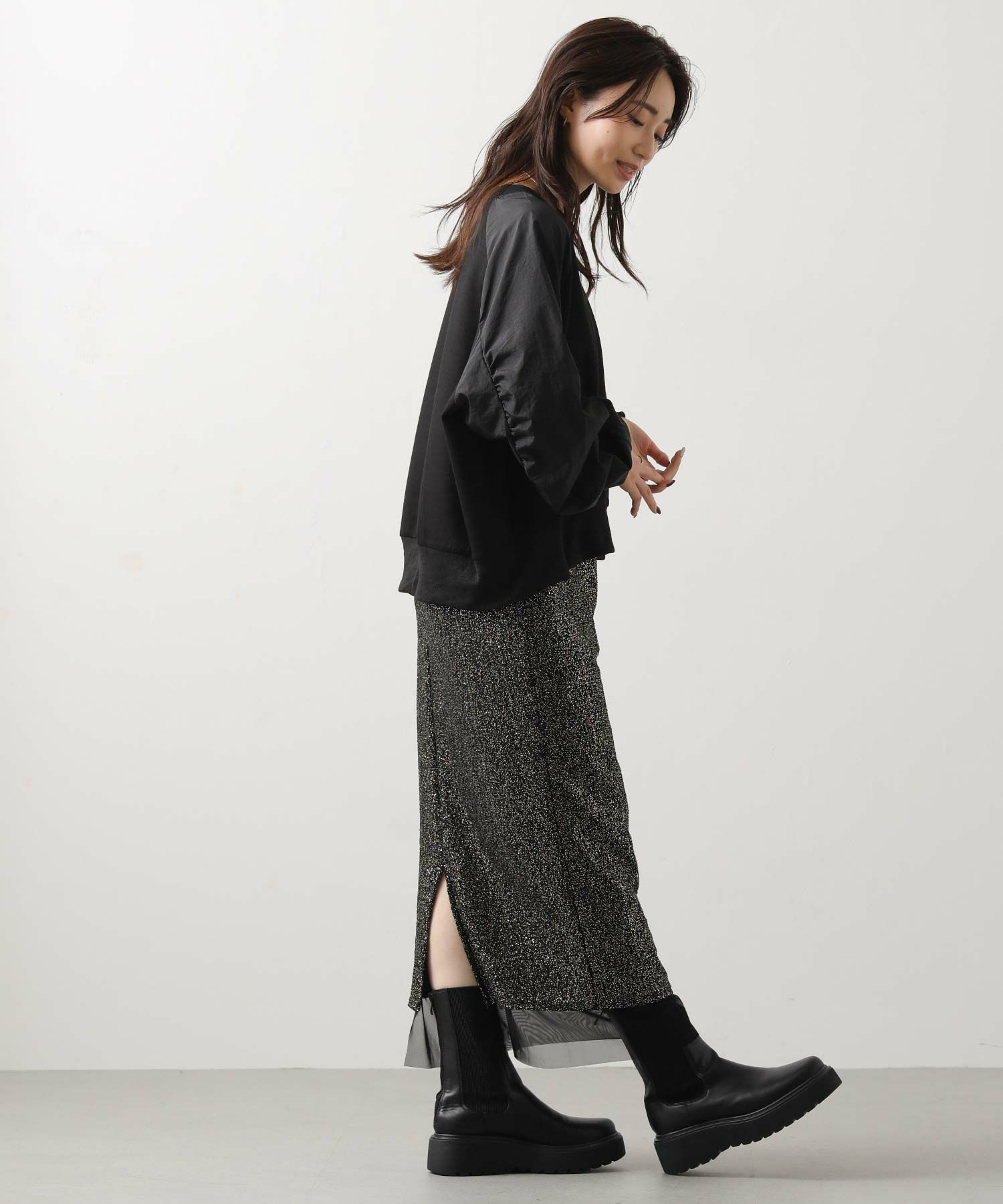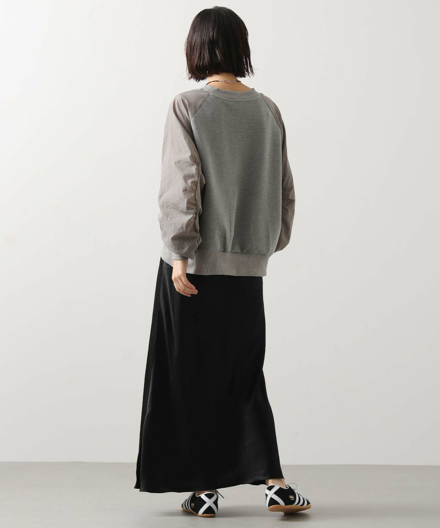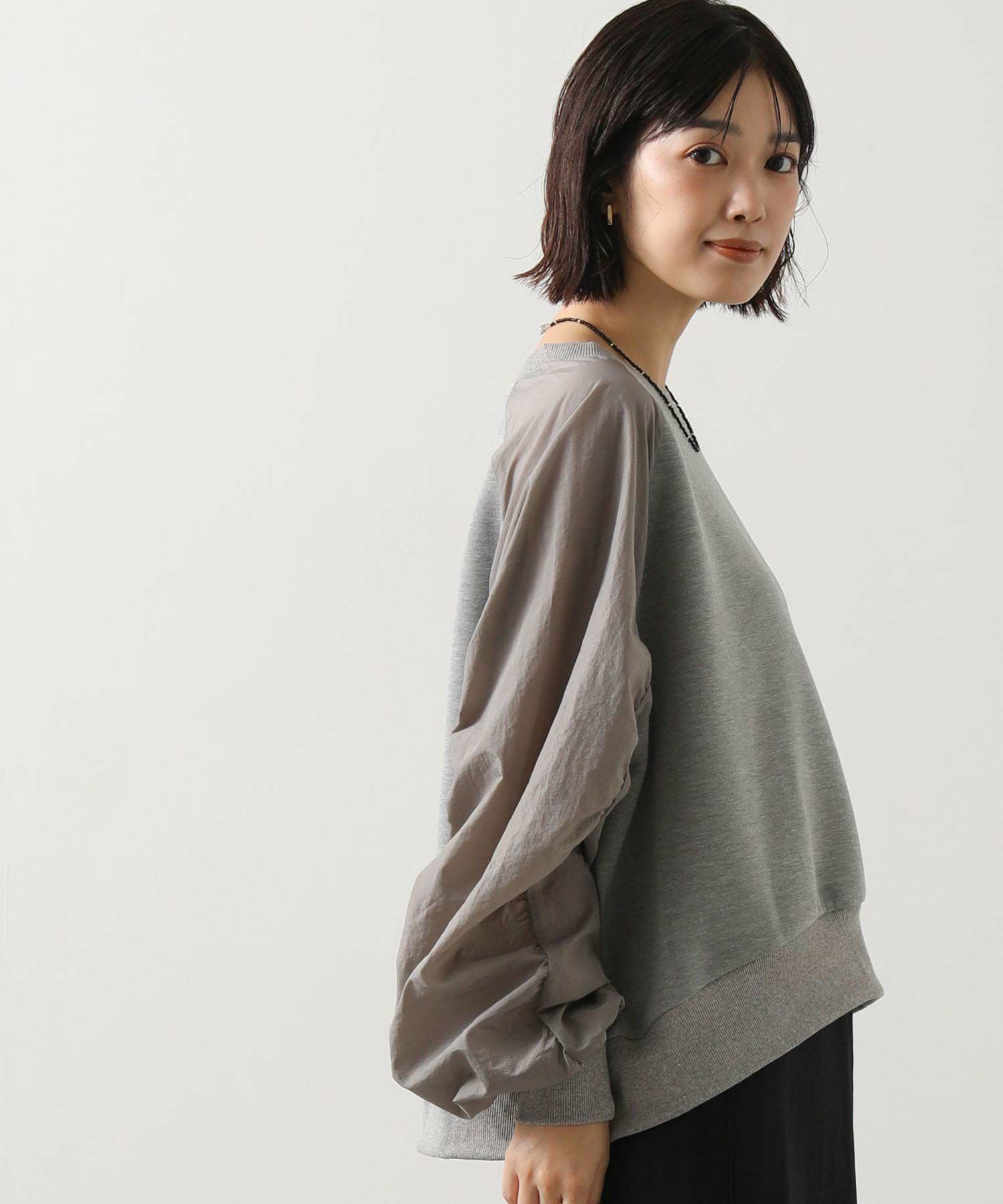 スウェット感覚でデイリーに使えながらも、異素材の組み合わせがカジュアルすぎず、大人の上品さを演出してくれます。