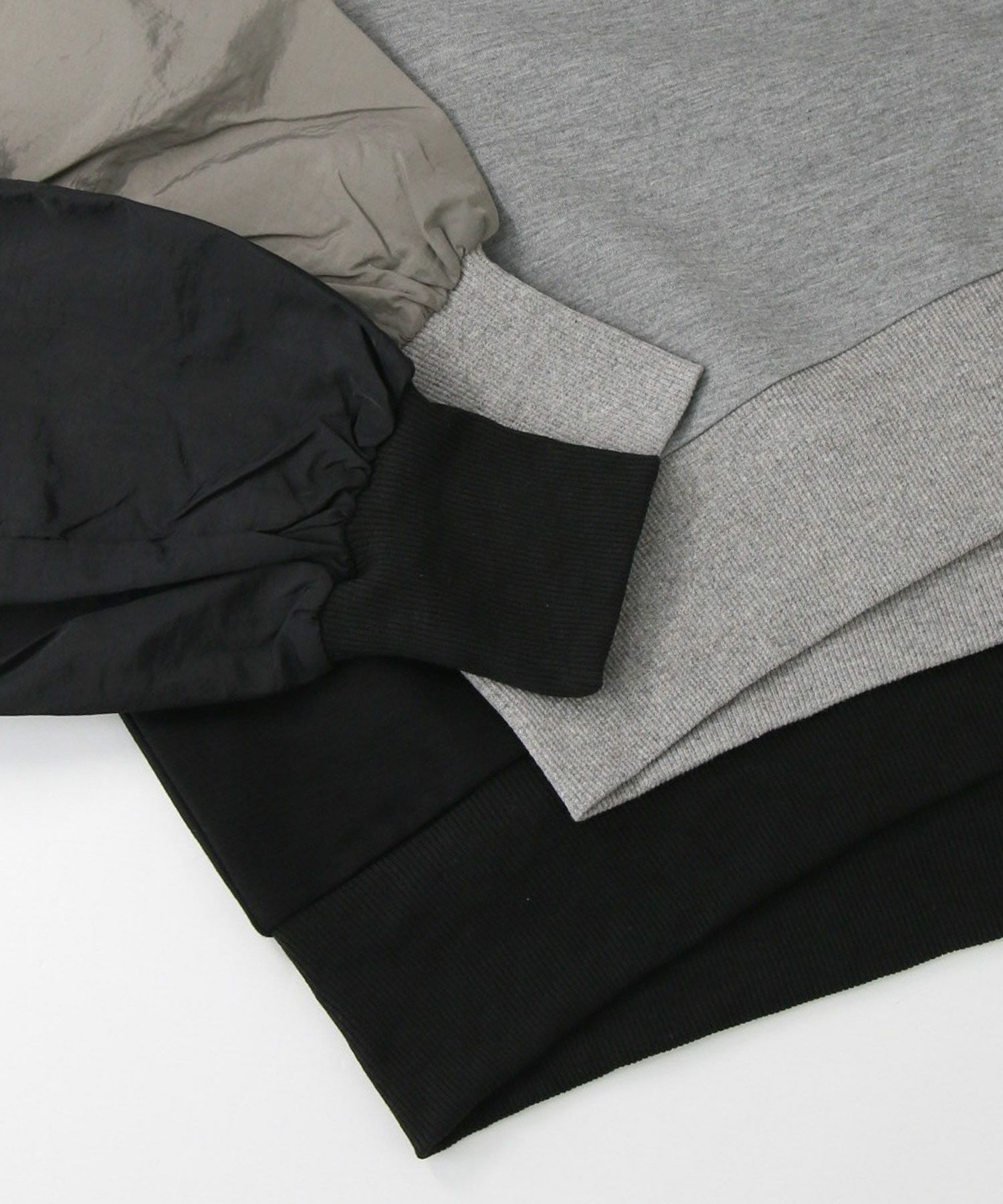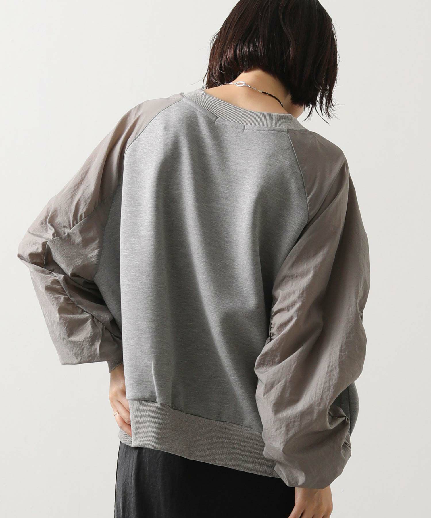 ナイロンワッシャーのほどよいハリ感と、柔らかなカットソー素材を組み合わせたドッキングトップス。