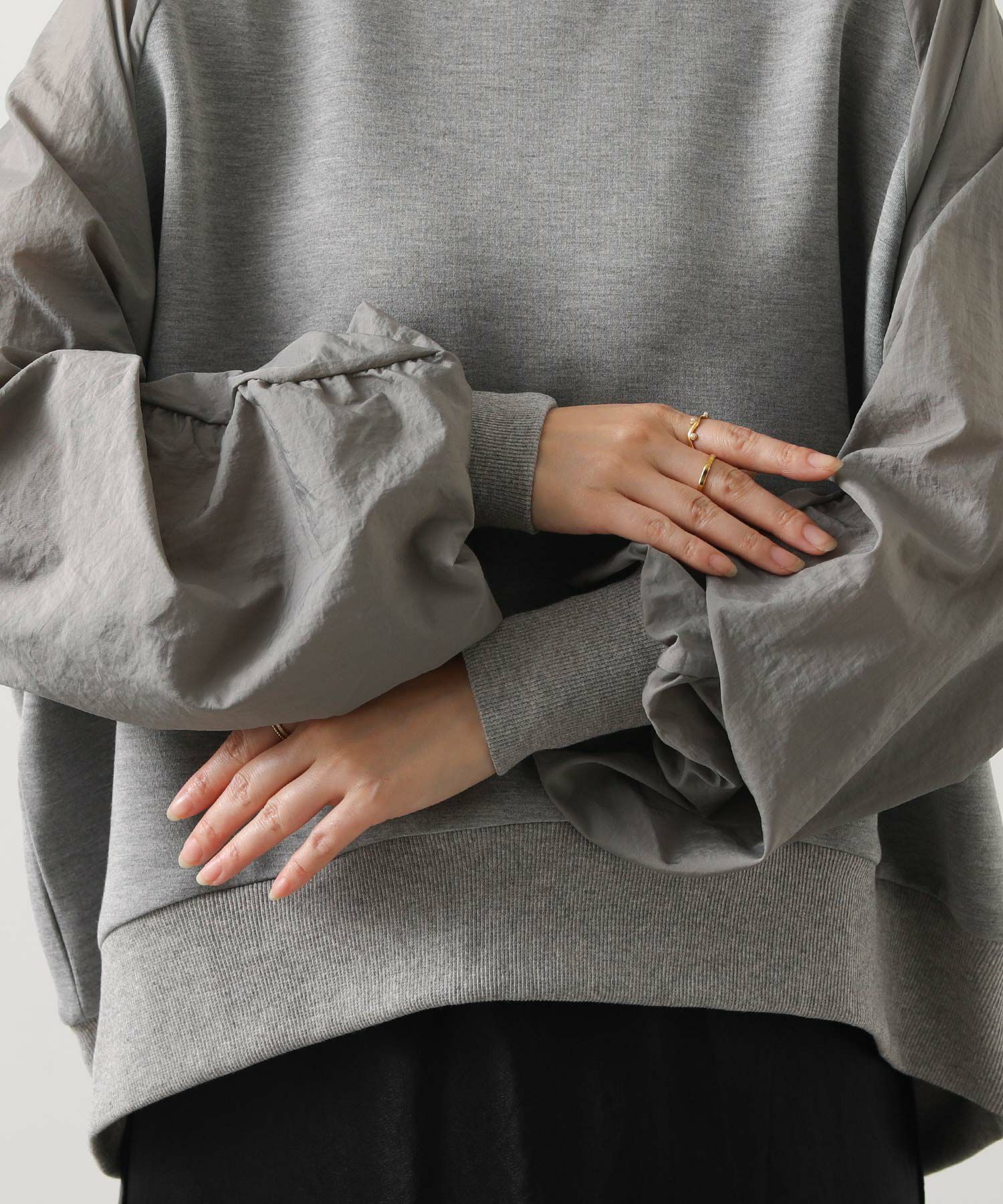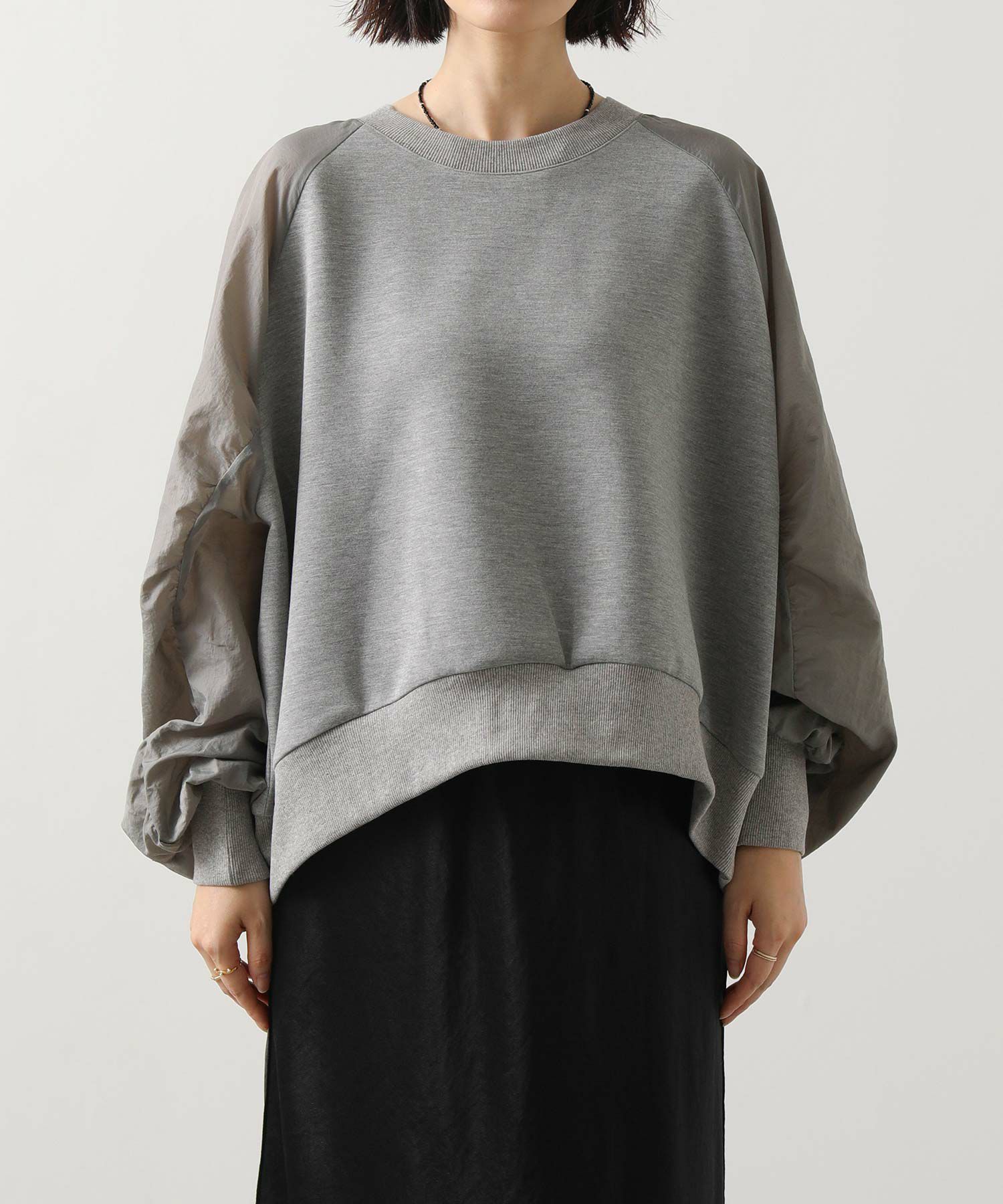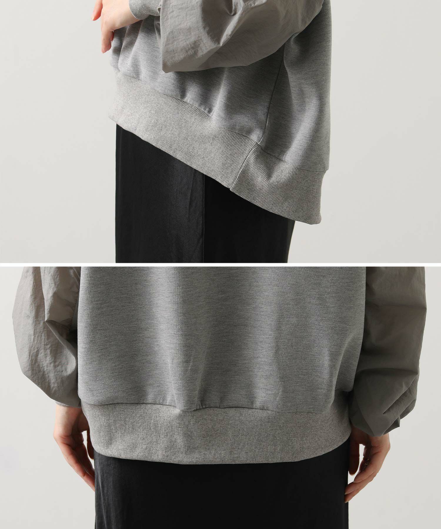 ナイロンワッシャーのほどよいハリ感と、柔らかなカットソー素材を組み合わせたドッキングトップス。