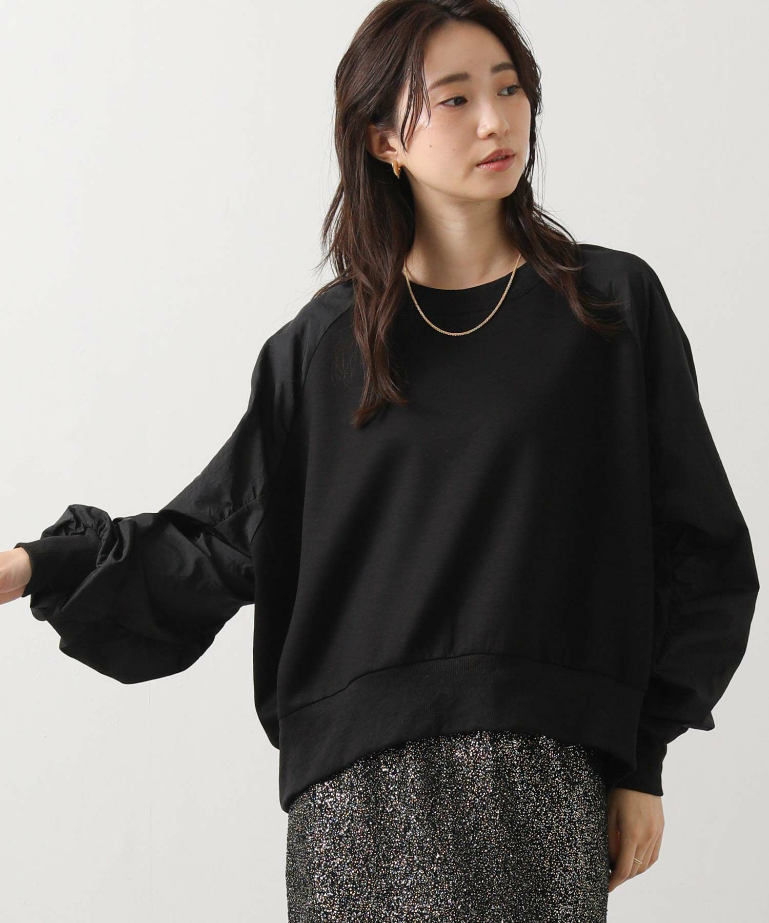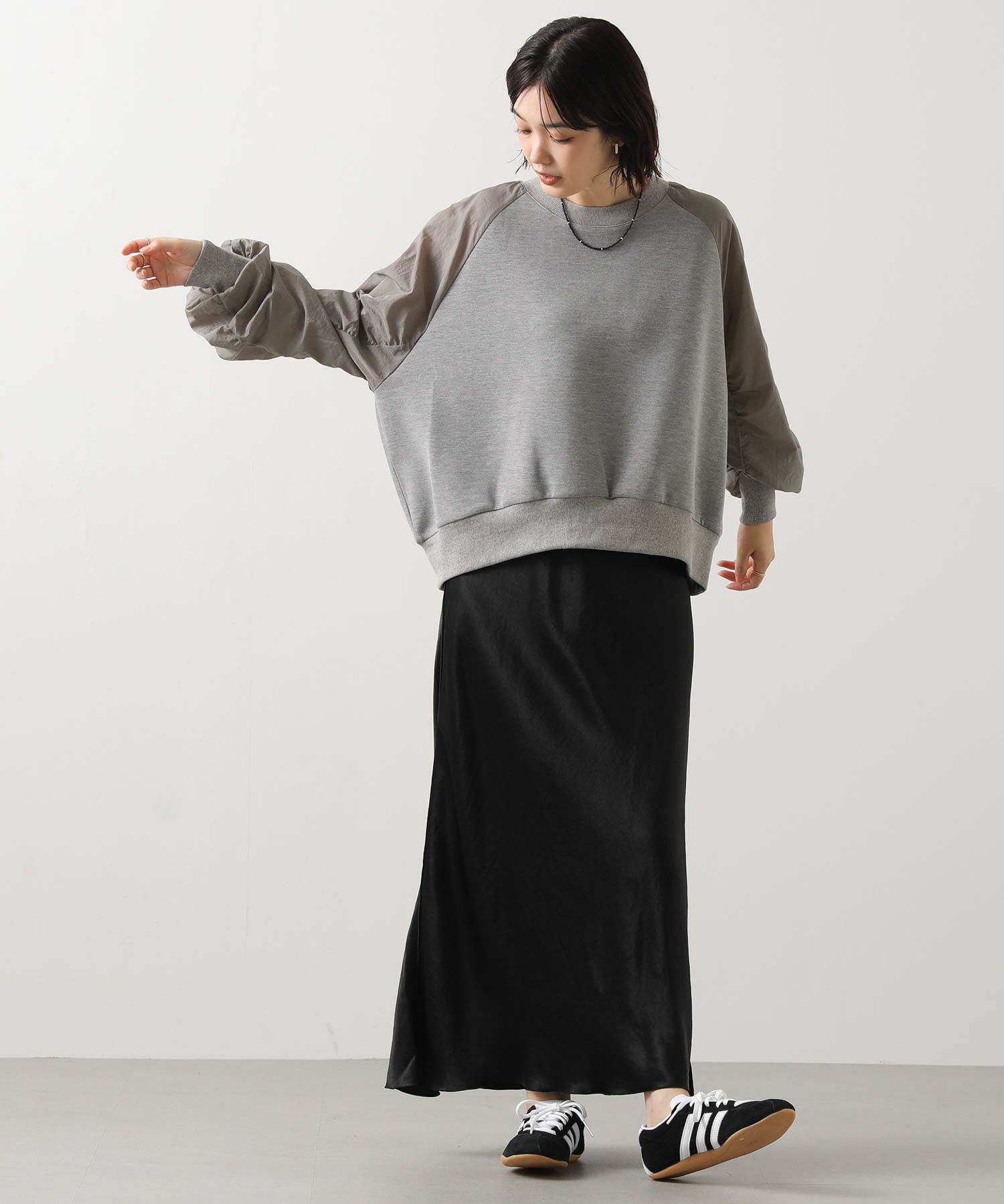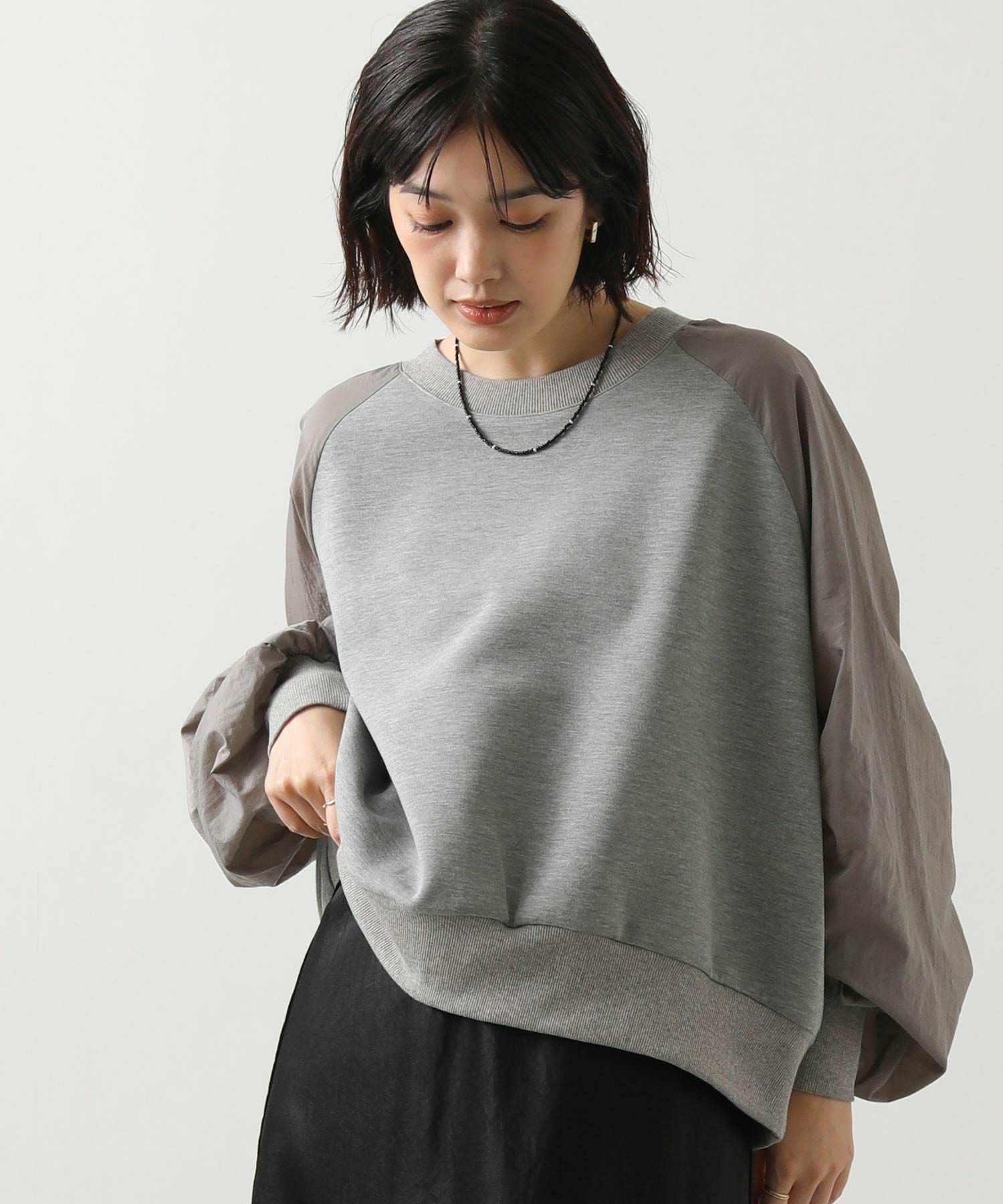 スウェット感覚でデイリーに使えながらも、異素材の組み合わせがカジュアルすぎず、大人の上品さを演出してくれます。
