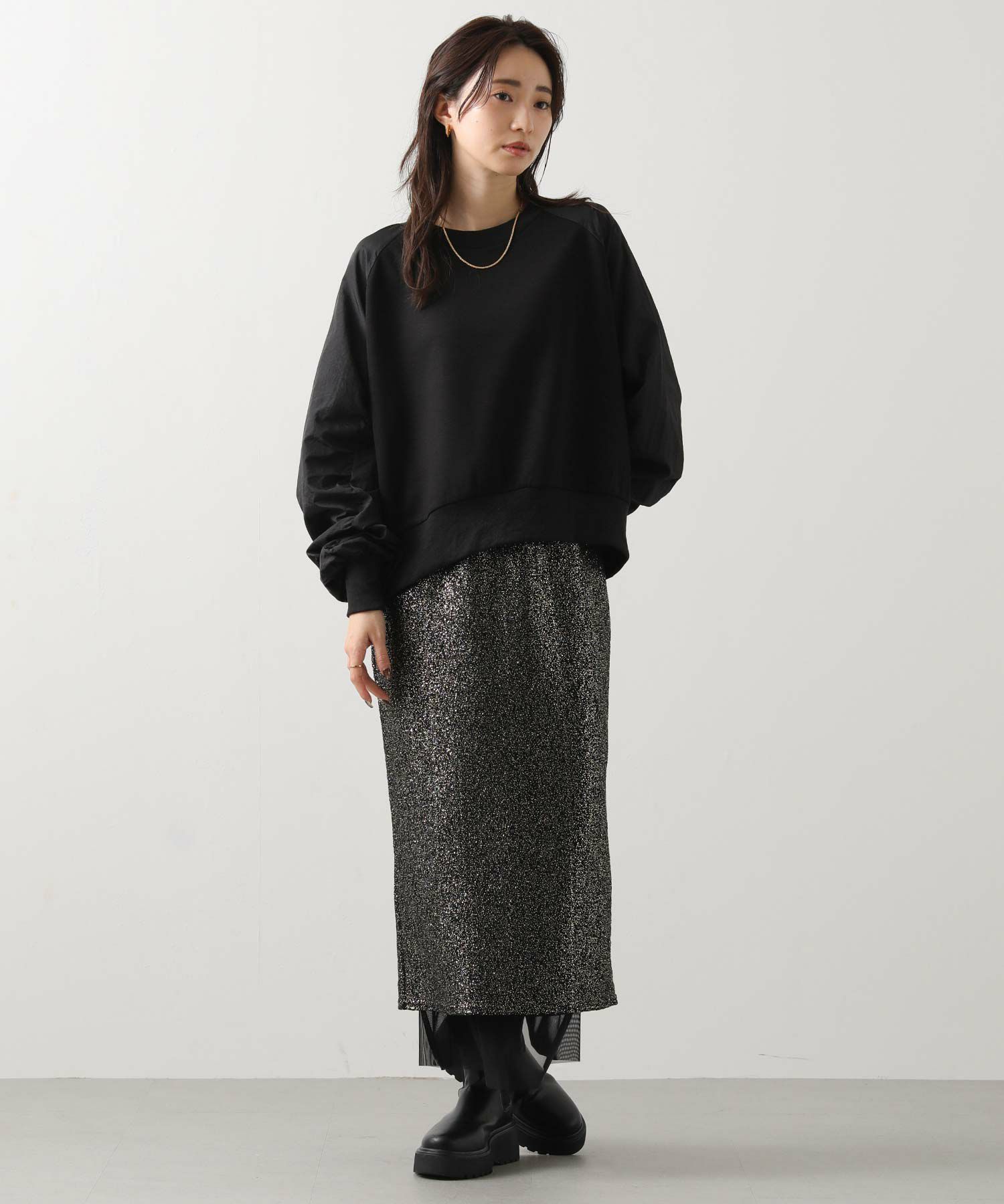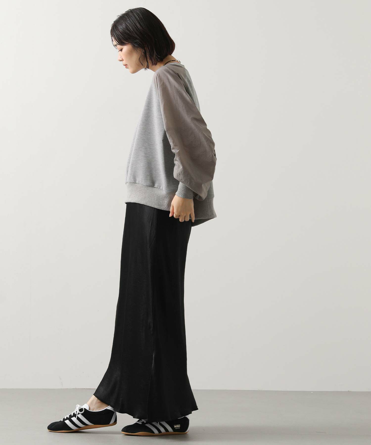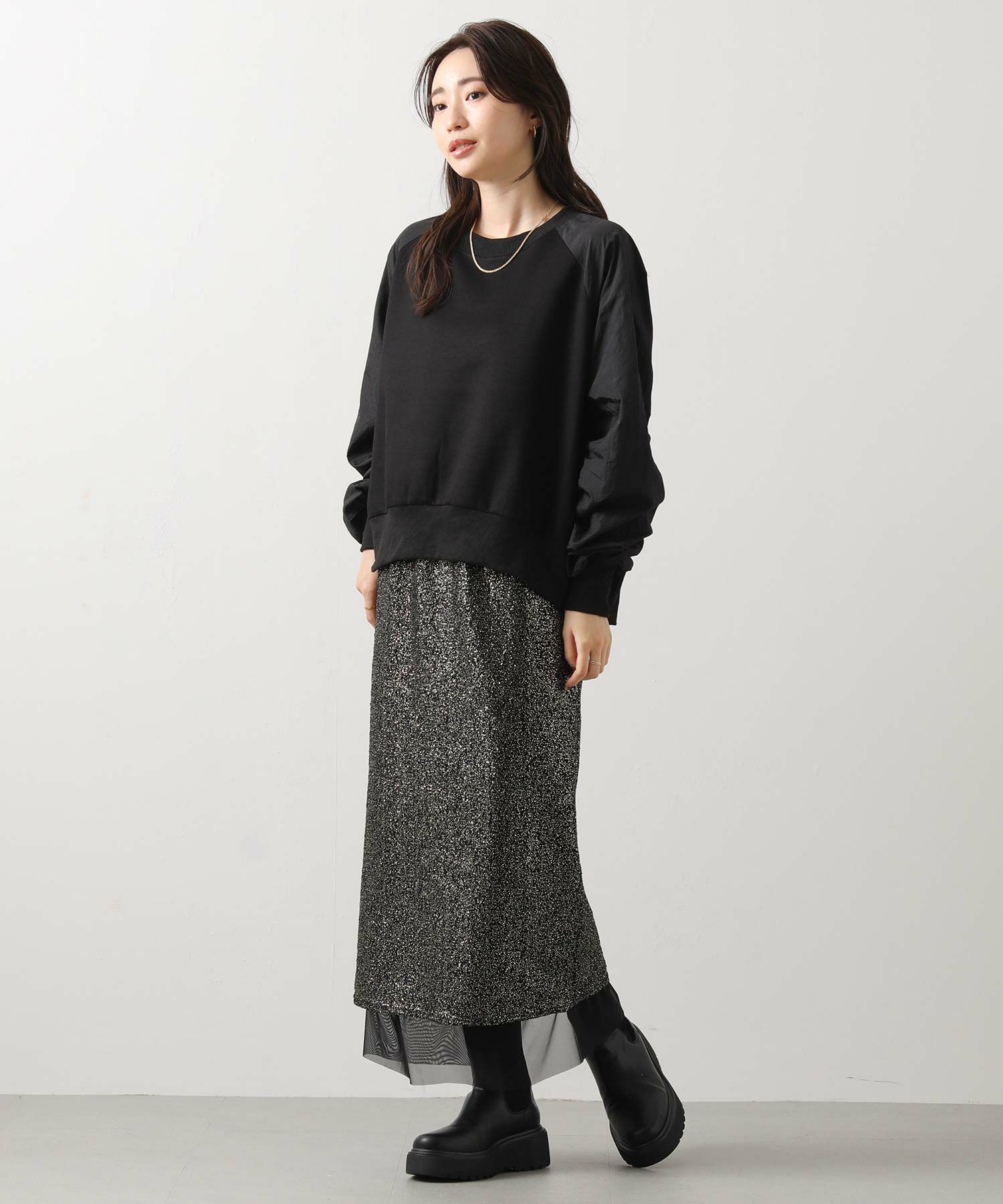 スウェット感覚でデイリーに使えながらも、異素材の組み合わせがカジュアルすぎず、大人の上品さを演出してくれます。