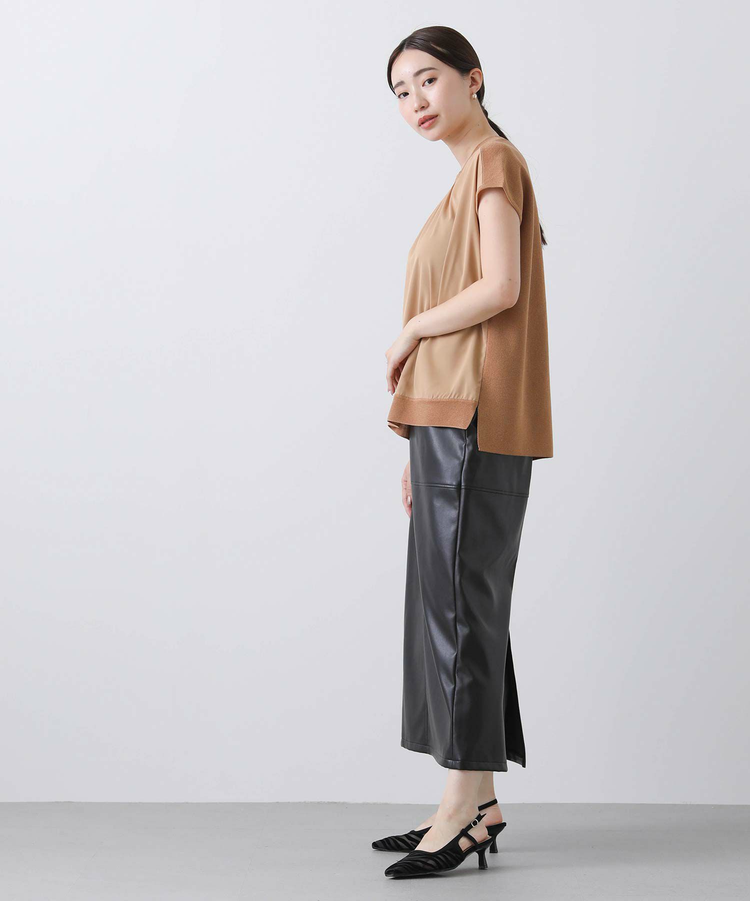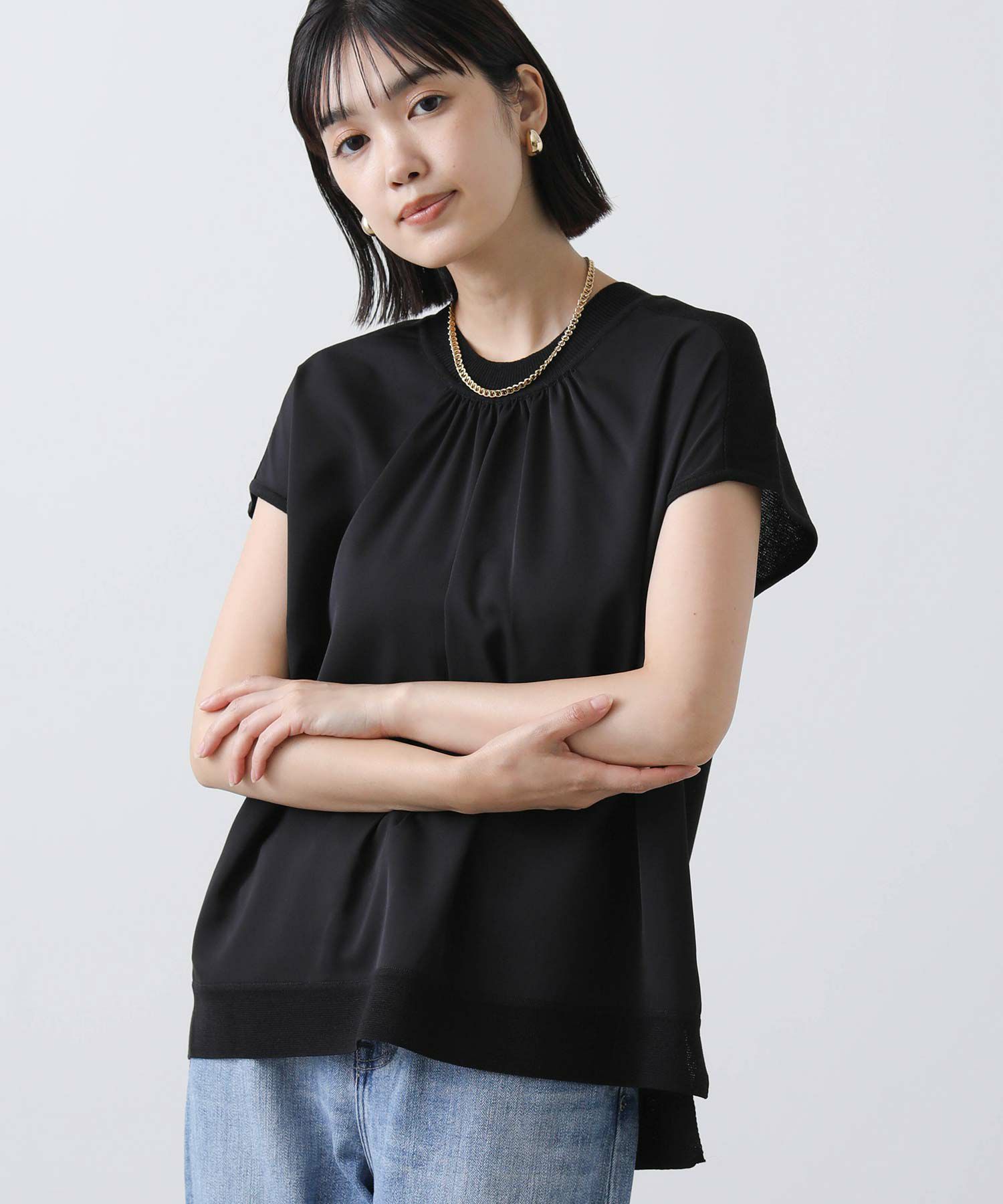 ジョーゼット生地とニットを組み合わせたフレンチスリーブプルオーバー。
