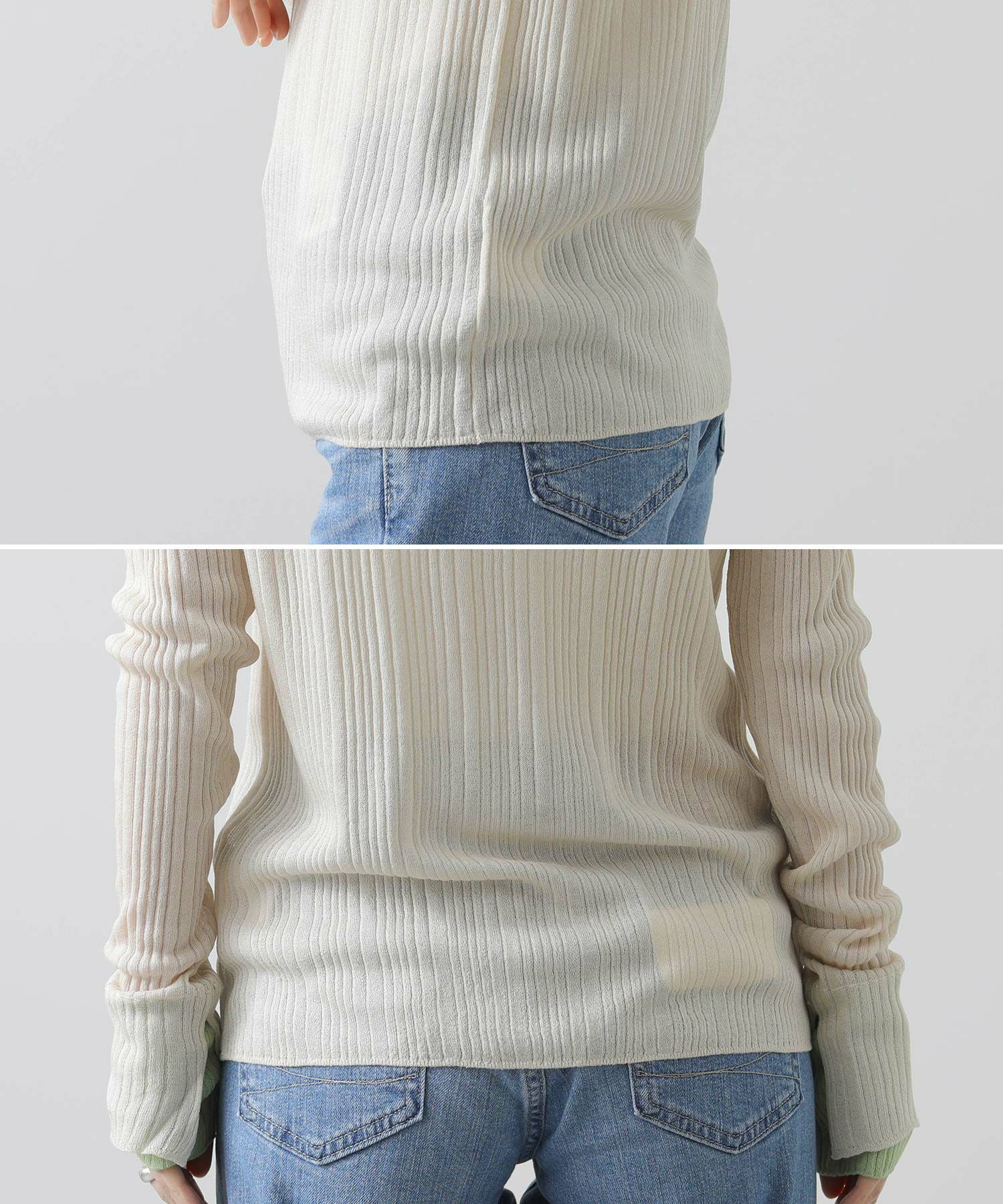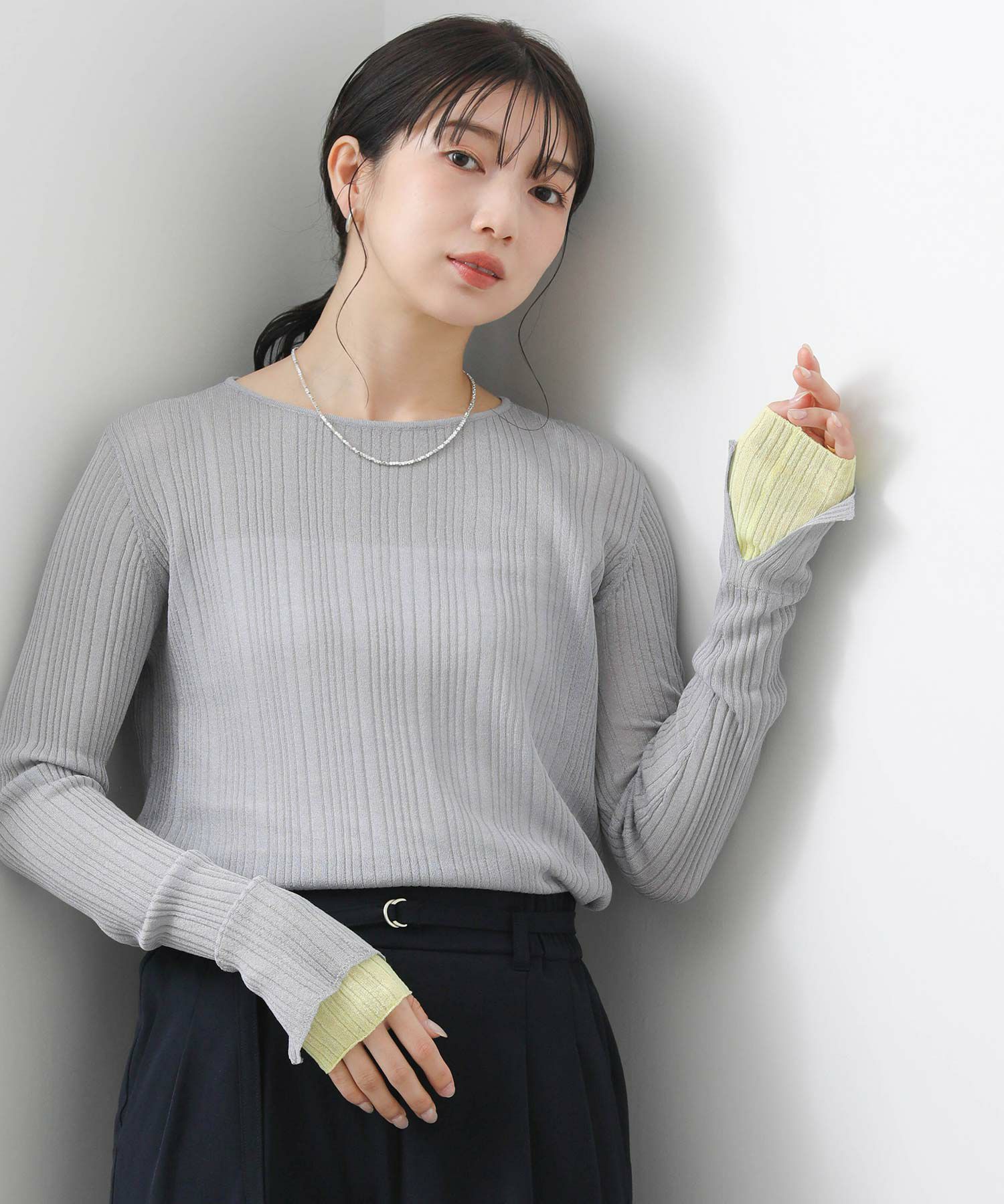 袖口の配色切り替えがポイントです。ピタピタしすぎないサイズ感で、ベーシックなトップスとして編地の凹凸や程よい透け感を楽しんでいただけます。