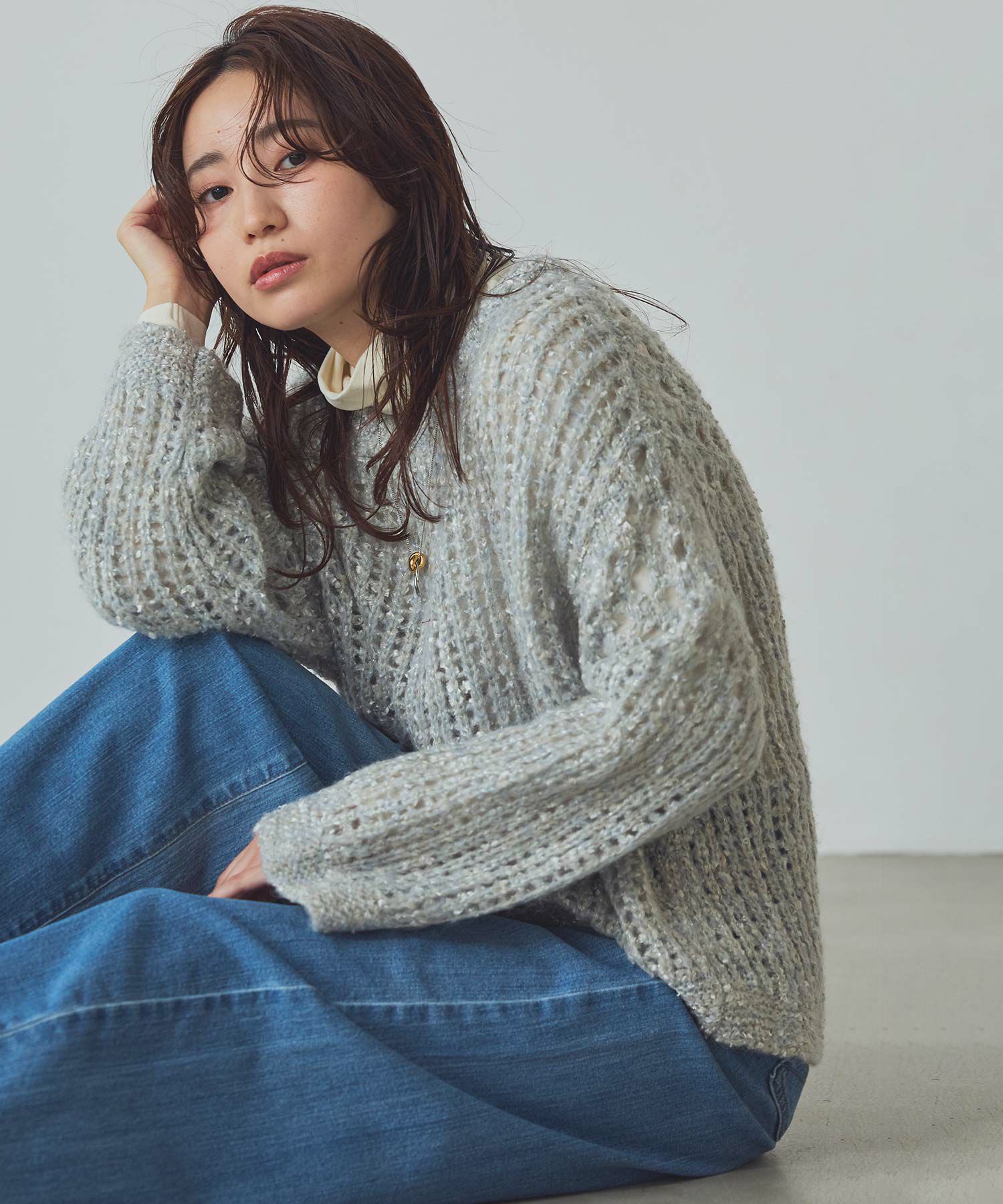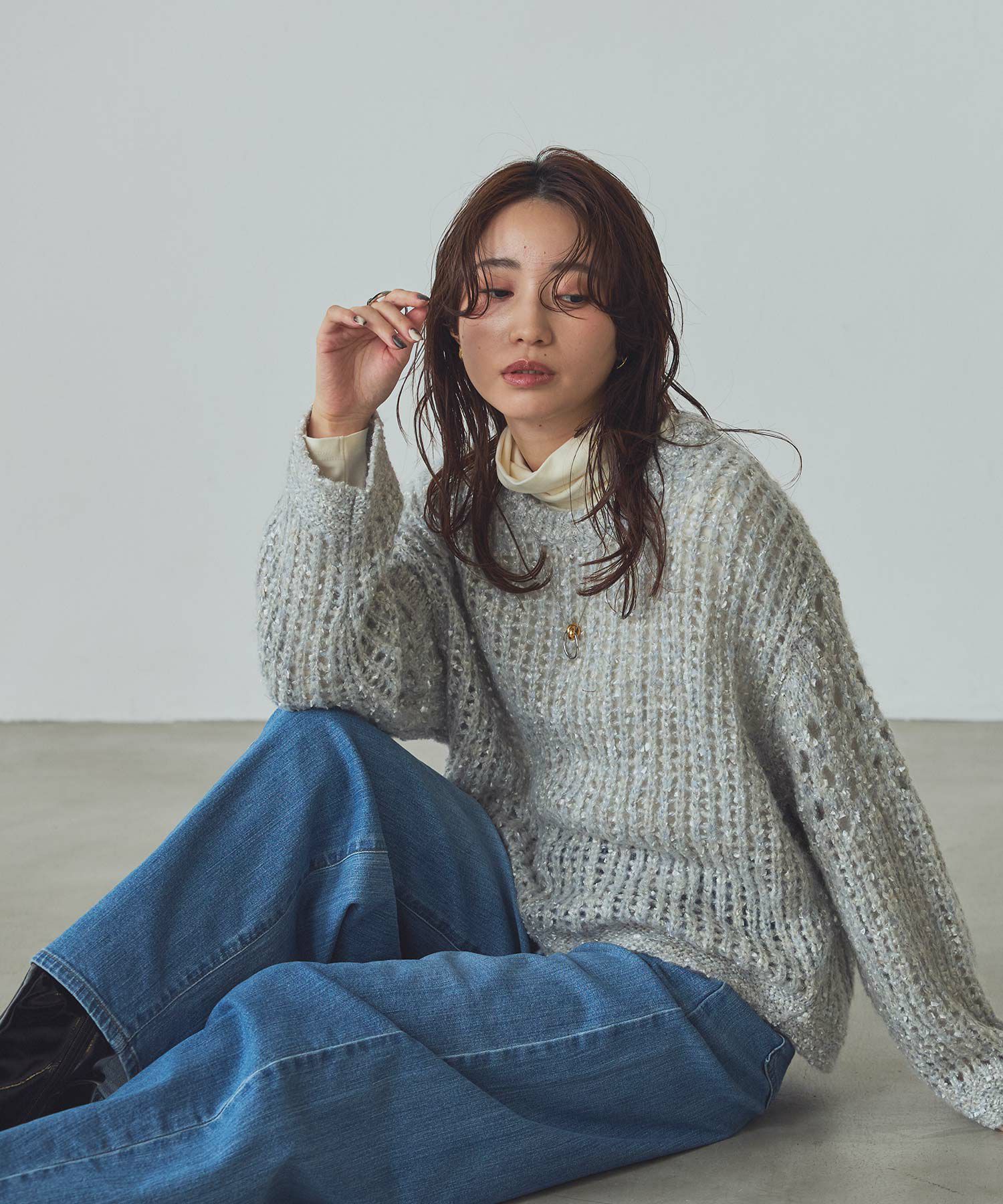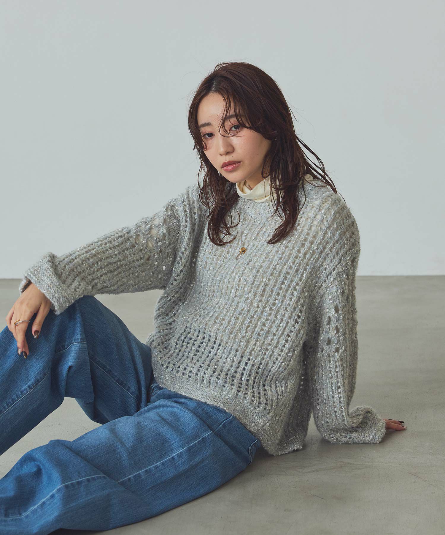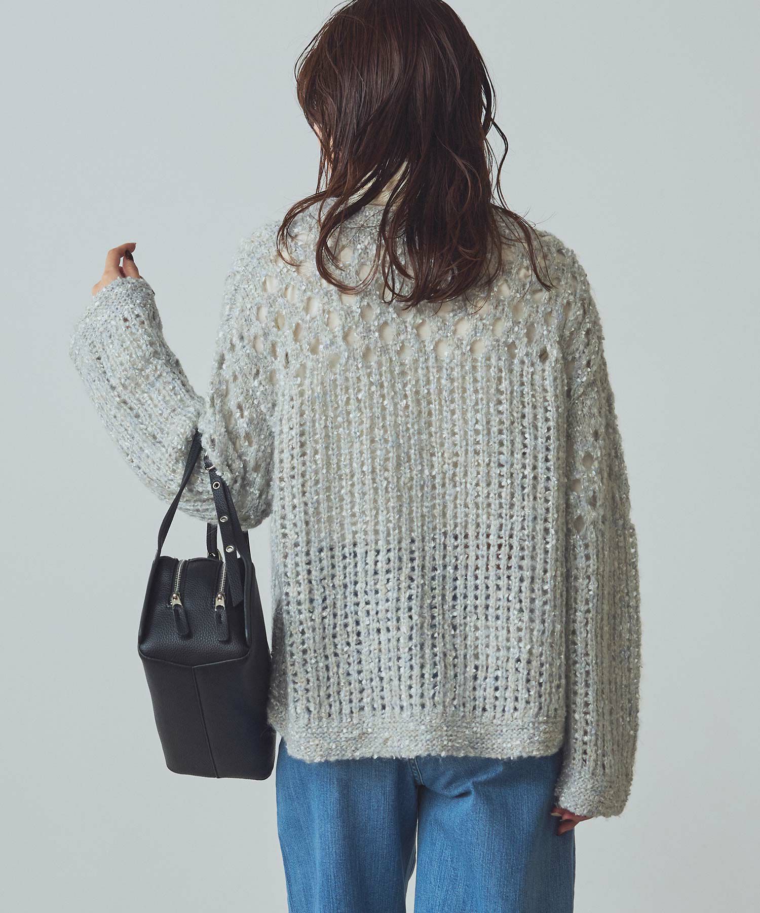 透け感のある編地が重くなりがちな秋冬コーデに抜け感を演出してくれます。