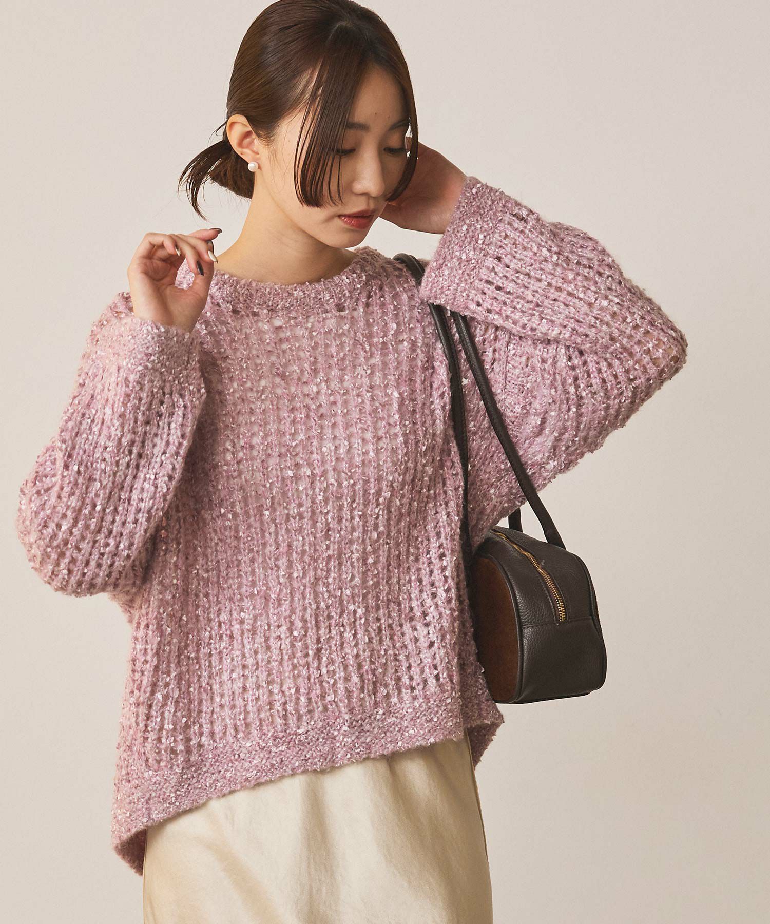 表情豊かなフラッグヤーンとふんわりしたモヘヤに上品に光るラメが目をひくニットプルオーバー。