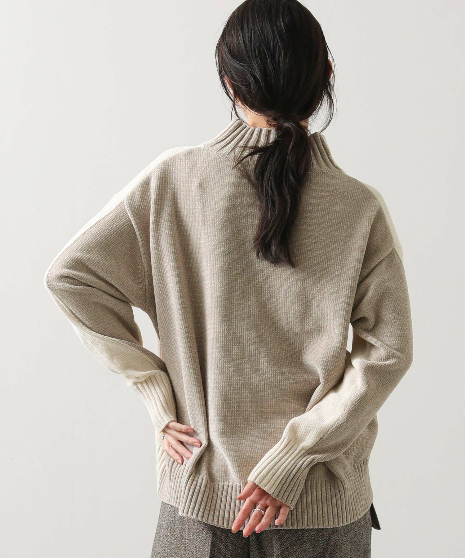 前後のバイカラーが目を惹くハイネックニット。