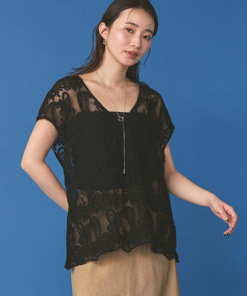 柔らかく繊細なチュール生地にリーフ柄の刺繍が施された生地を使用した、フレンチスリーブのプルオーバー。