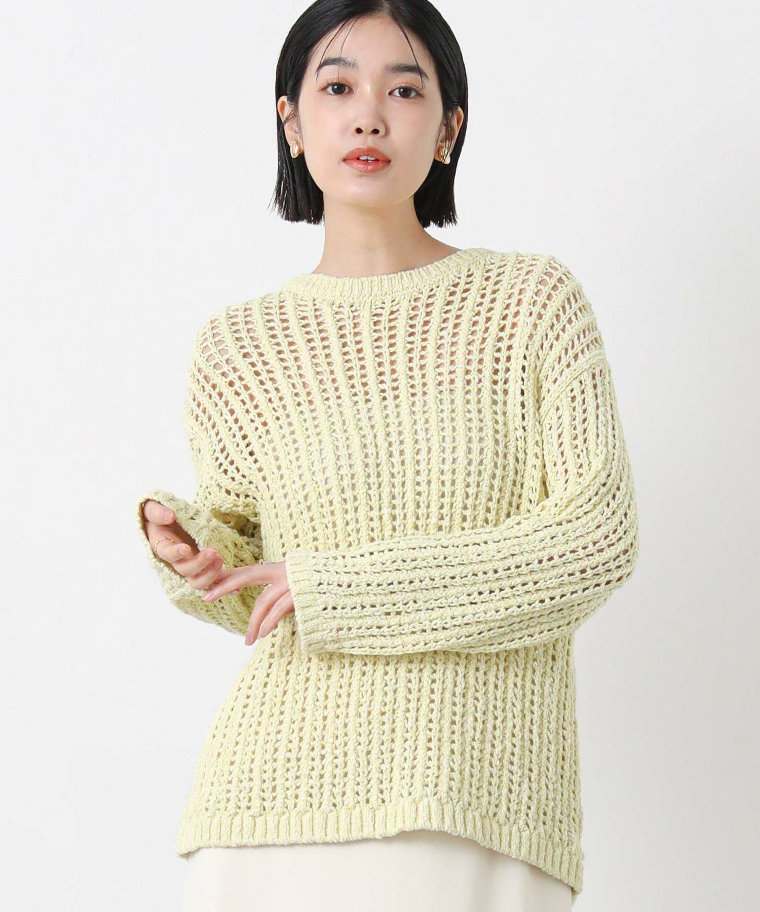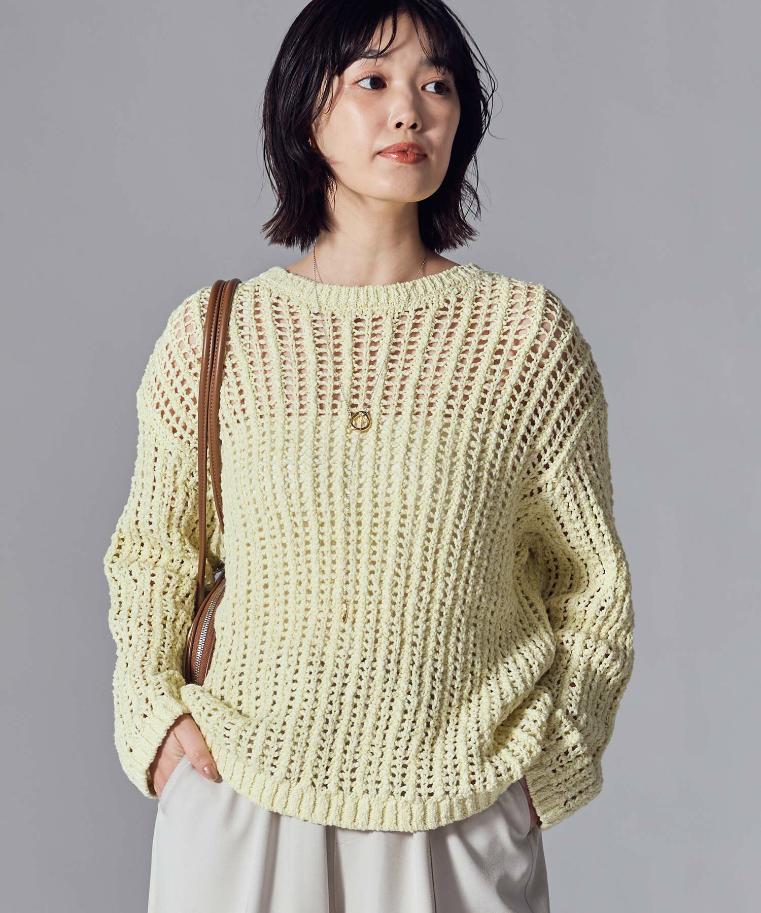 寒い時期は、透かし柄を活かしたロンTやワンピースなどとのレイヤードスタイルがオススメ。