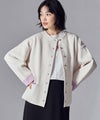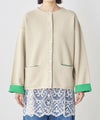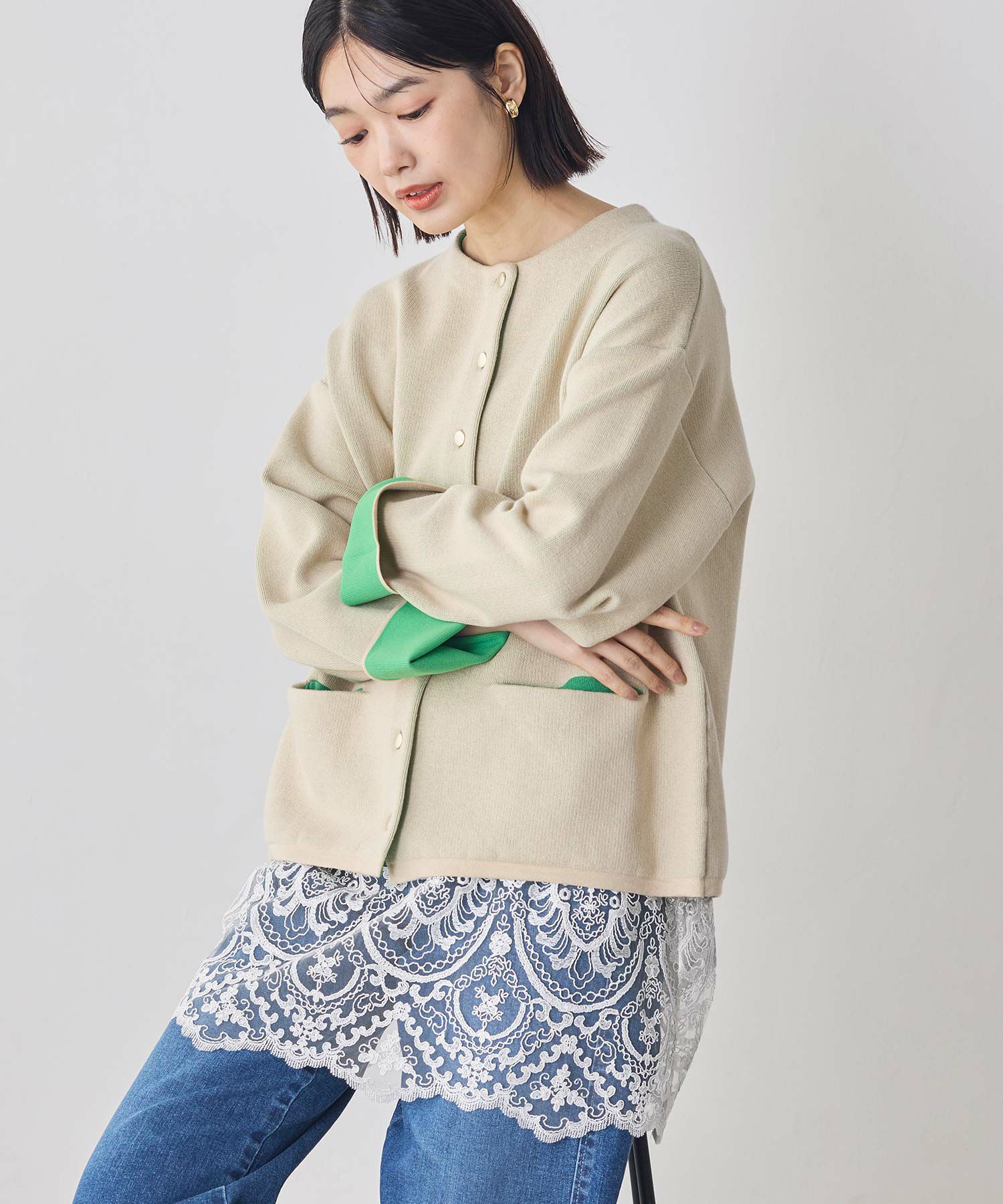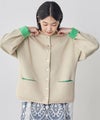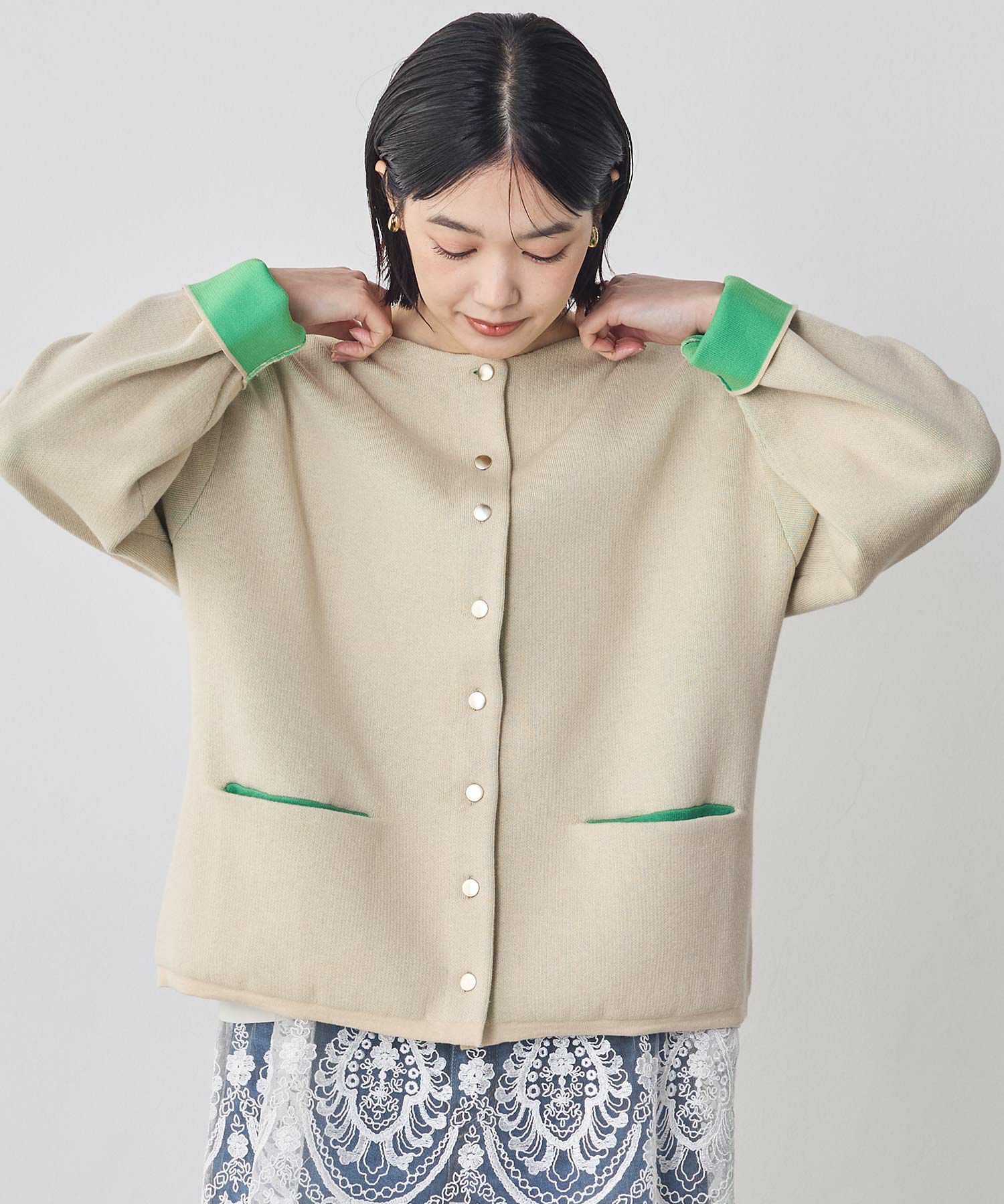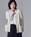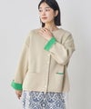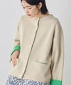 やわらかな綿混素材と春らしいニュアンスカラーの配色が目を惹くダブルフェイスのニットカーディガン。