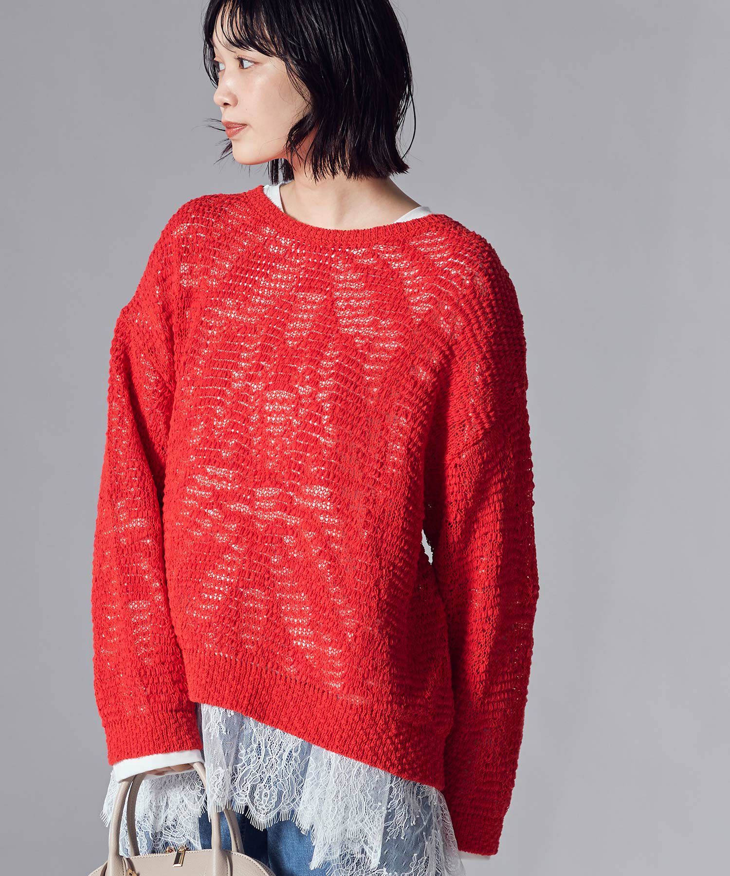 表情豊かなテープヤーンの糸を使用した、シアー感のあるジャガード柄が魅力的なニットプルオーバー。