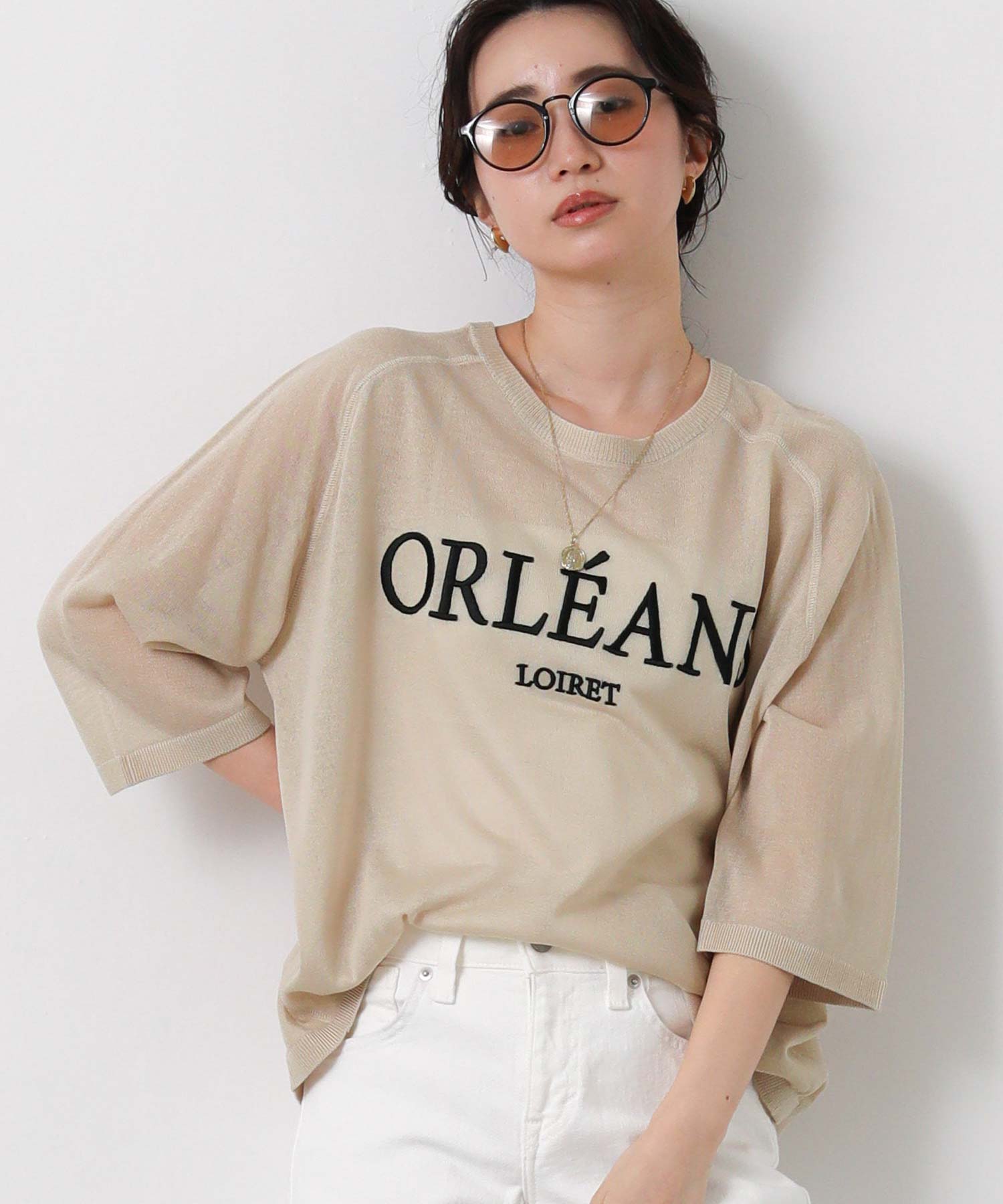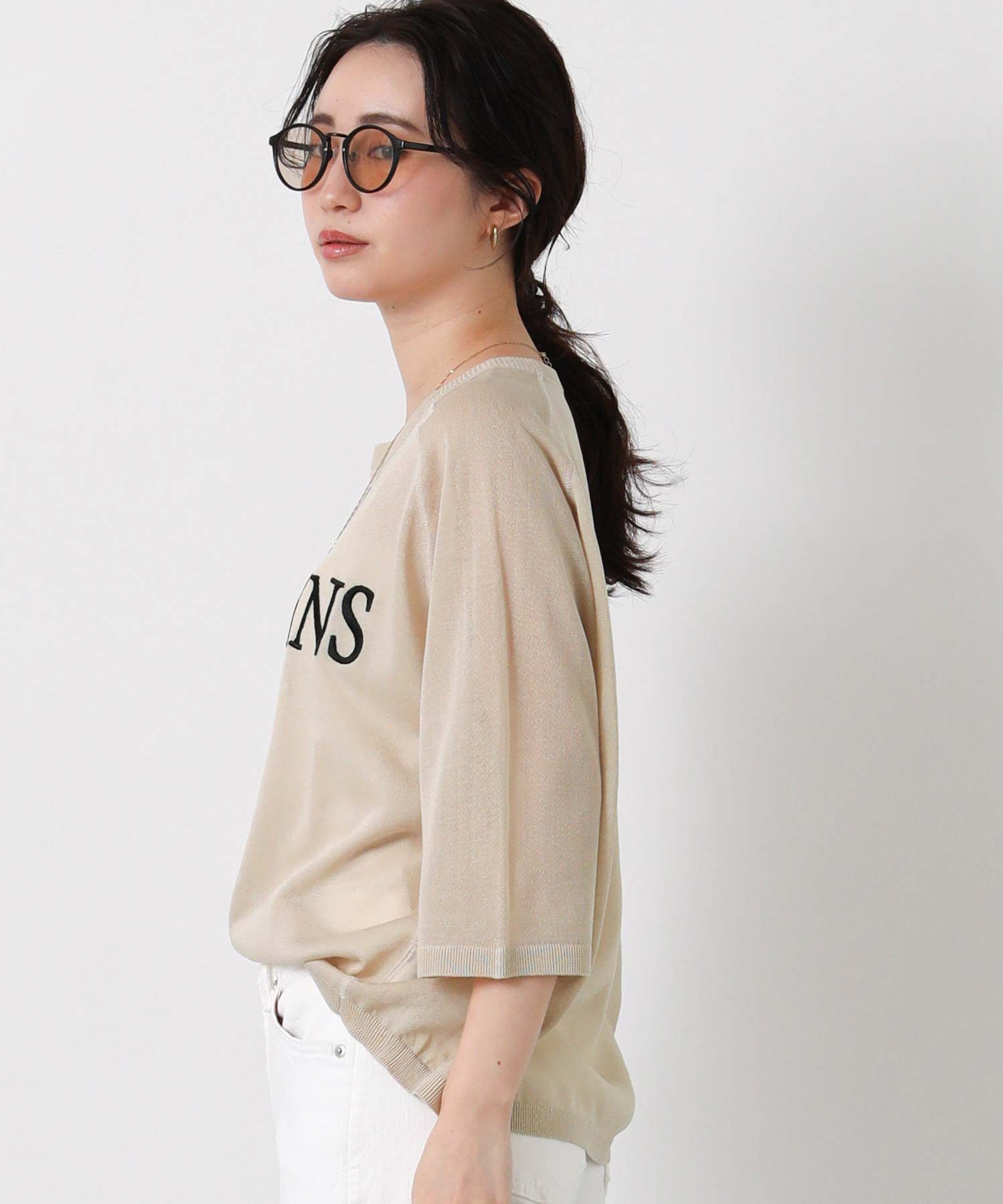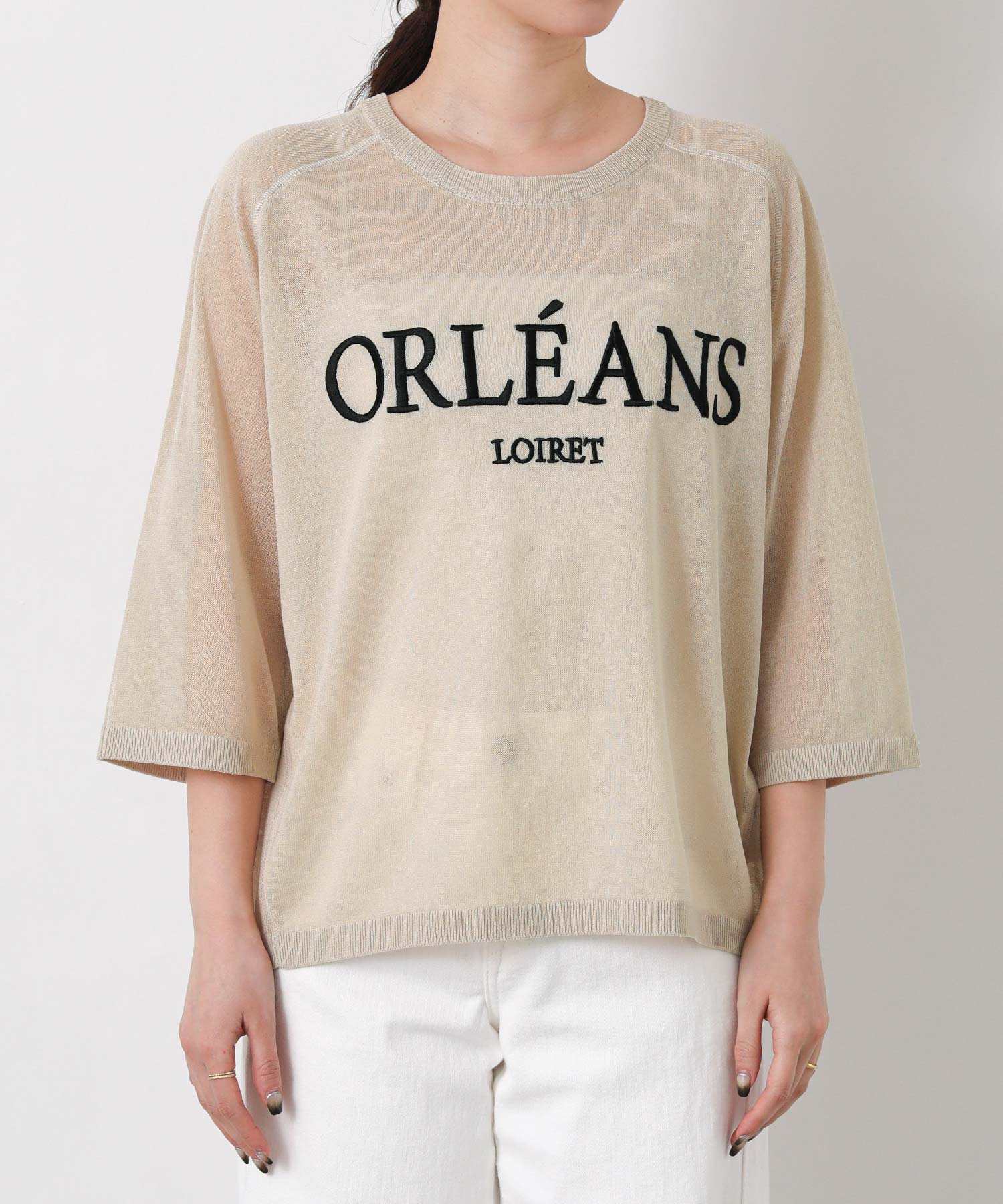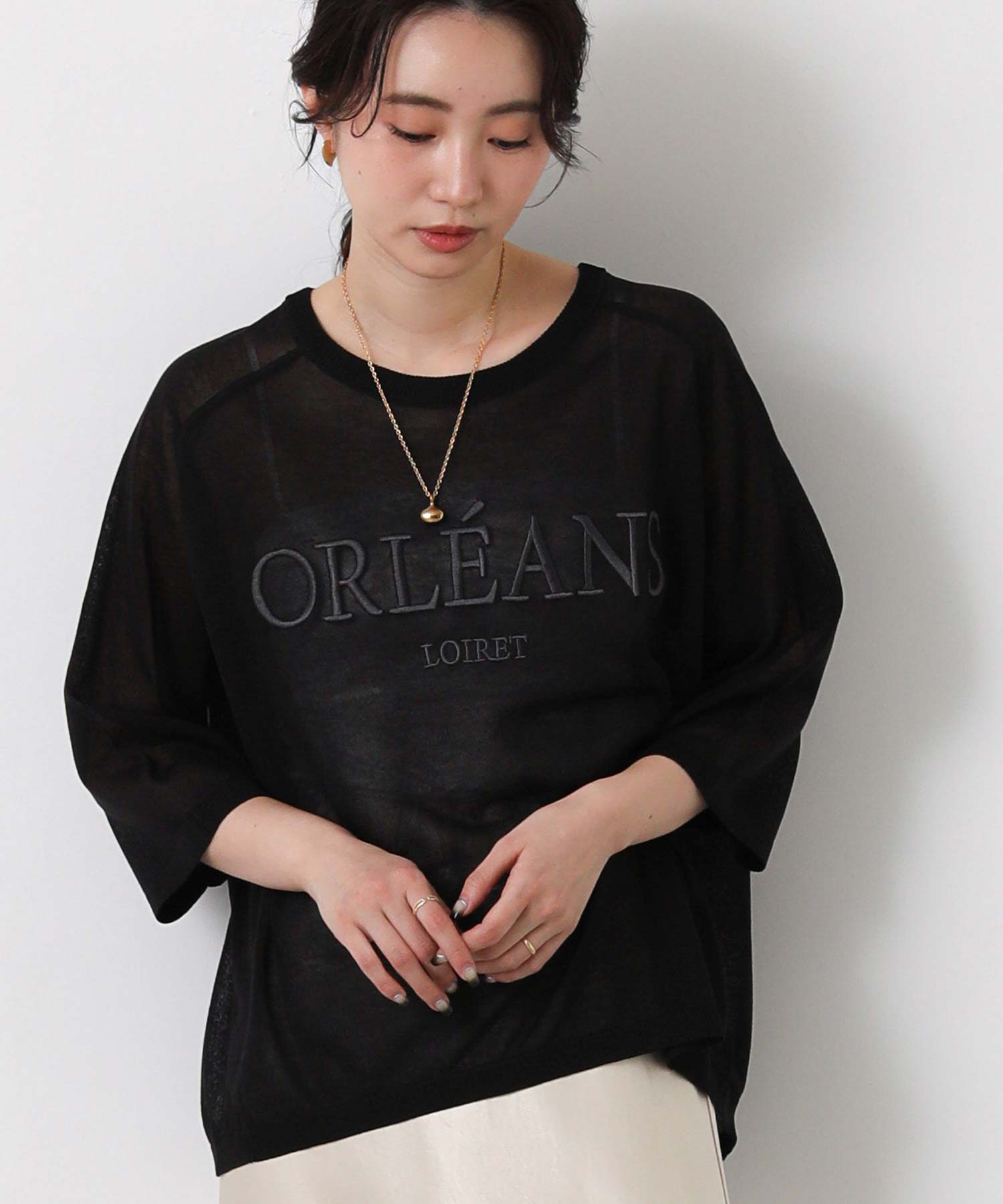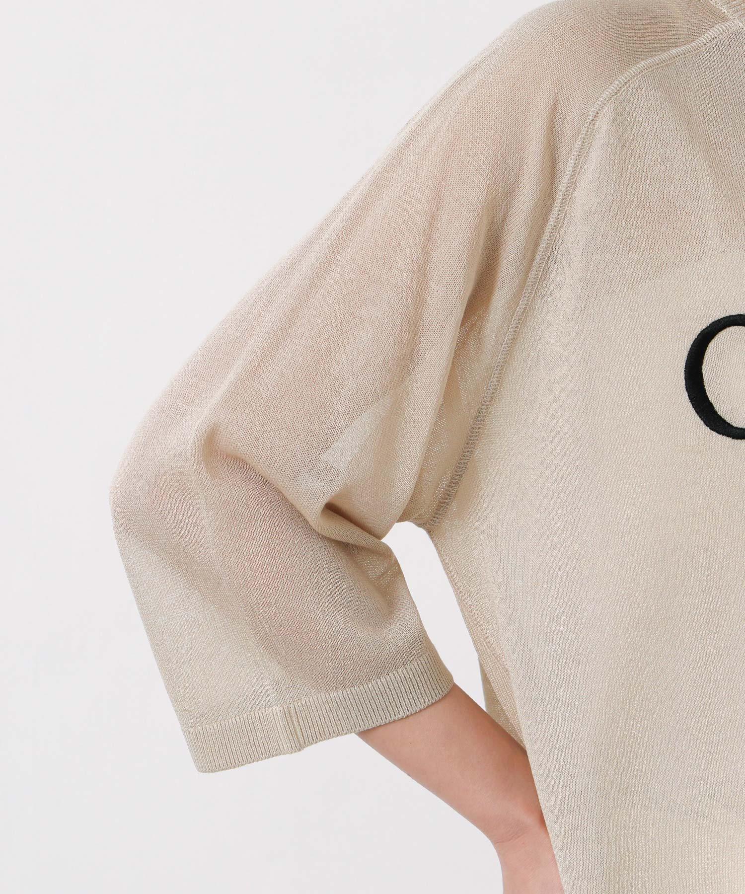 程よいシアー感と刺繍のロゴがカジュアルになり過ぎず上品な印象。