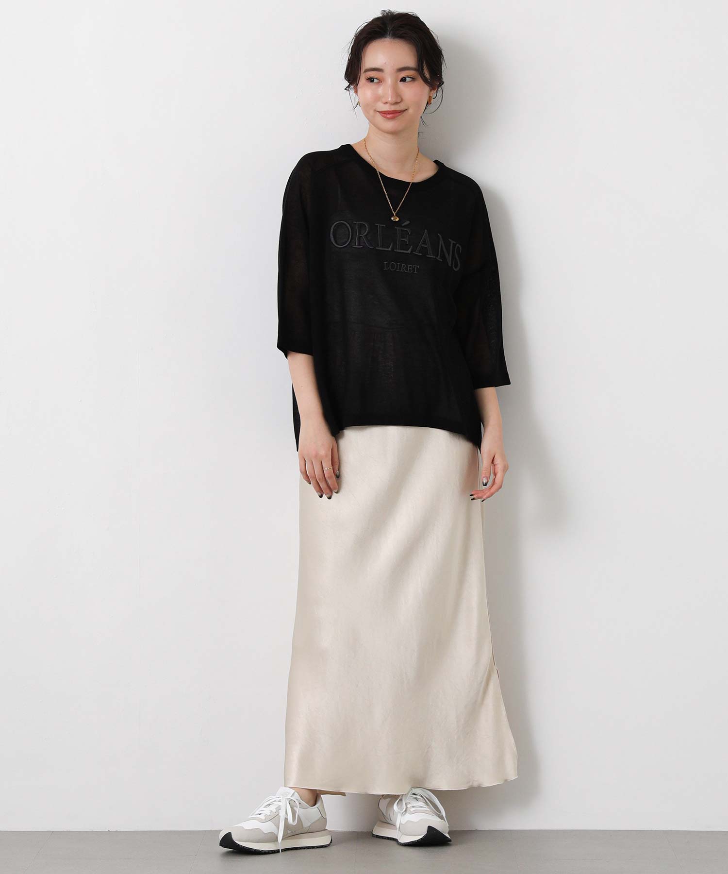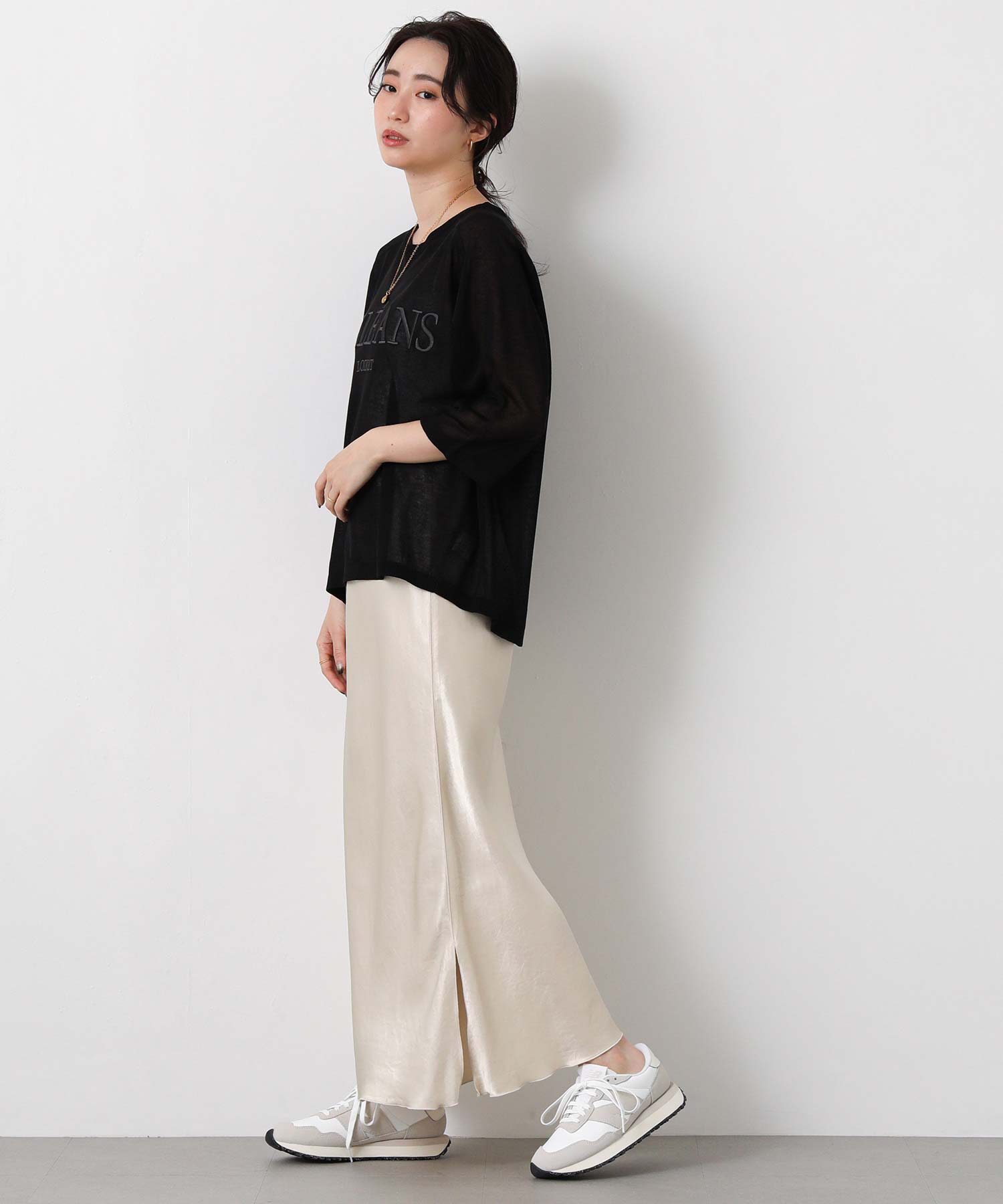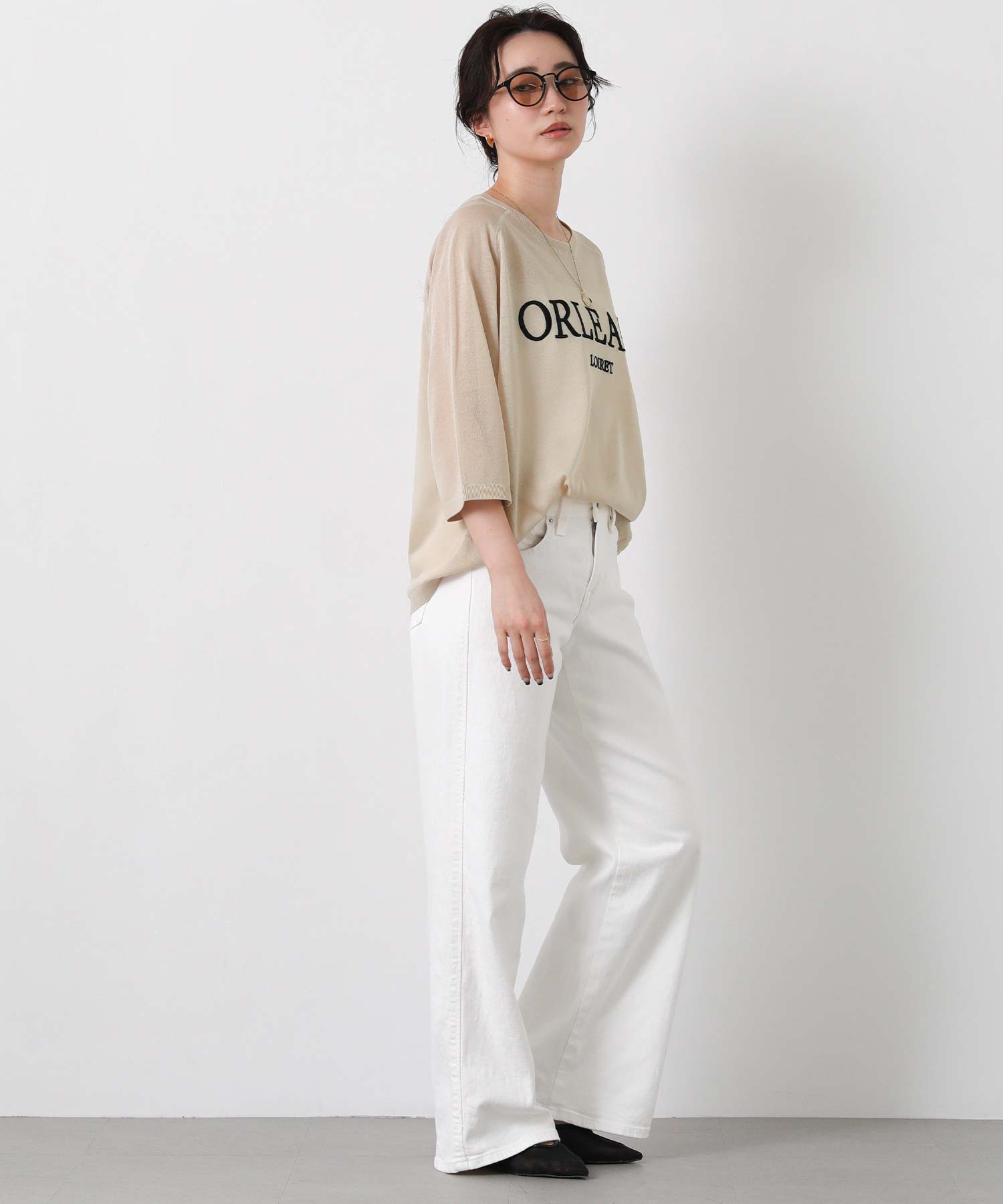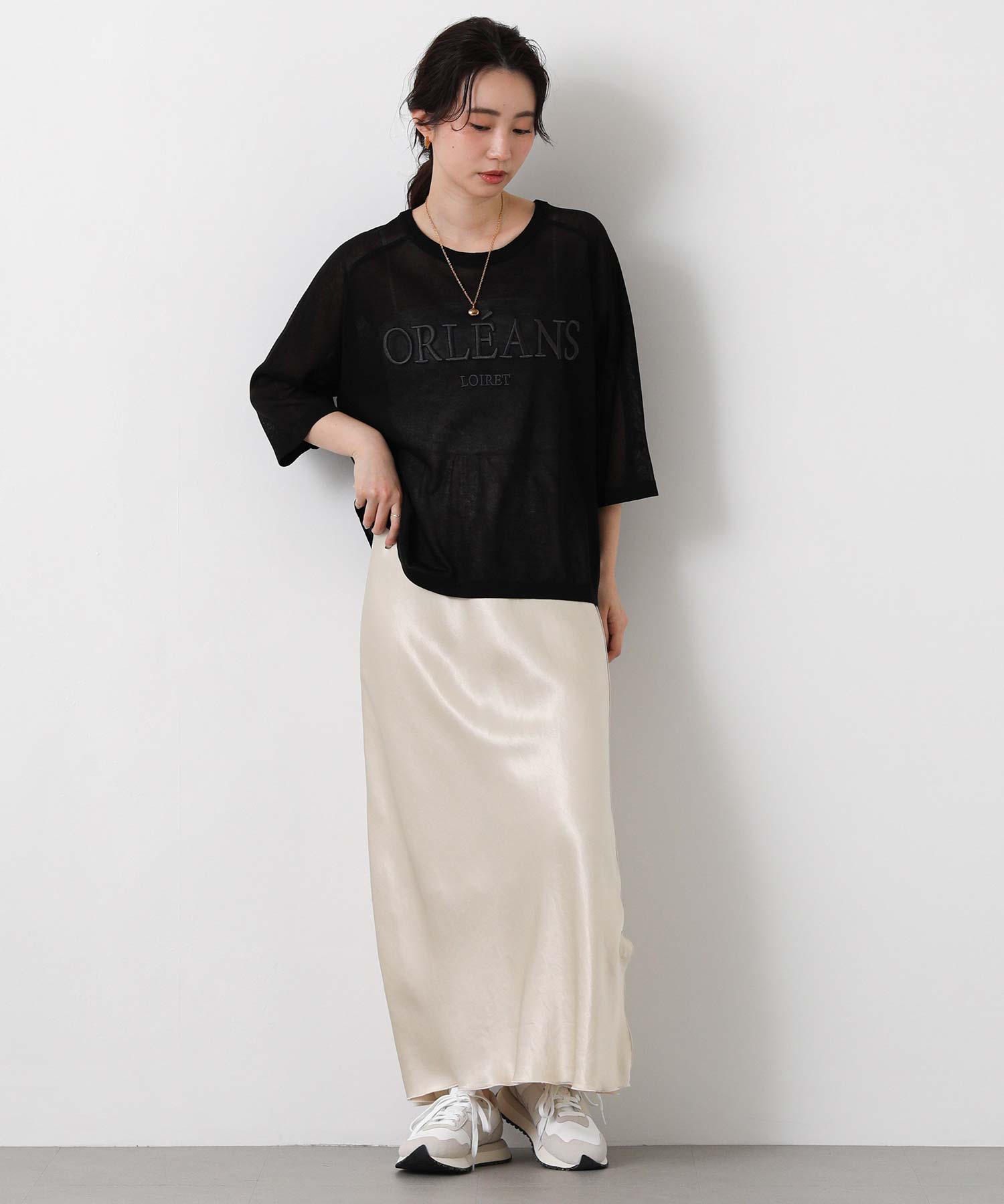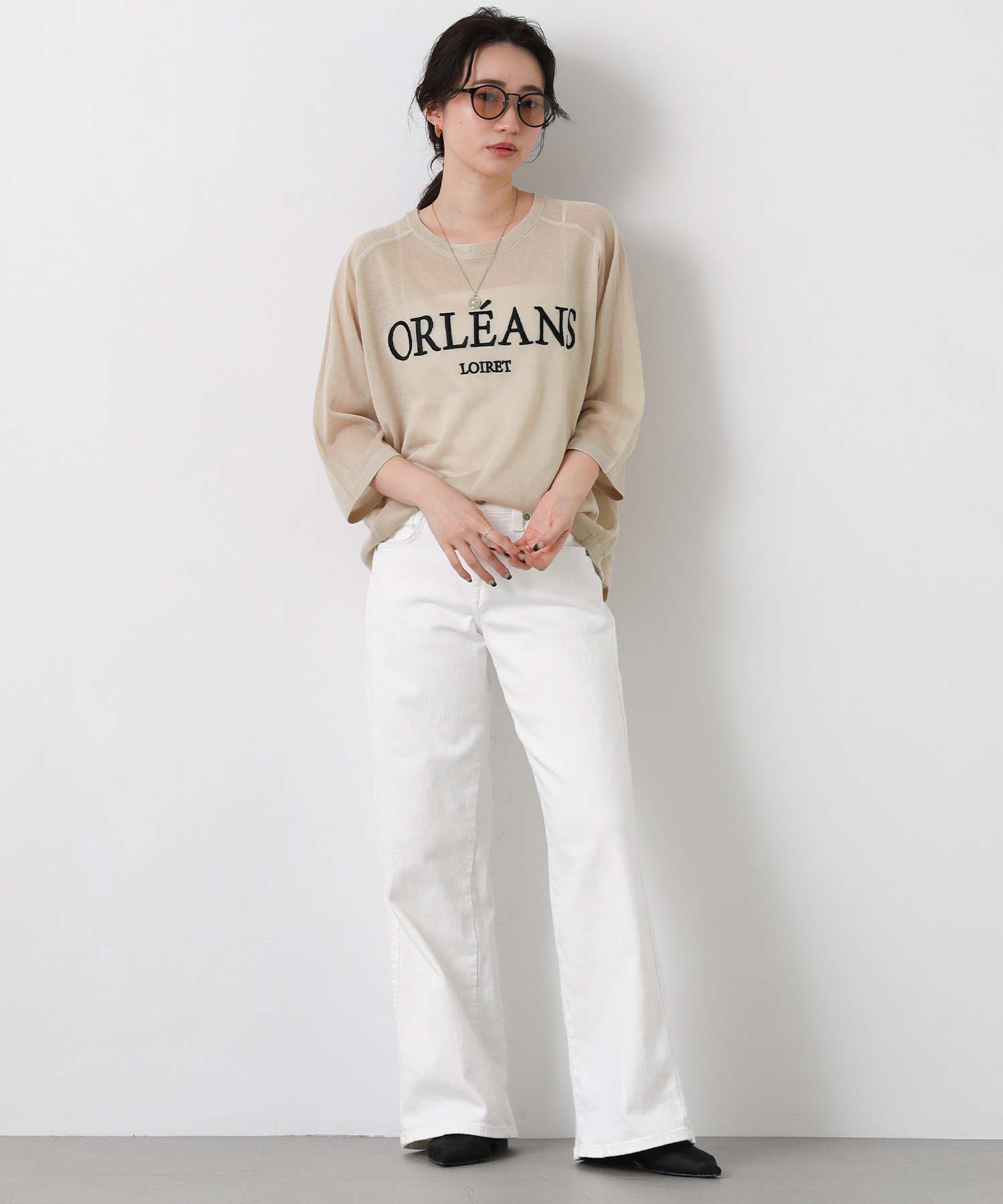 程よいシアー感と刺繍のロゴがカジュアルになり過ぎず上品な印象。