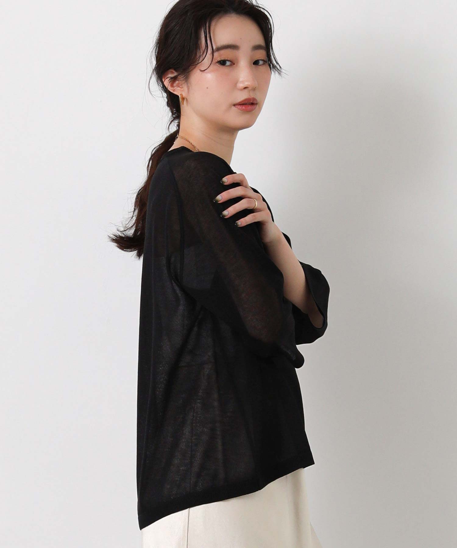 少しシャリ感のあるサラサラした肌触りの糸を使用したニットプルオーバー。