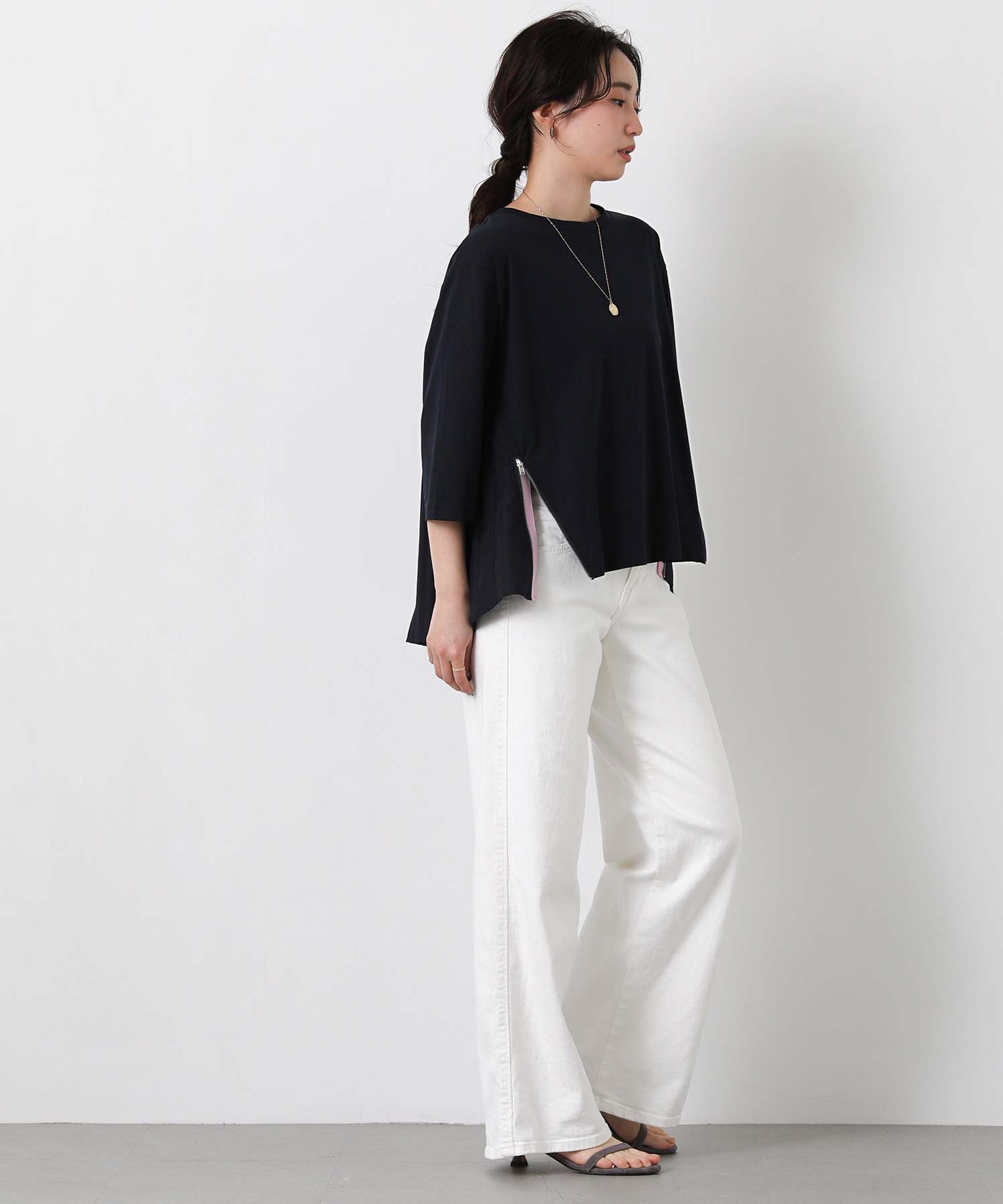 サイドの斜めに入ったファスナーデザインがポイントに。