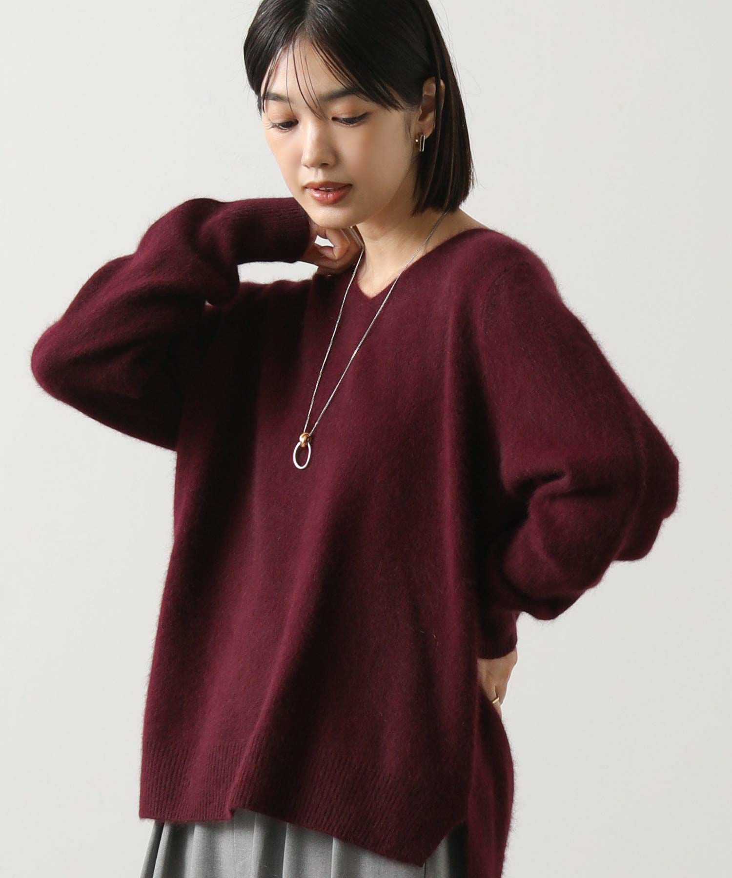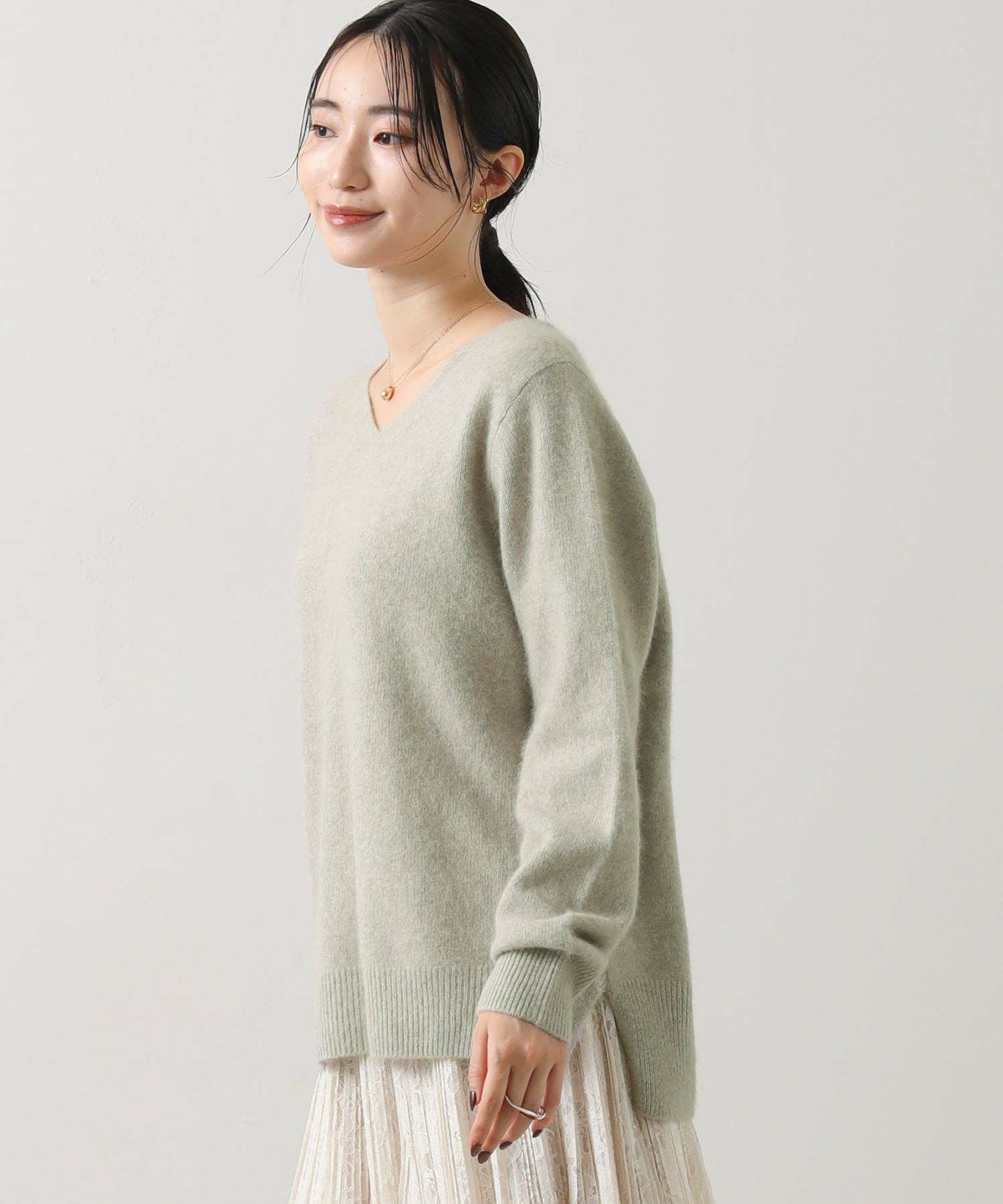 シンプルでありながらも高級感と上品さのあるVネックニット。