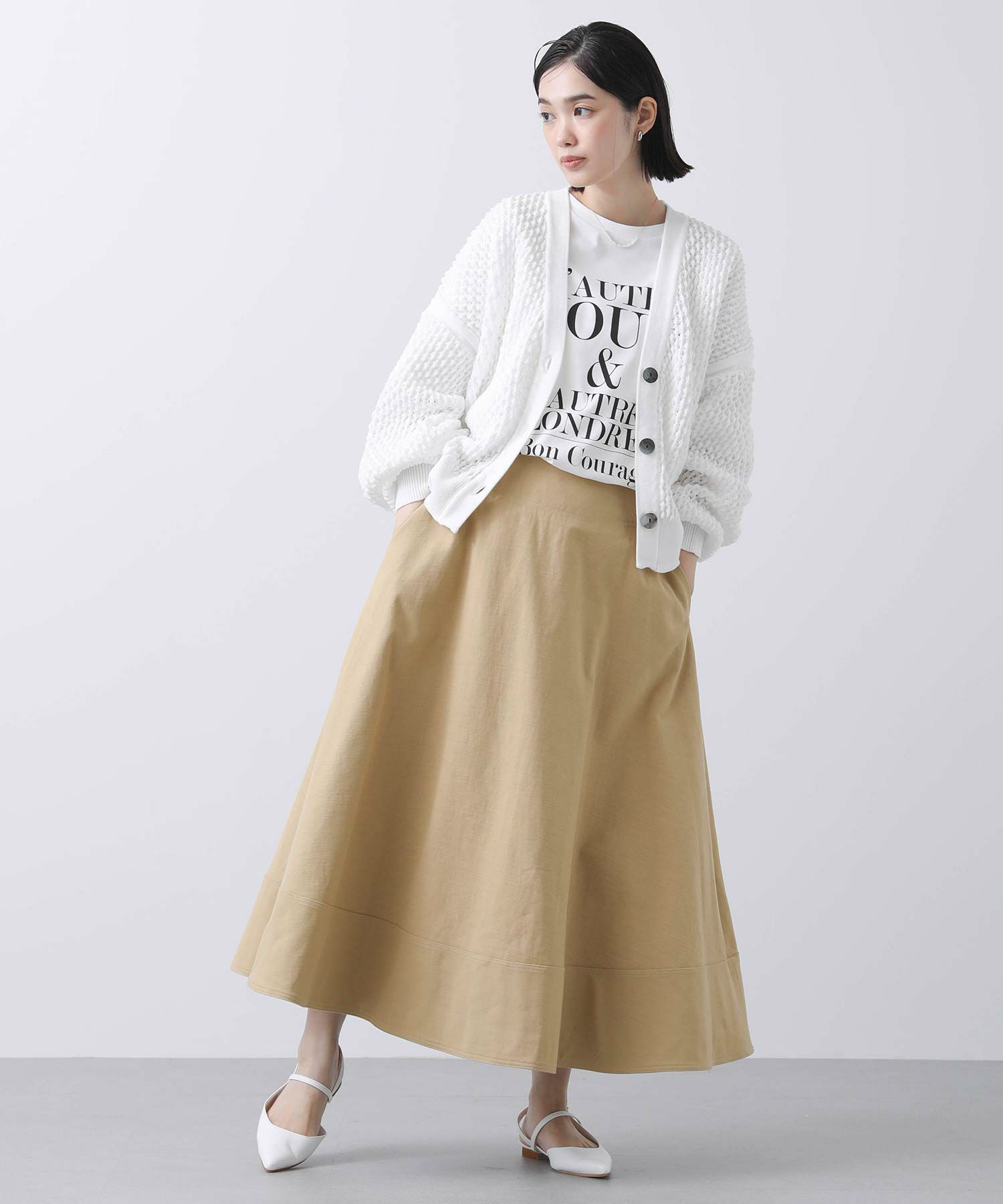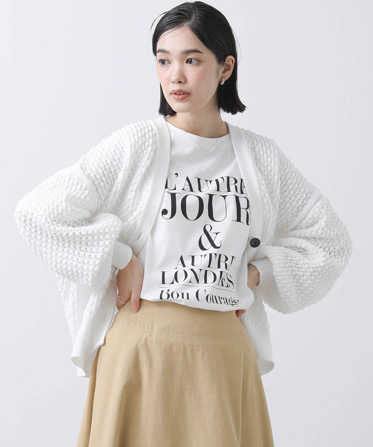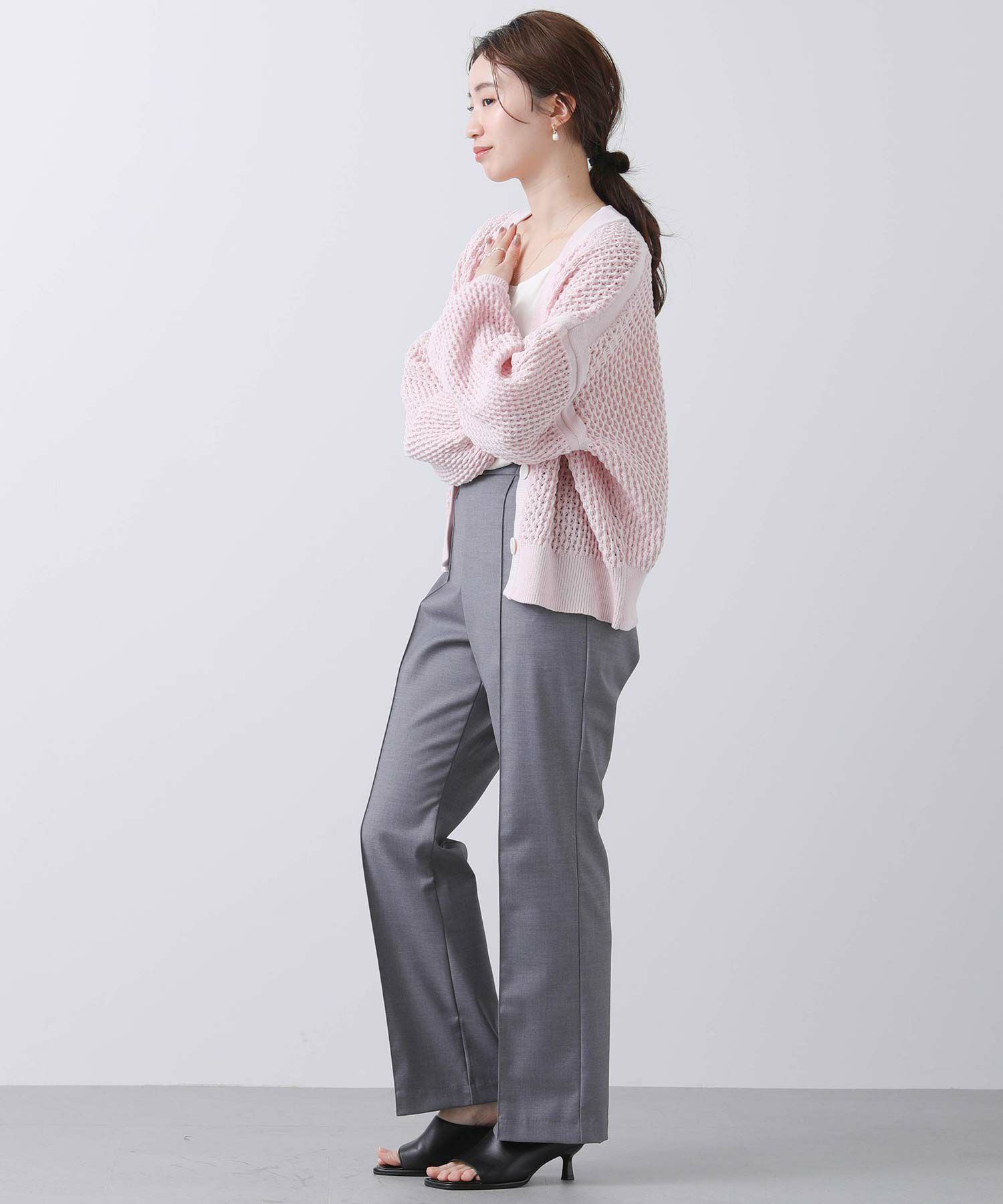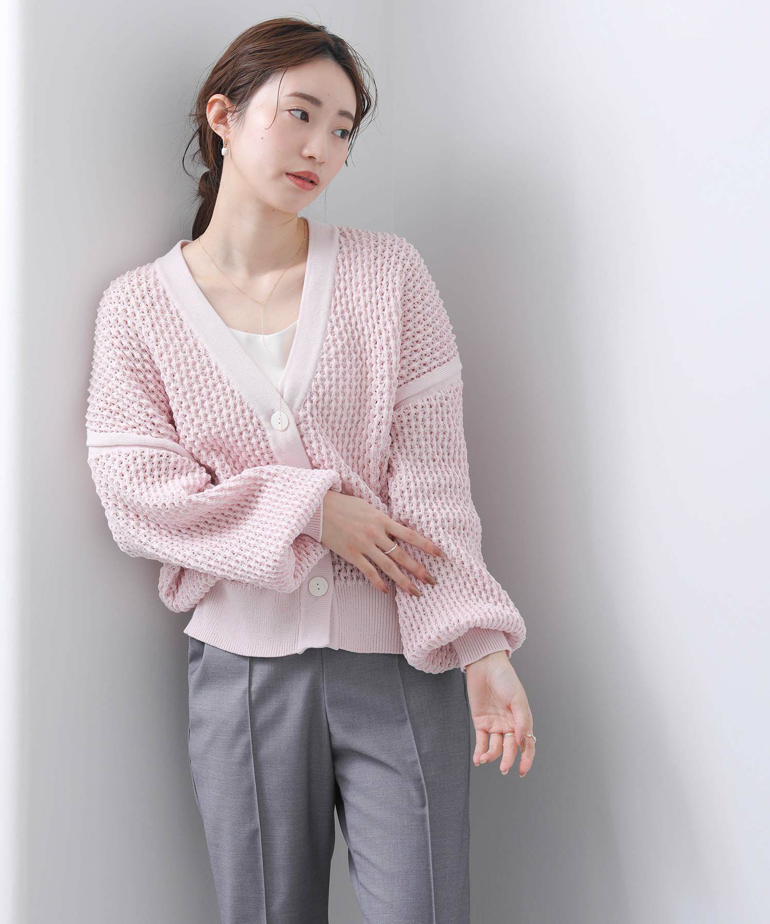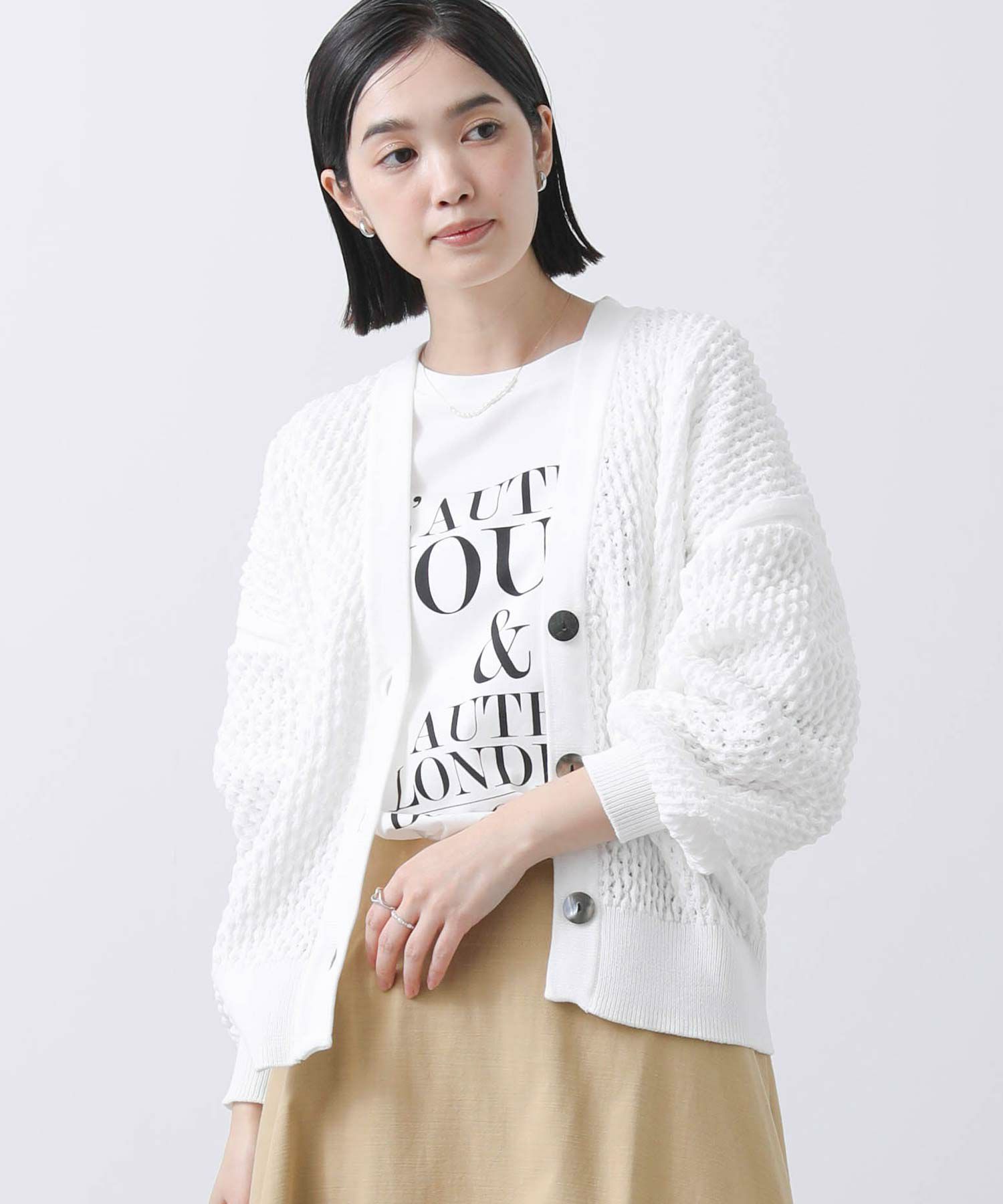 ベーシックな丈感で、どんなボトムスともバランスのとりやすいカーデです。