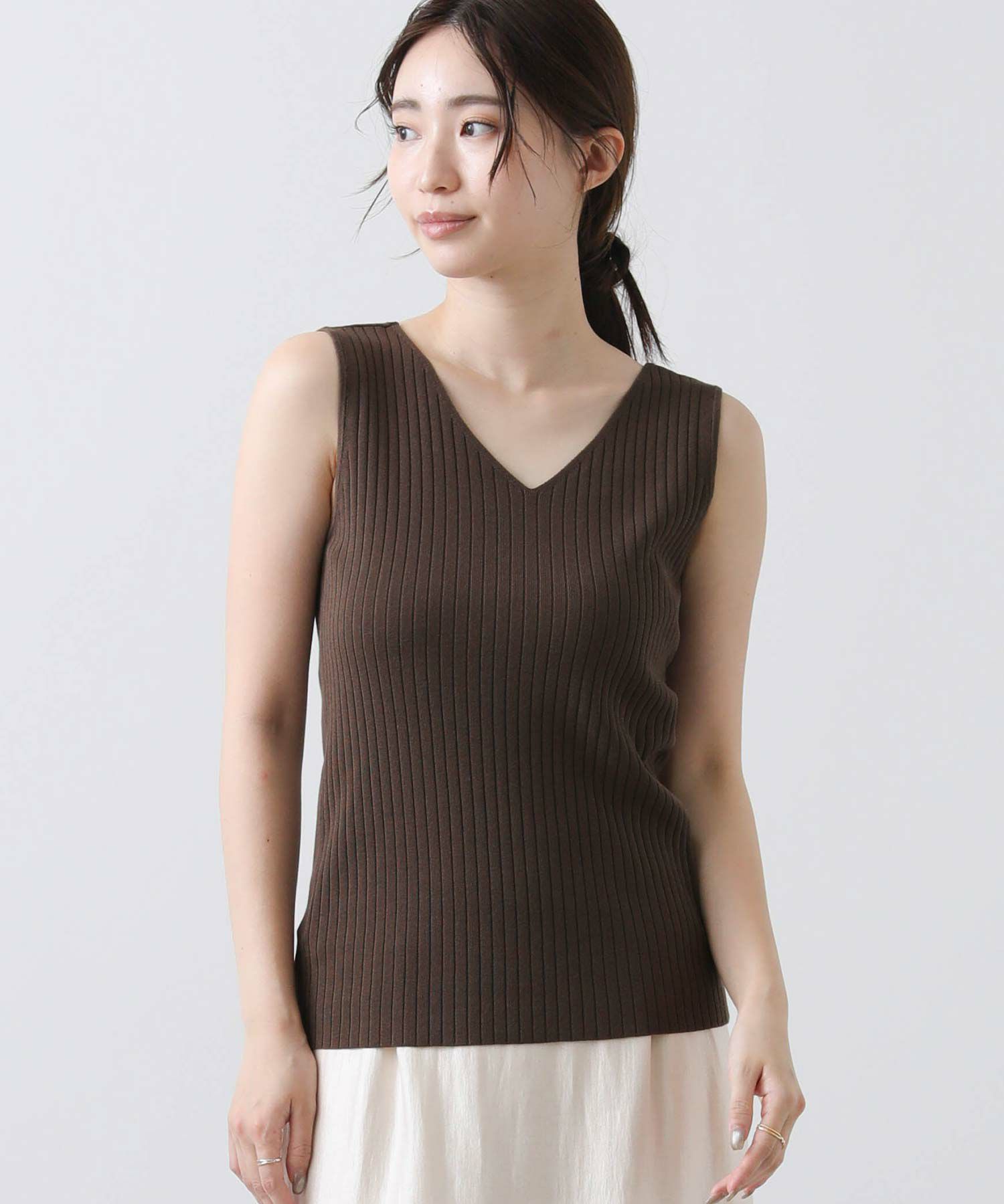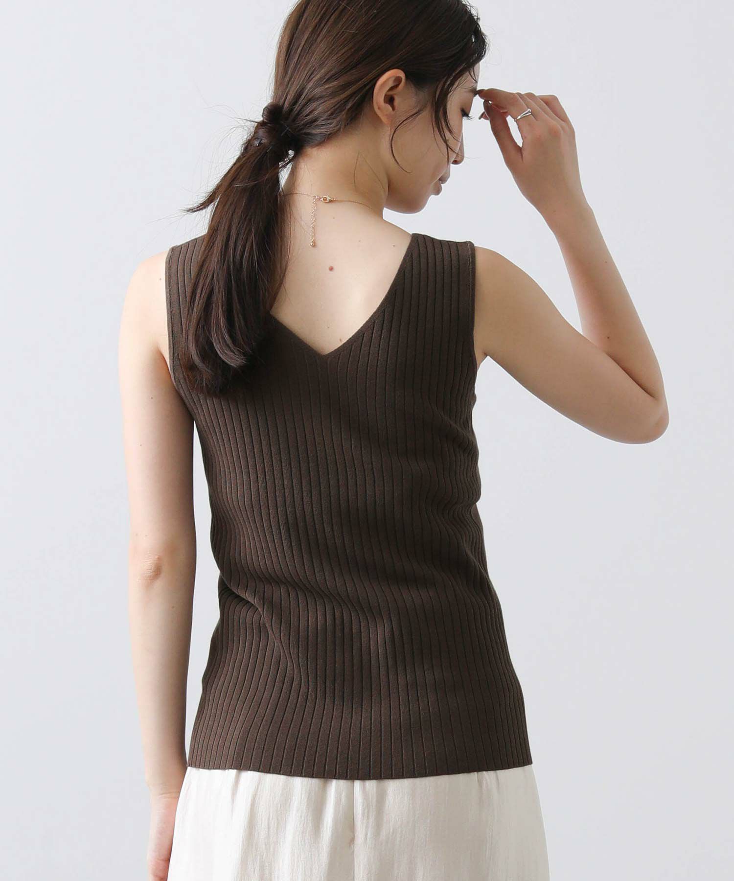 デコルテがキレイに見えるスクエアネックと、顔周りがスッキリ見えるVネックの、前後2WAYで楽しめるニットタンク。