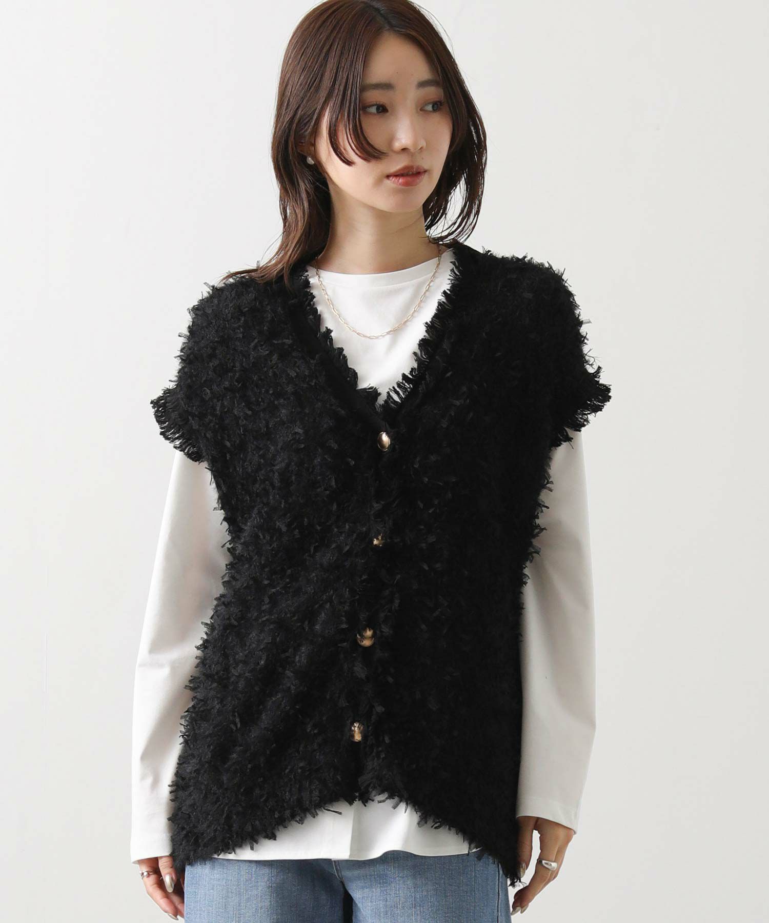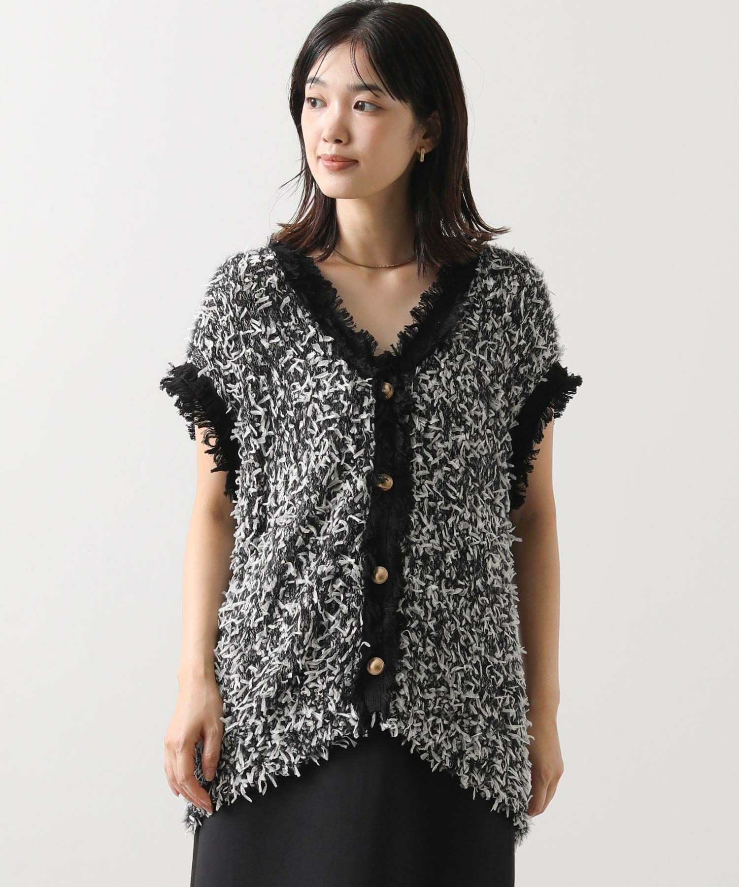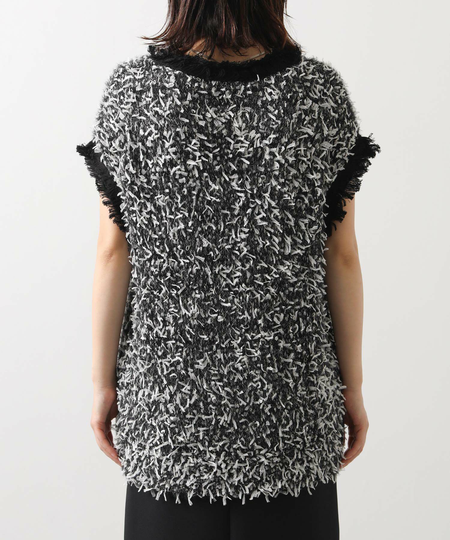表情豊かなリボンの様なテープヤーンと、ふんわりとしたフェザーヤーン素材をMIXしたニットベスト。