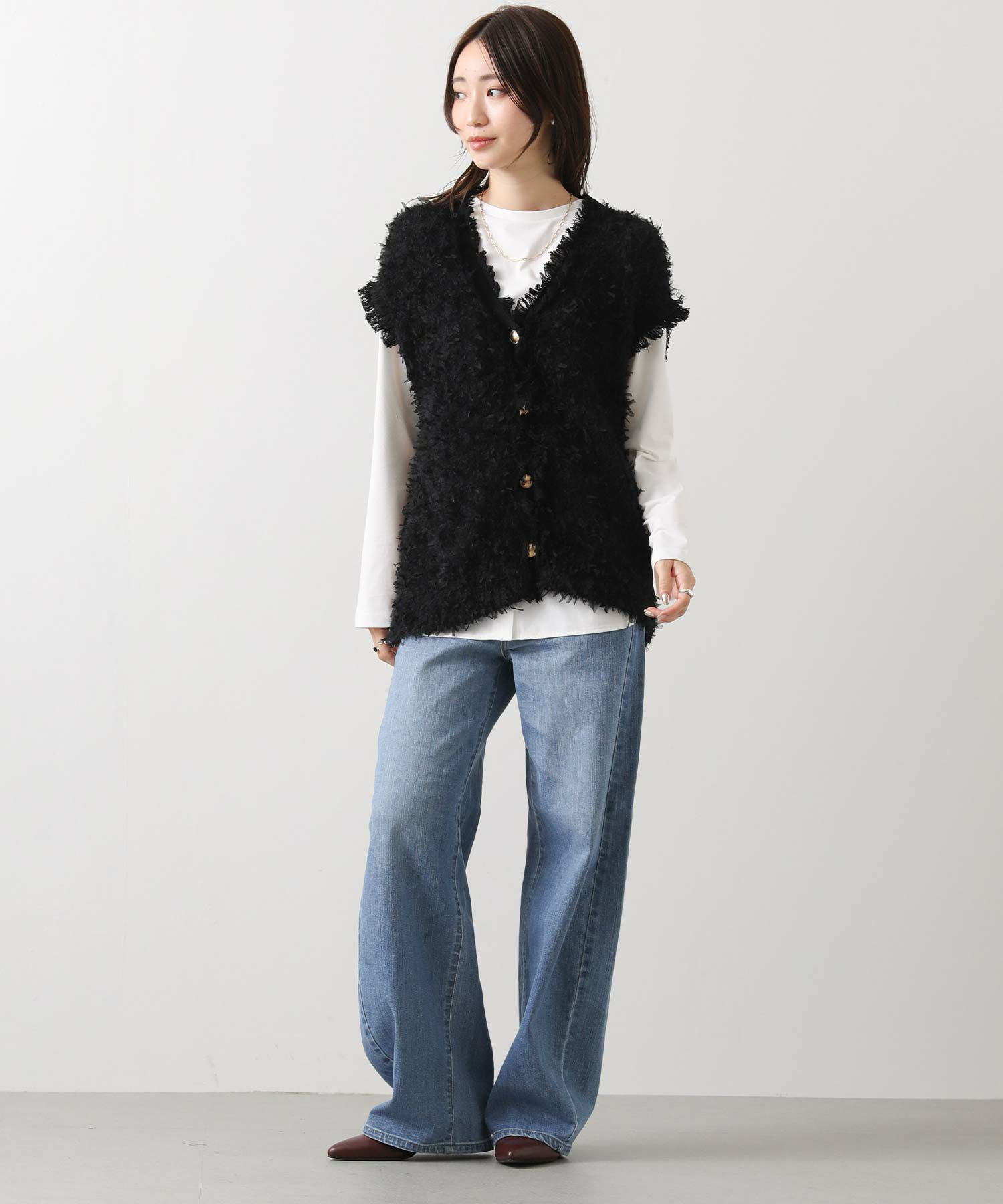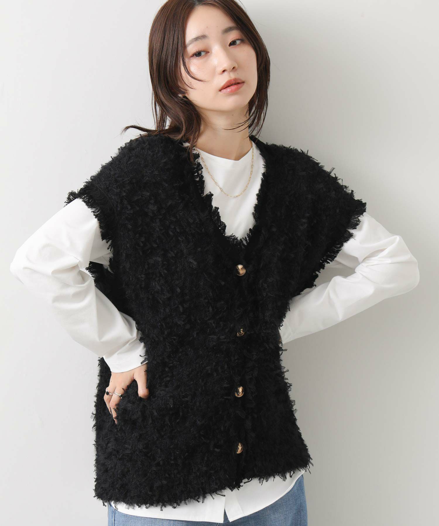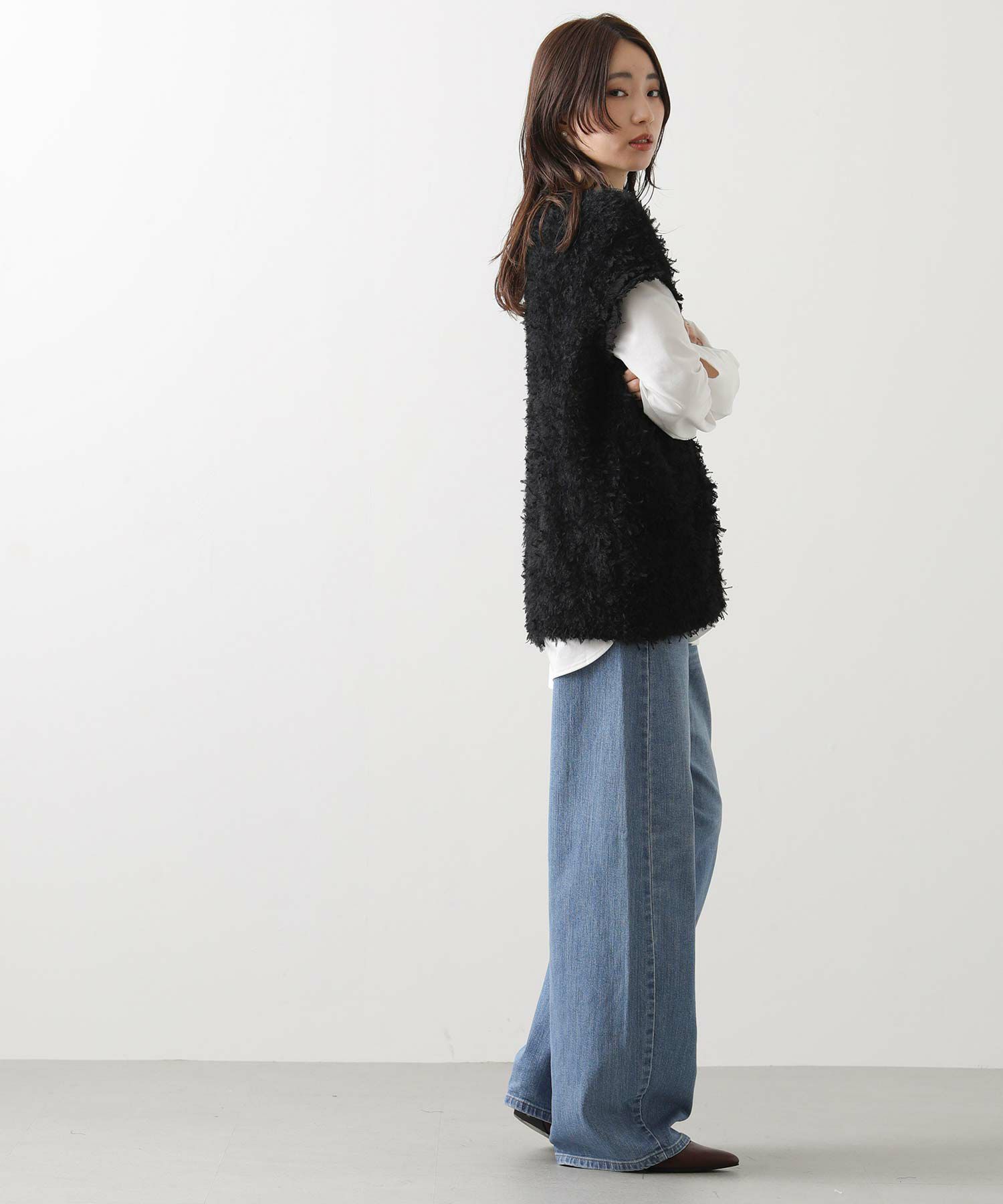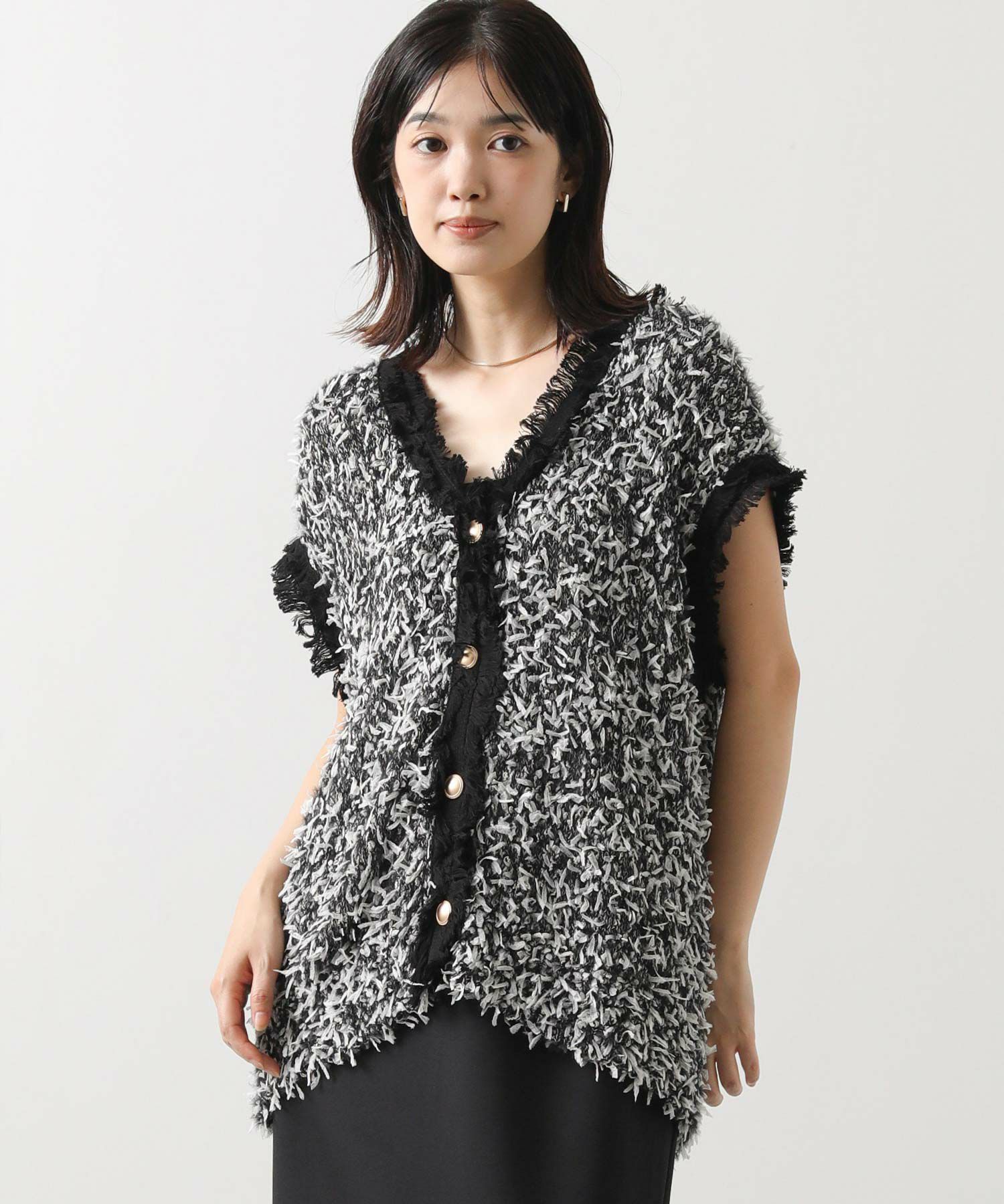 表情豊かなリボンの様なテープヤーンと、ふんわりとしたフェザーヤーン素材をMIXしたニットベスト。