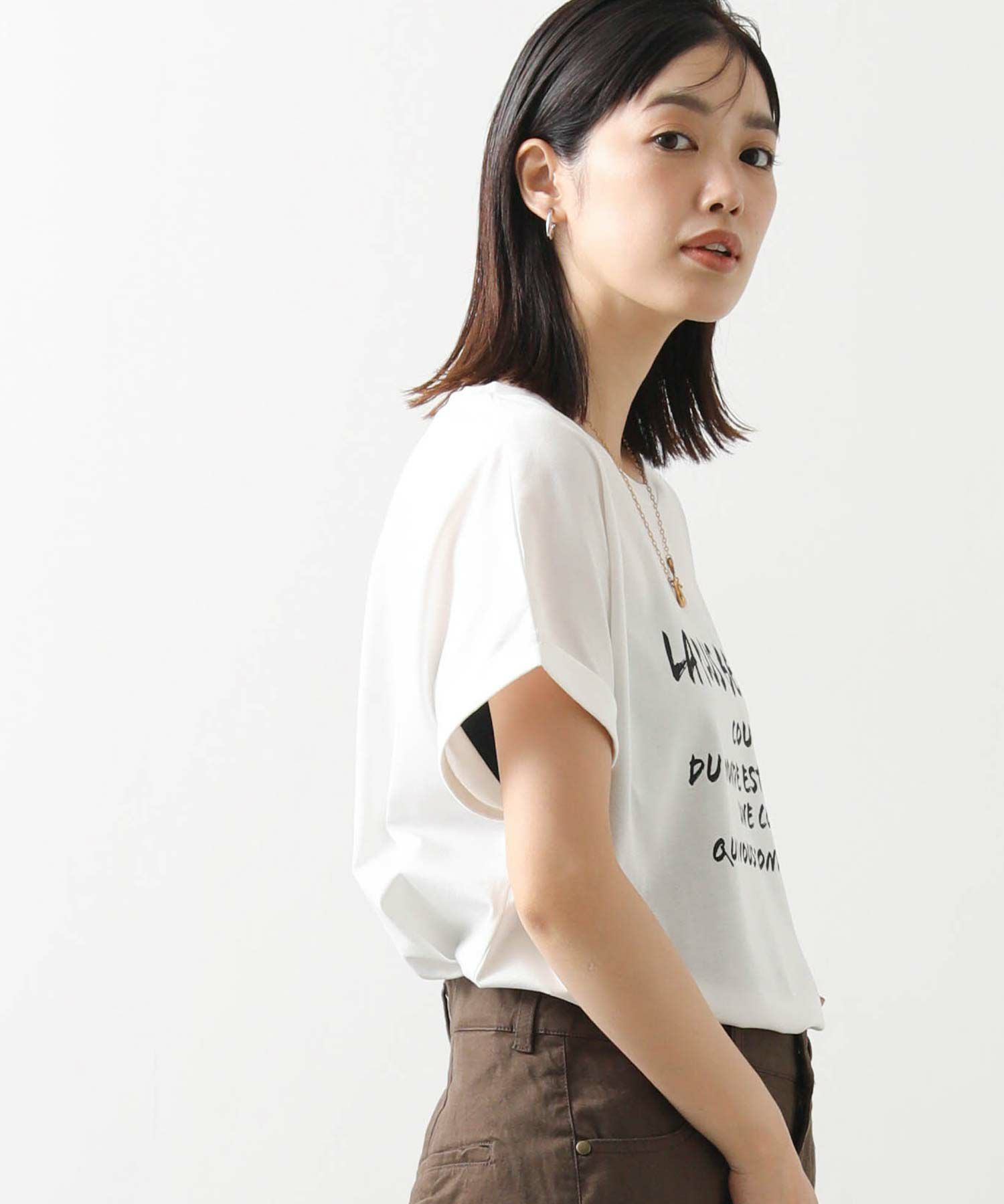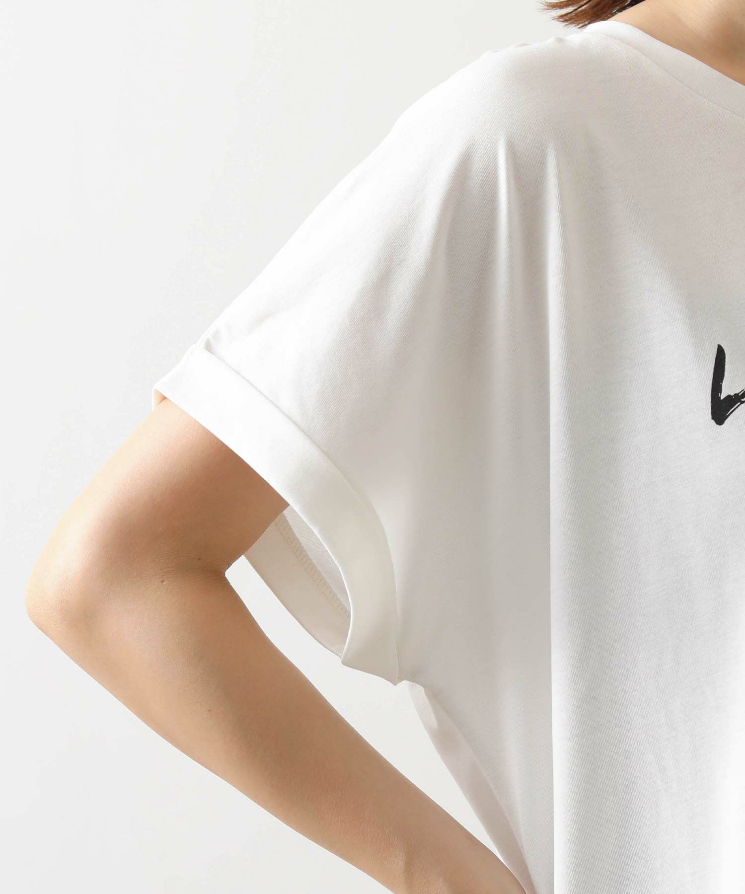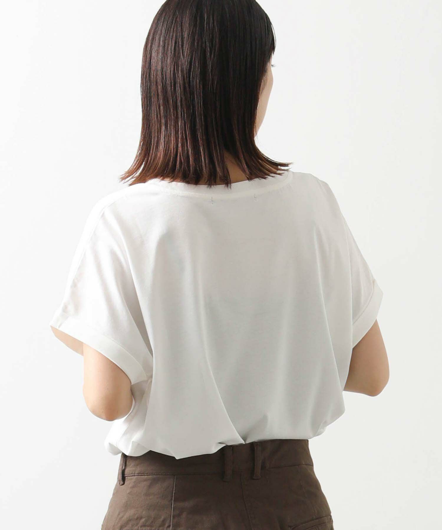 身体のラインを拾わないシルエットとフレンチスリーブでリラックス感のある着心地、袖口はロールアップ仕様でこなれ感をプラス。