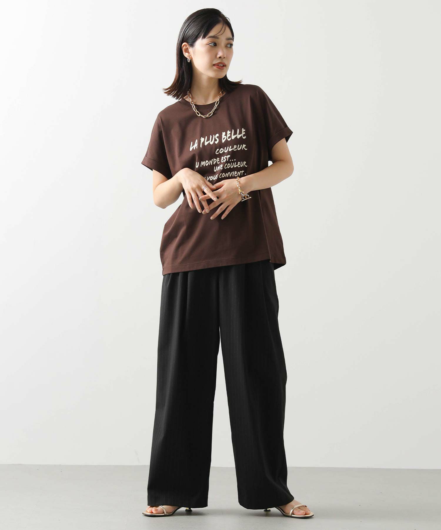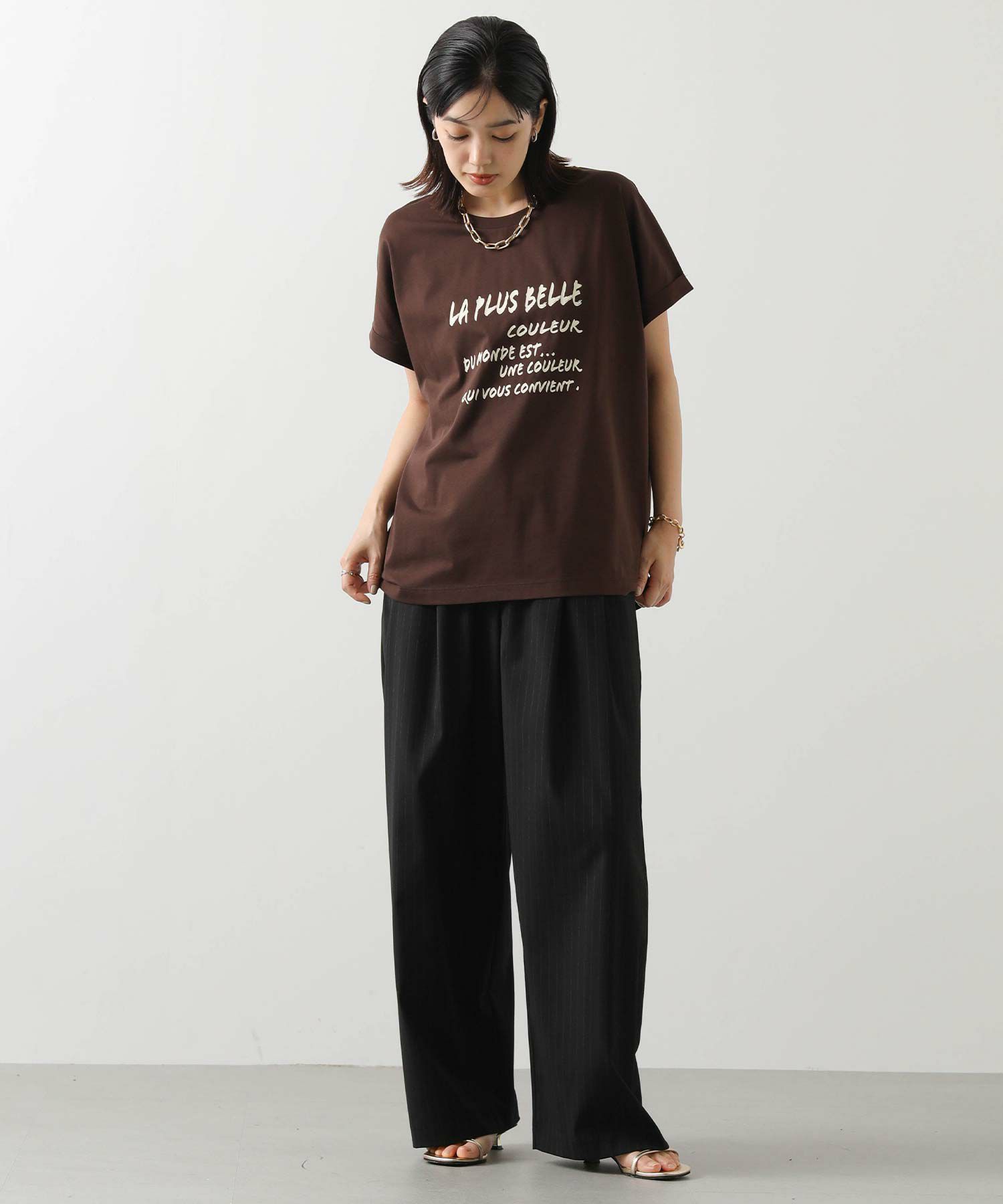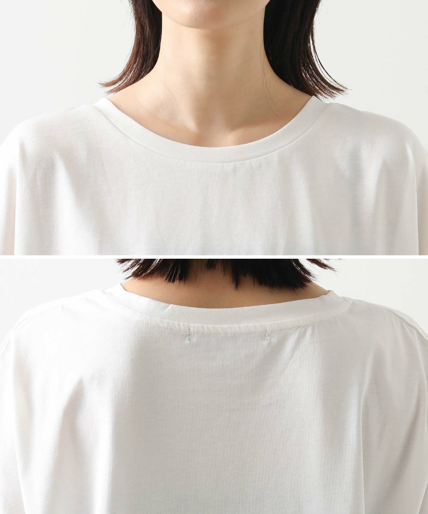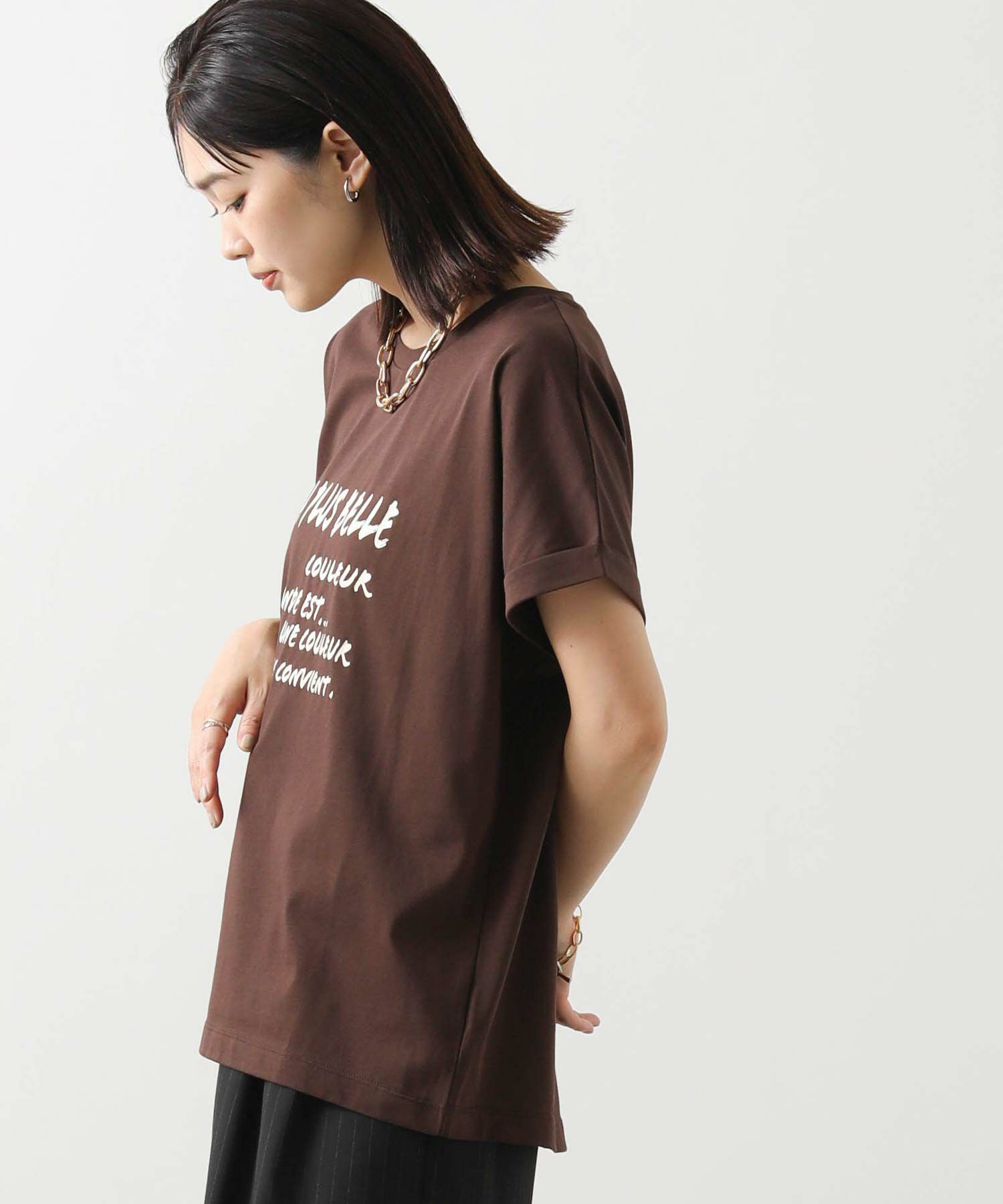 身体のラインを拾わないシルエットとフレンチスリーブでリラックス感のある着心地、袖口はロールアップ仕様でこなれ感をプラス。