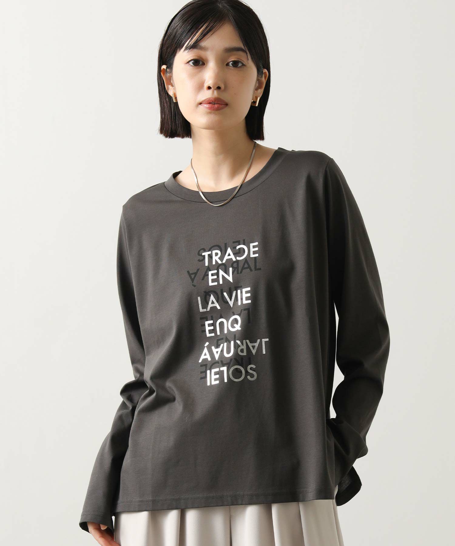 とても柔らかく心地よい生地感で、1枚でも美しく着こなせるのが魅力。プリントに箔を重ねた繊細なグラフィックは、さりげなく華やかさを添えシンプルな中に上質感をプラス。