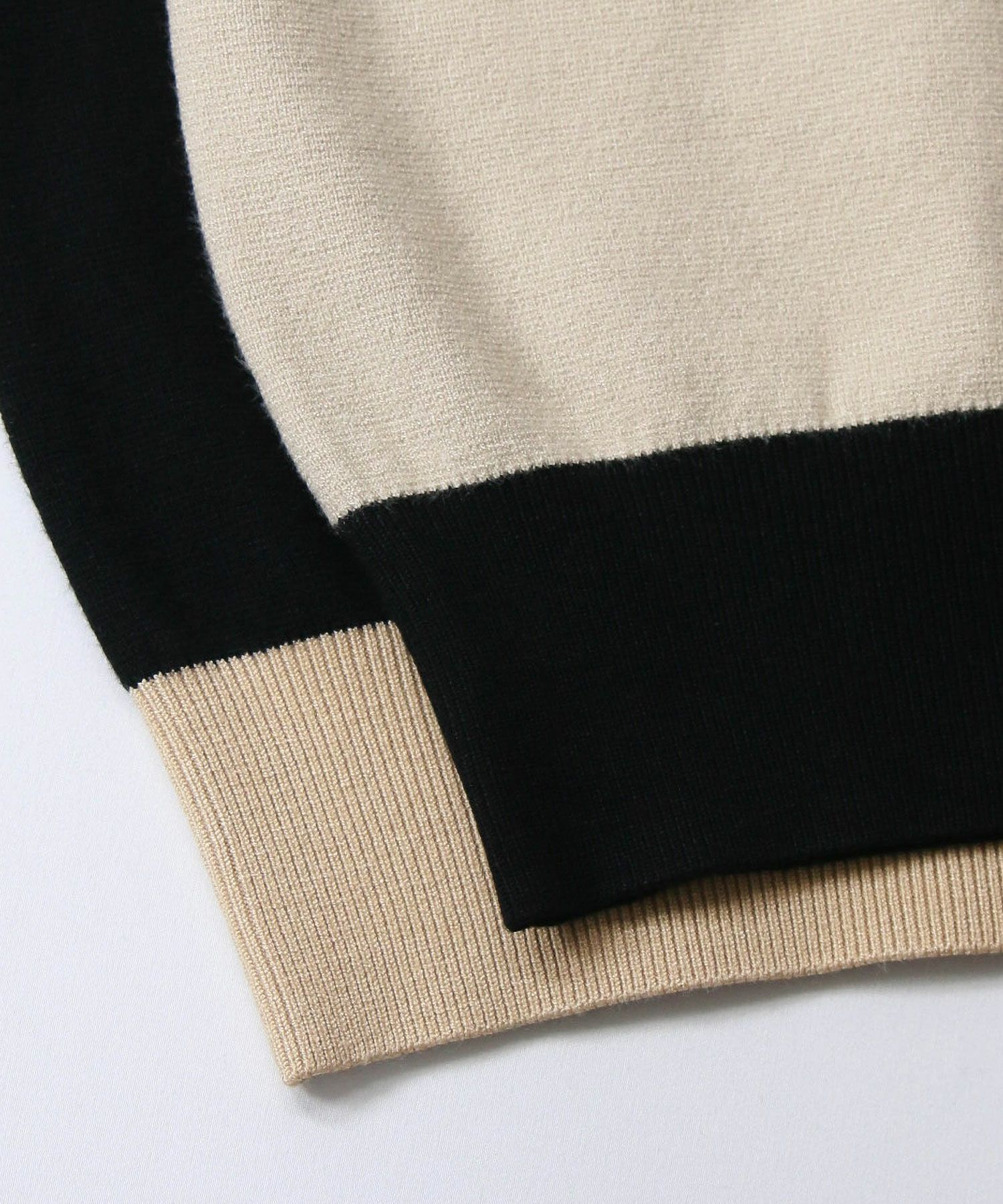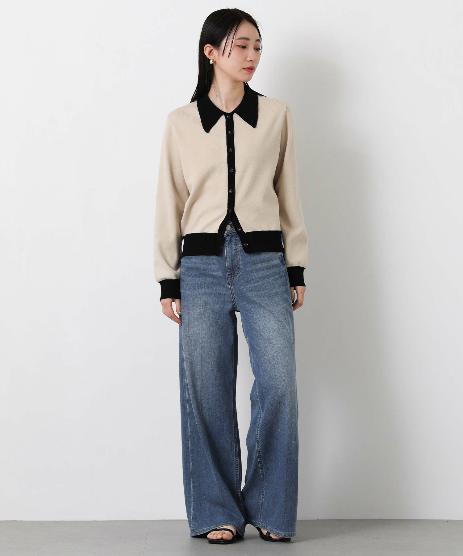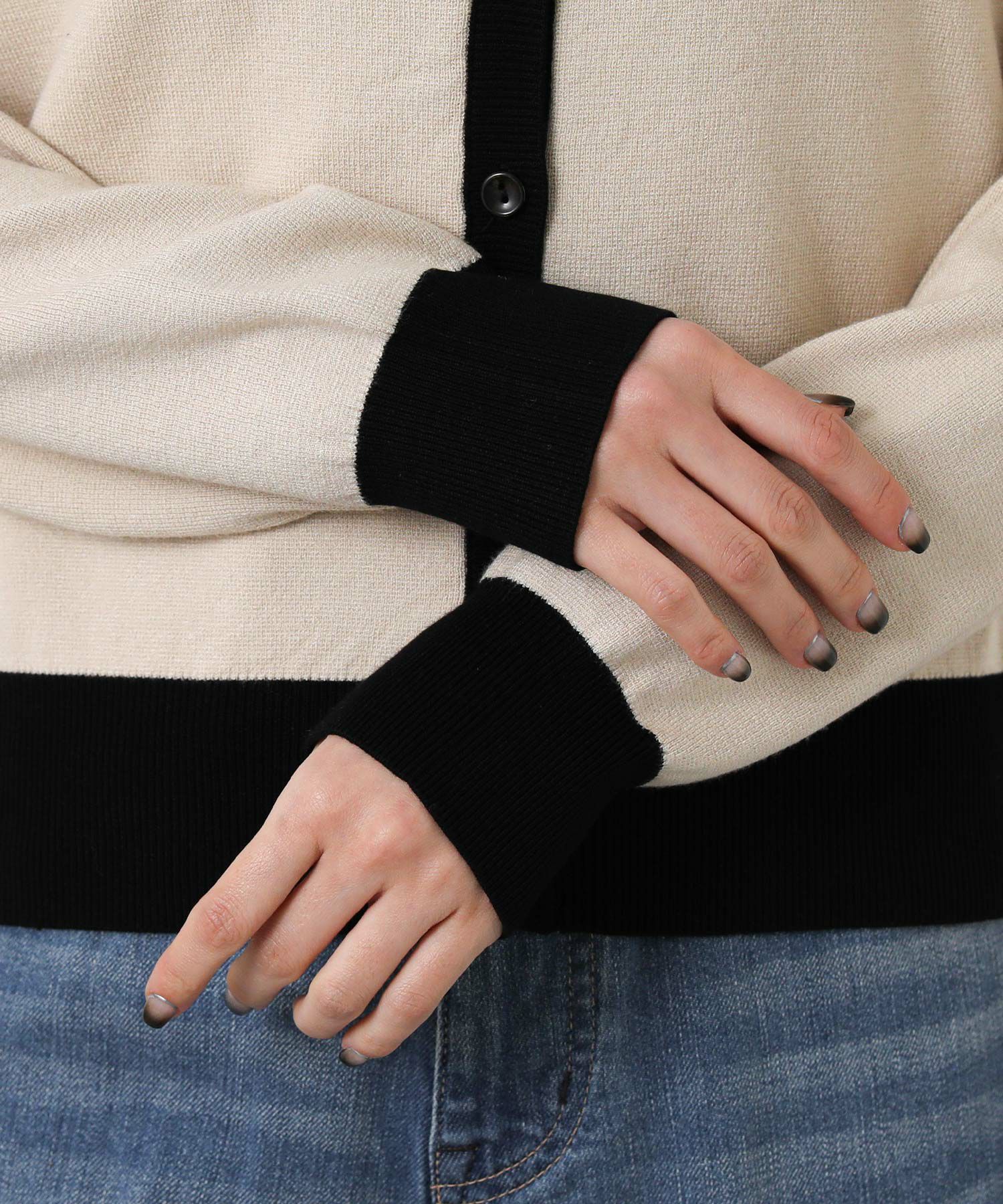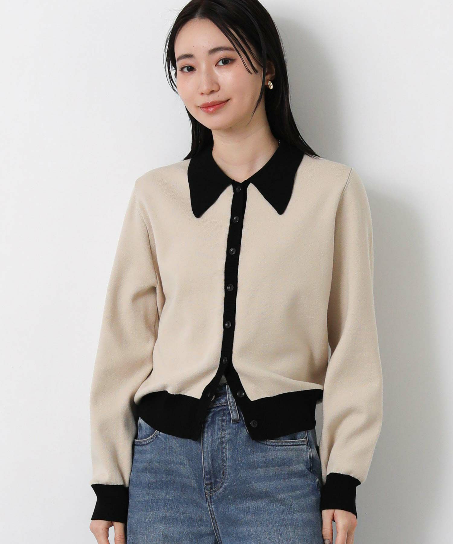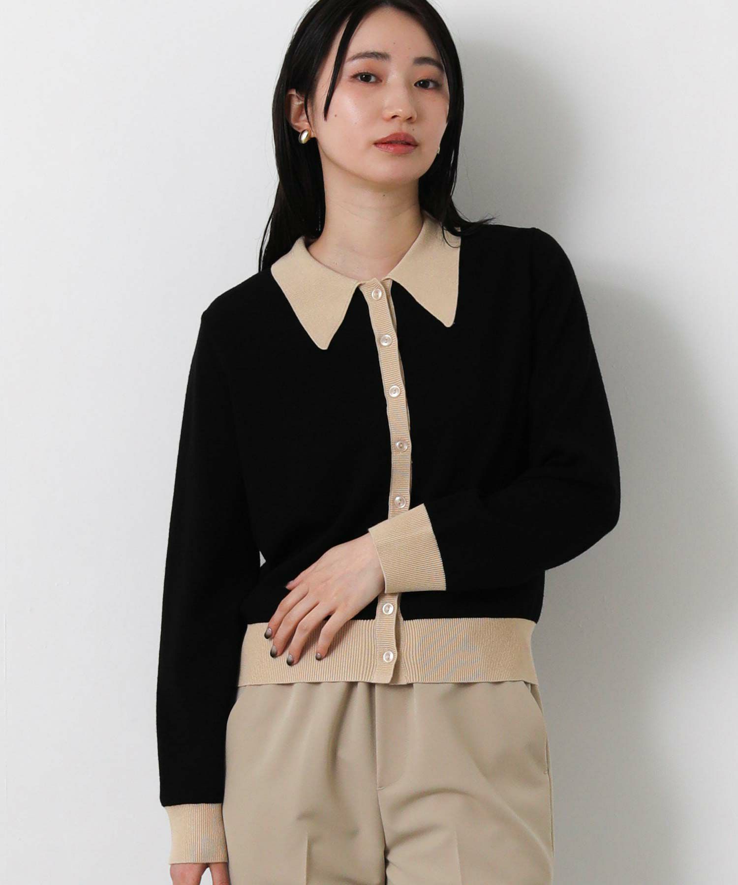 バイカラーの配色が目を惹く、クラシカルな印象のポロ衿ニットカーデ。