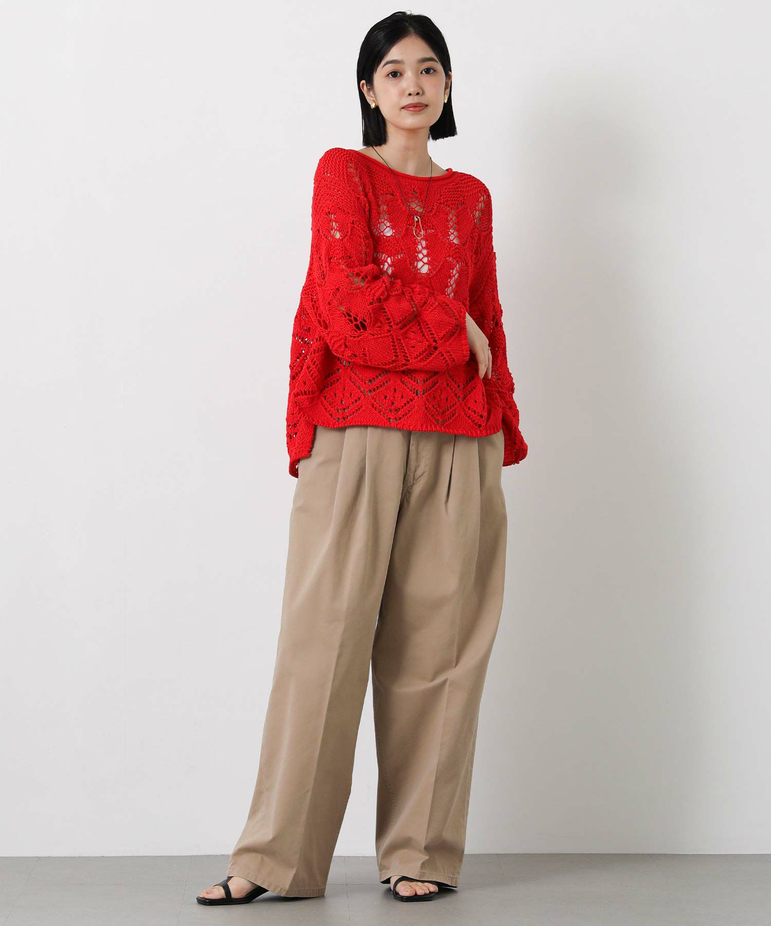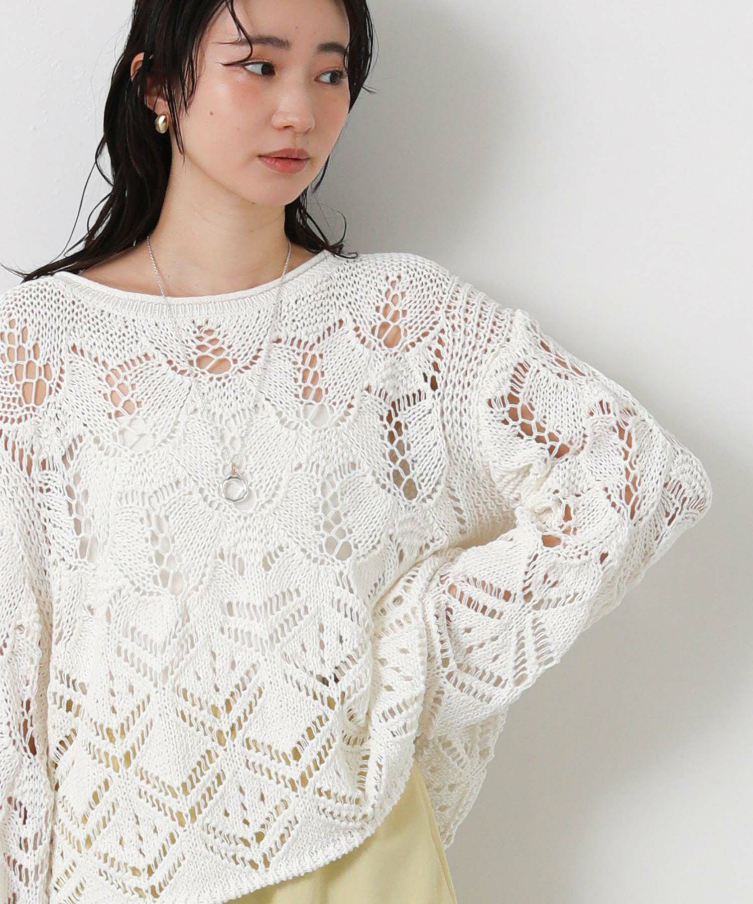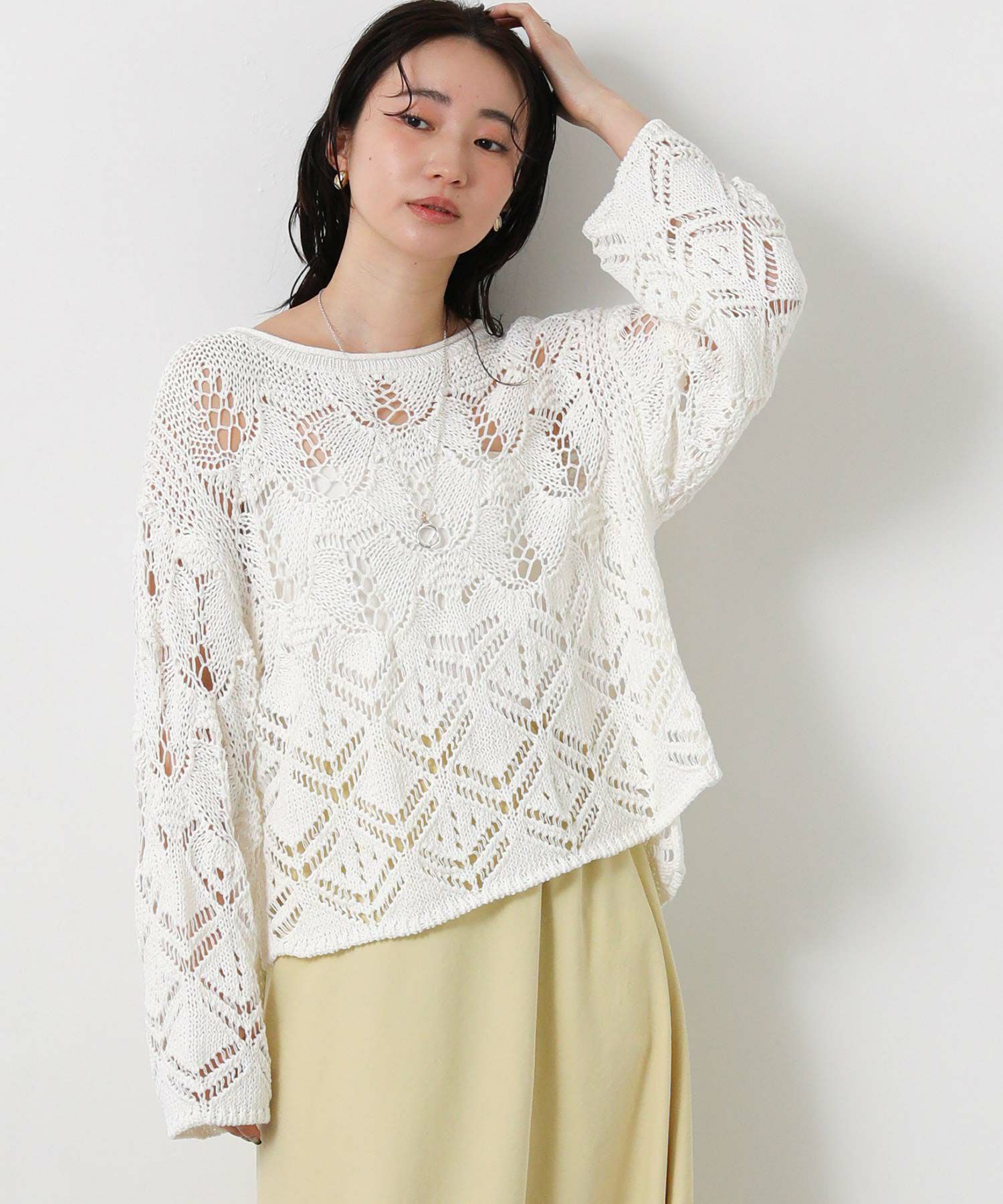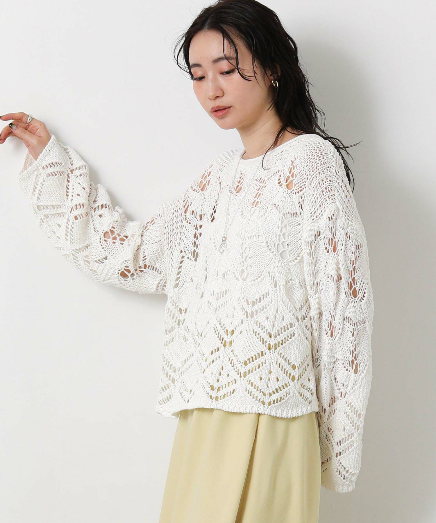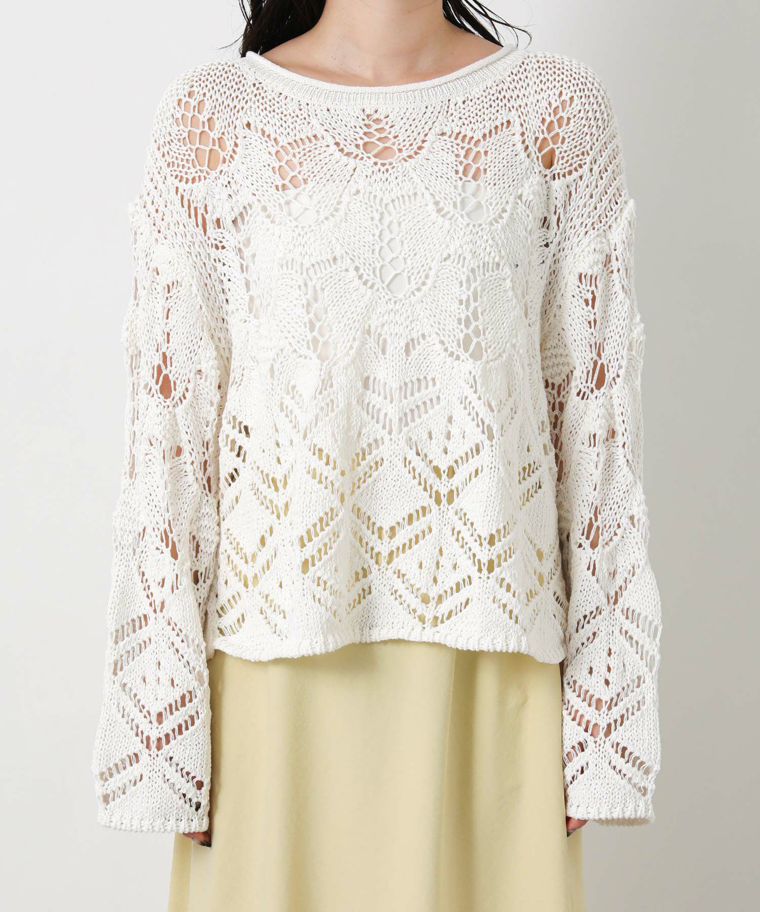 透かし柄が軽やかな印象のニットプルオーバー。