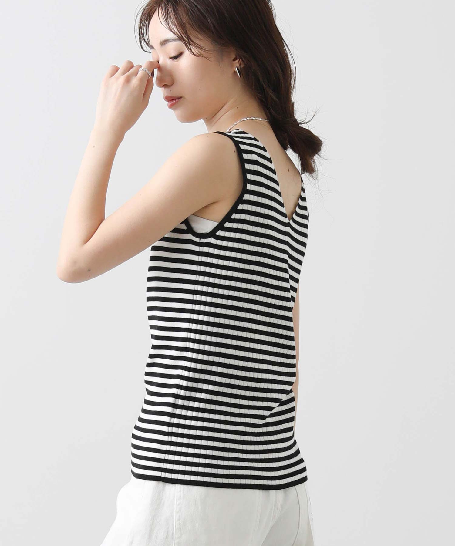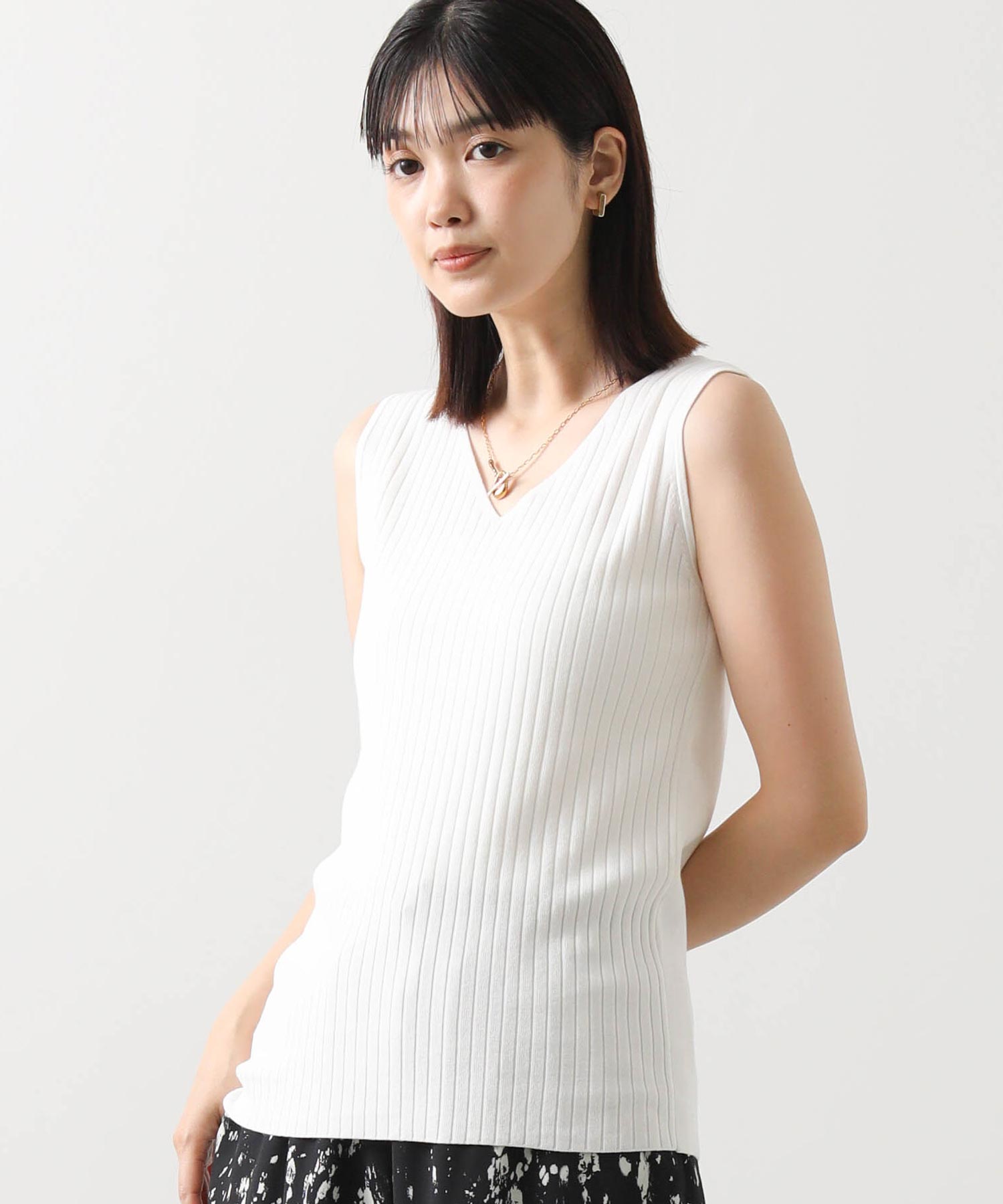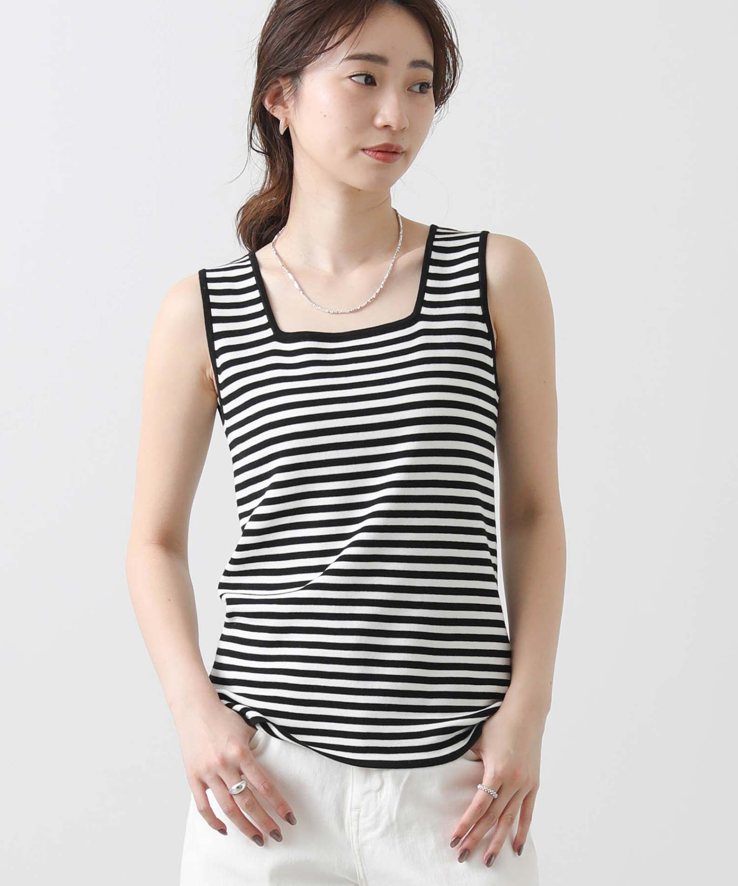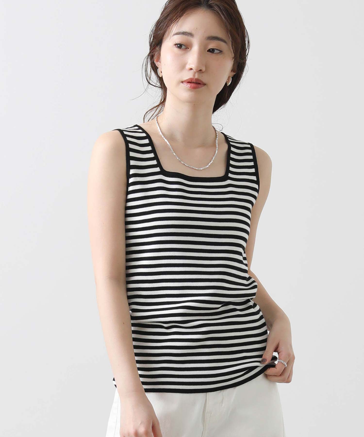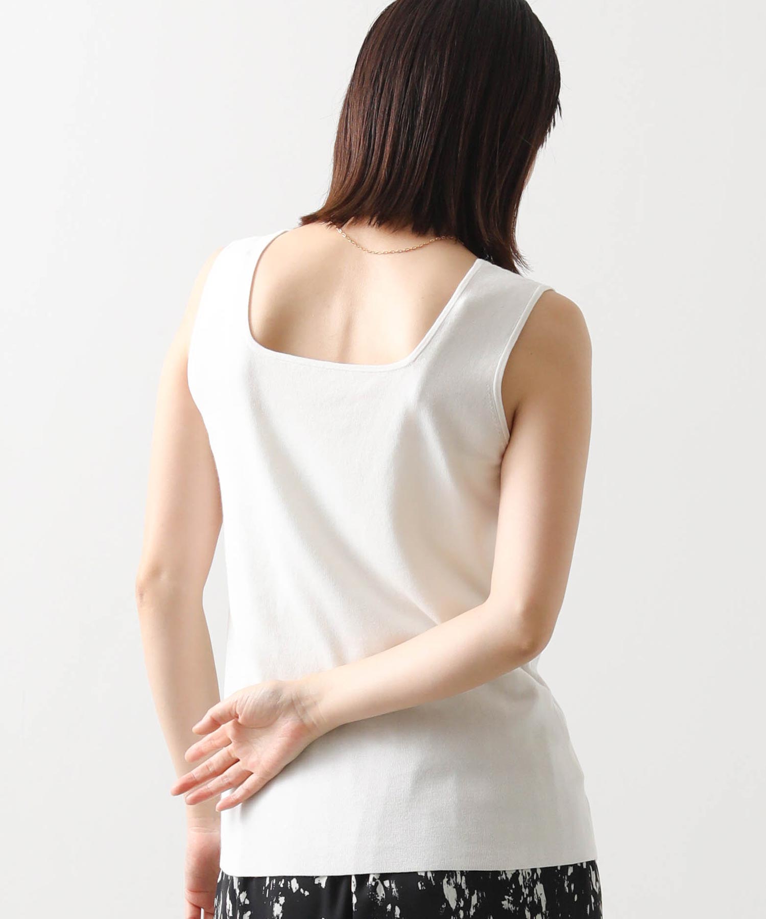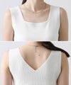 デコルテがキレイに見えるスクエアネックと、顔周りがスッキリ見えるVネックの、前後2WAYで楽しめるニットタンク。