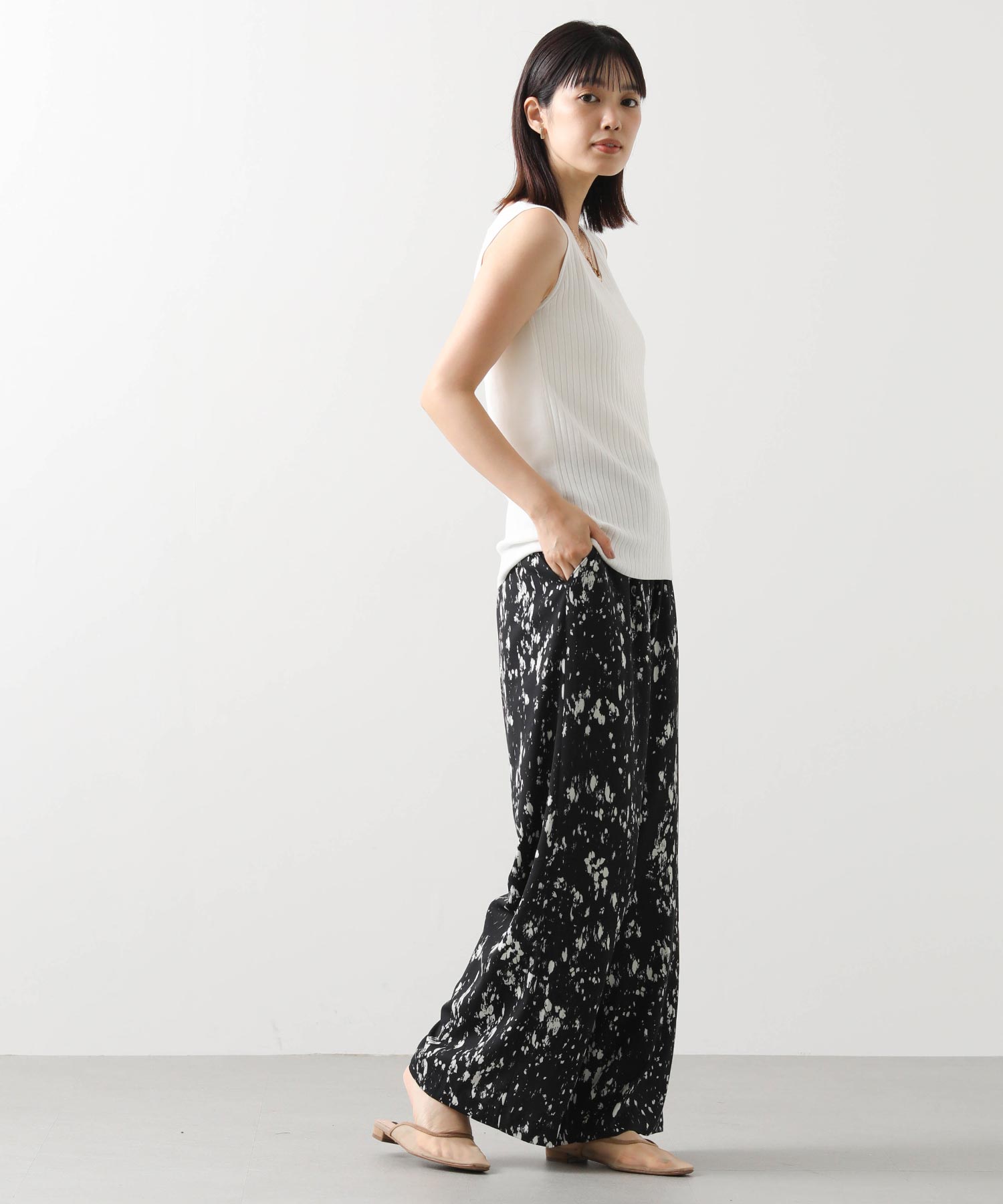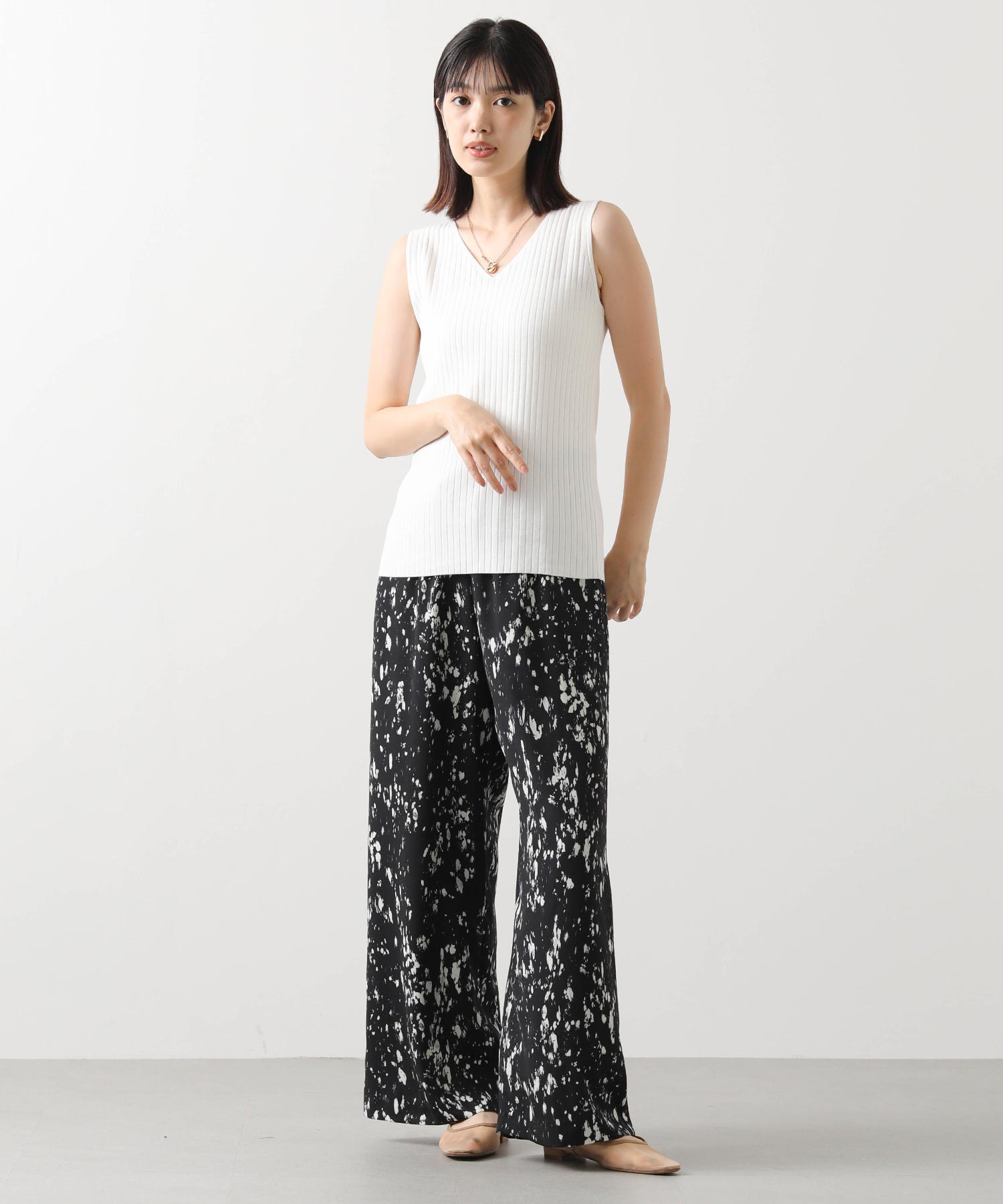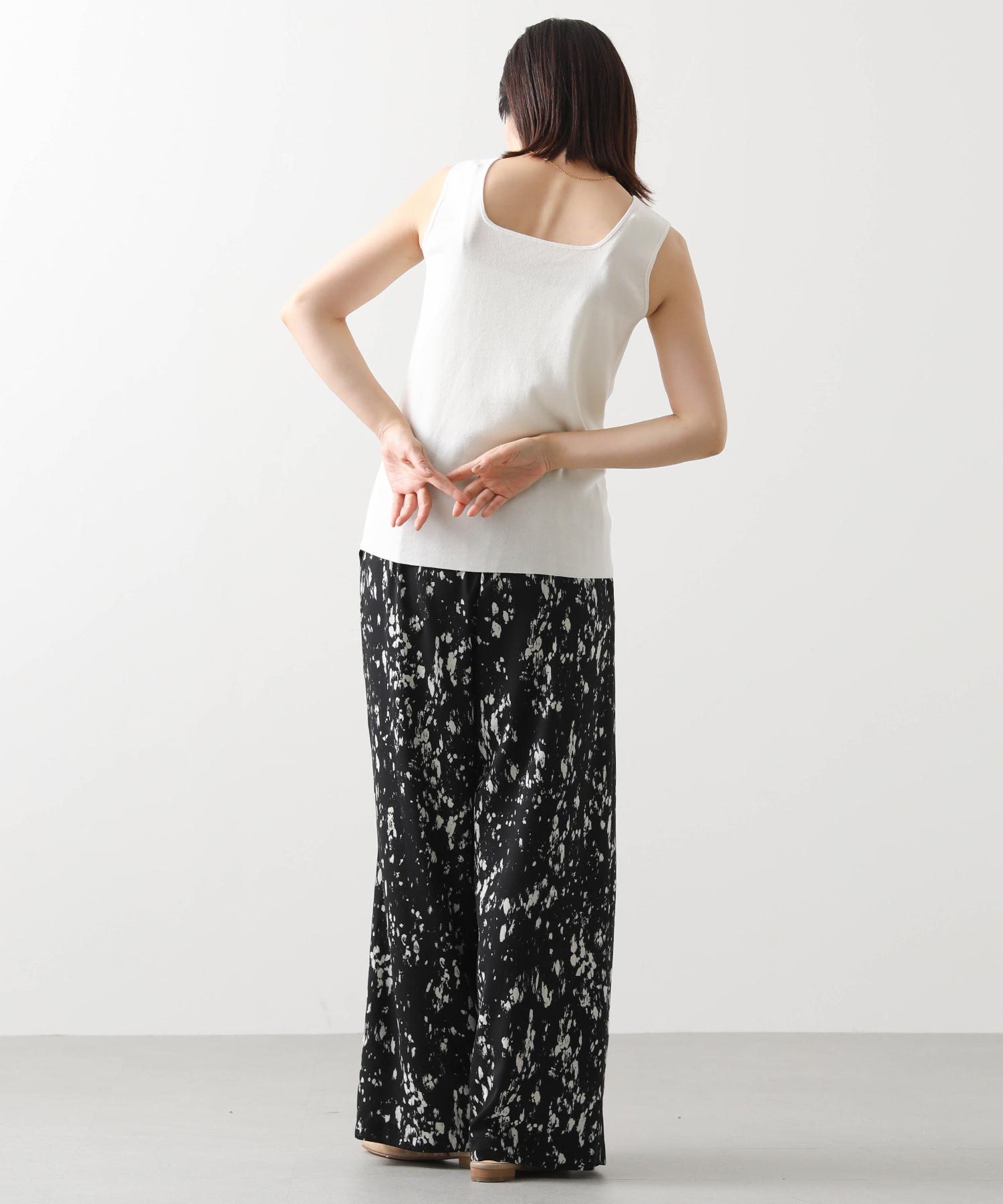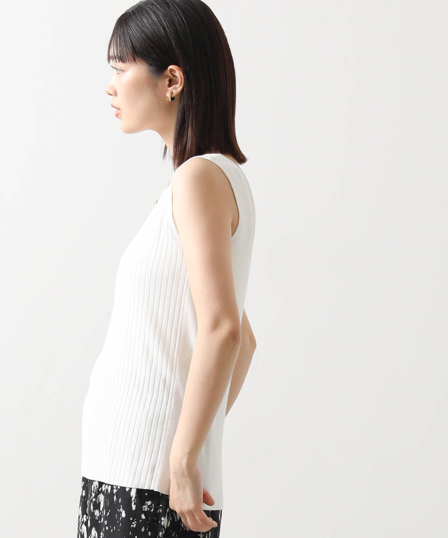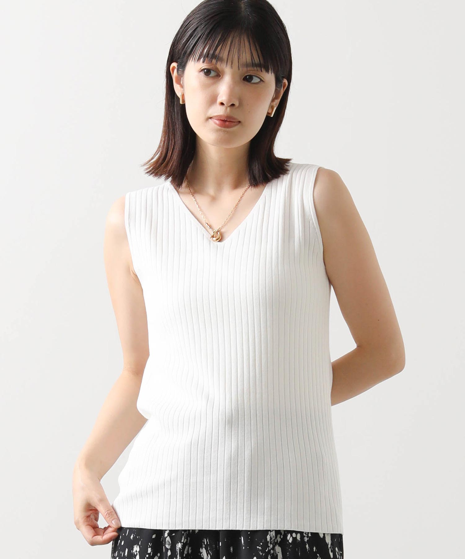 デコルテがキレイに見えるスクエアネックと、顔周りがスッキリ見えるVネックの、前後2WAYで楽しめるニットタンク。