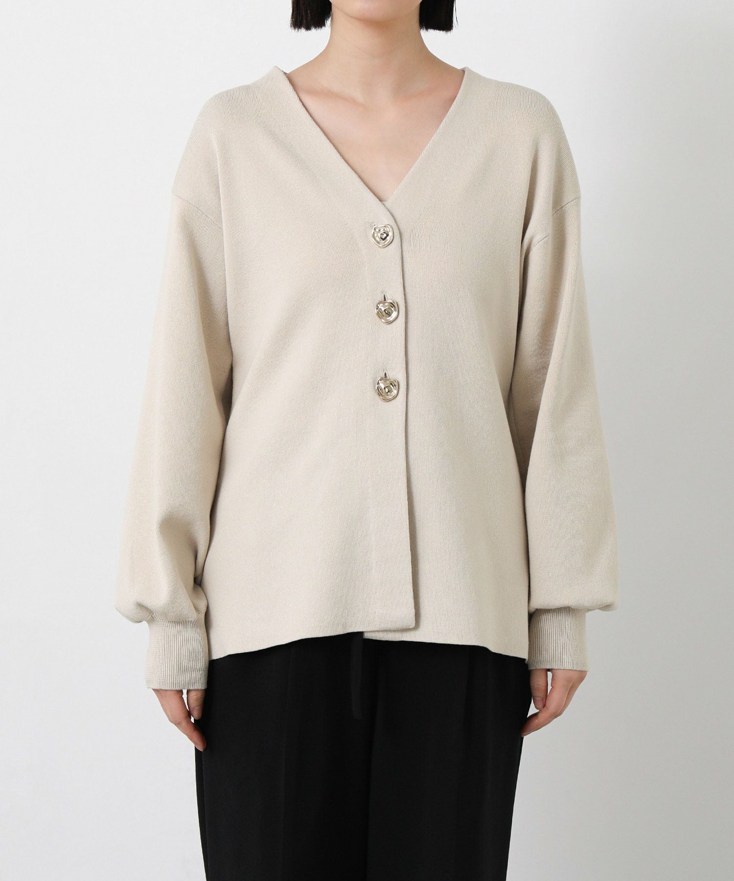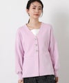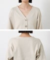 すっきりとしたVネックラインと、ウエストを絞ってペプラムシルエットに編み上げた上品なニットカーデ。