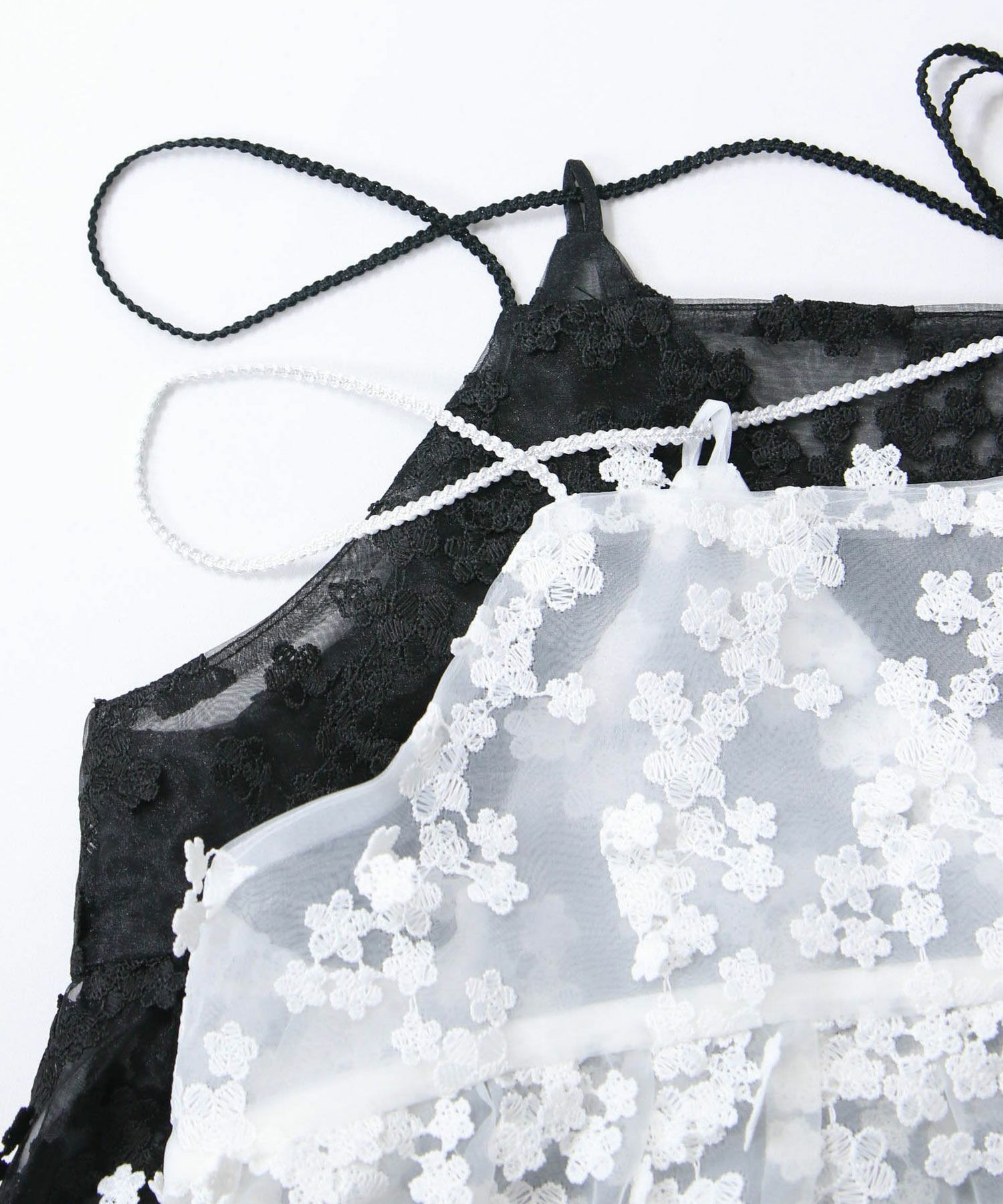 透け感のあるオーガンジー素材に、立体的に刺繍を施した動きのある素材を使用。