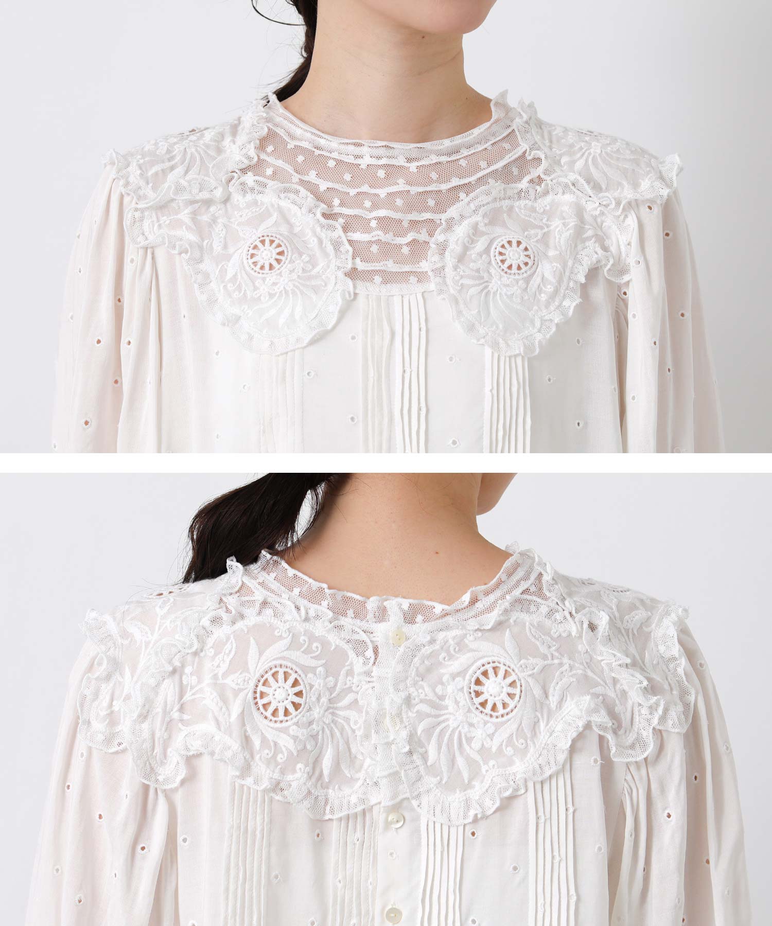 衿元にはチュール×モチーフをあしらい、身頃全体にドットの刺繍を施し繊細で上品な仕上がりに。