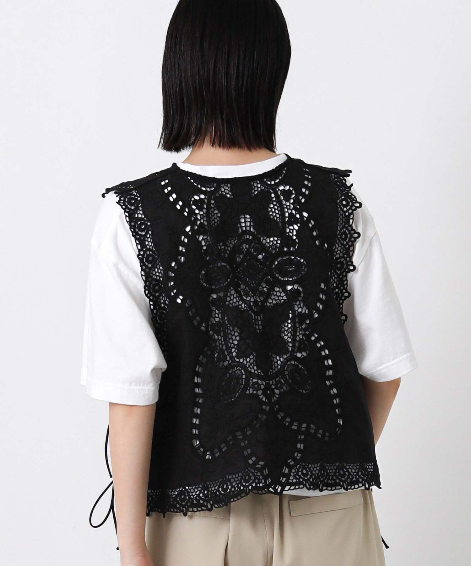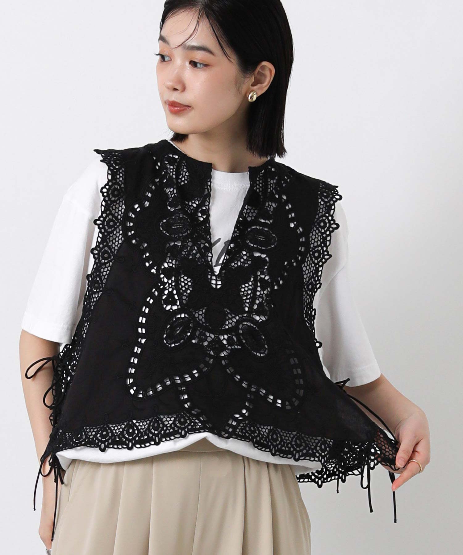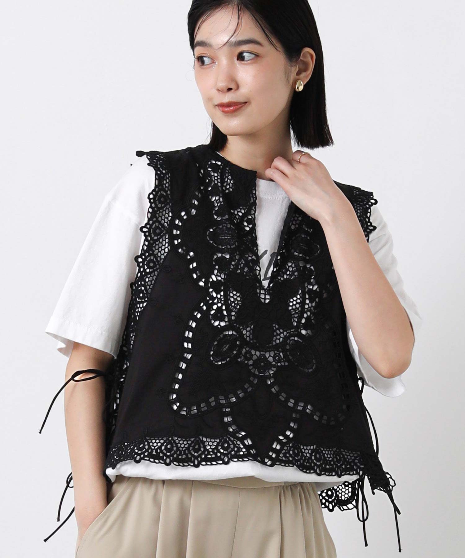 繊細なレースの凹凸が奥行きのある表情を生み出し、コーディネートにさりげない華やかさをプラスしてくれるブラウス。