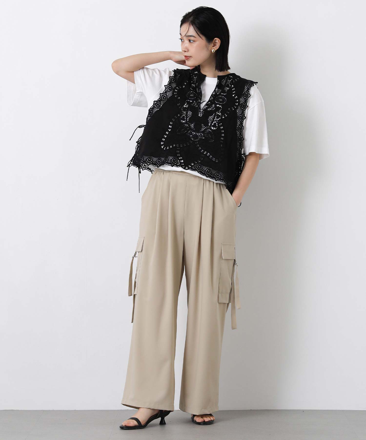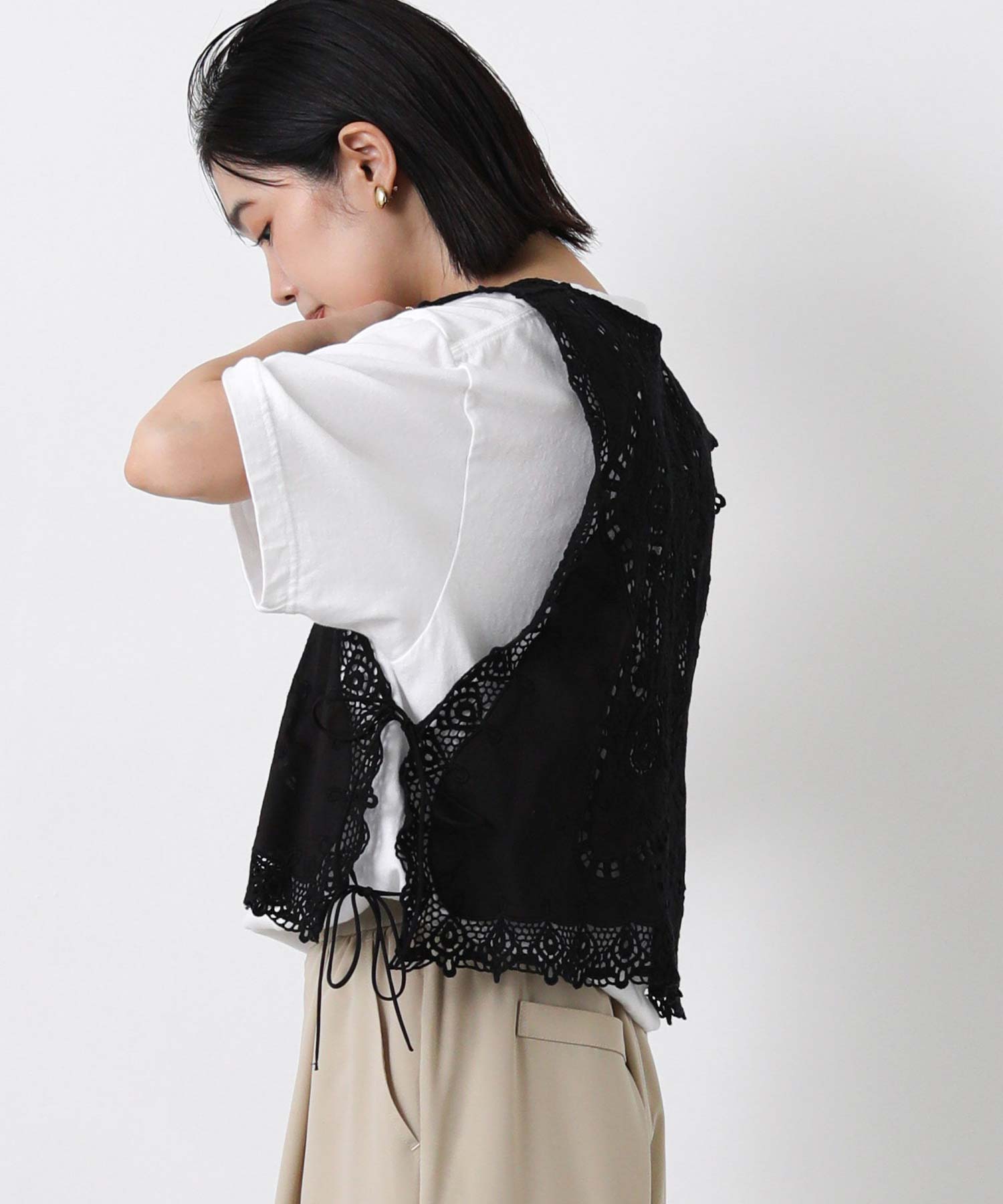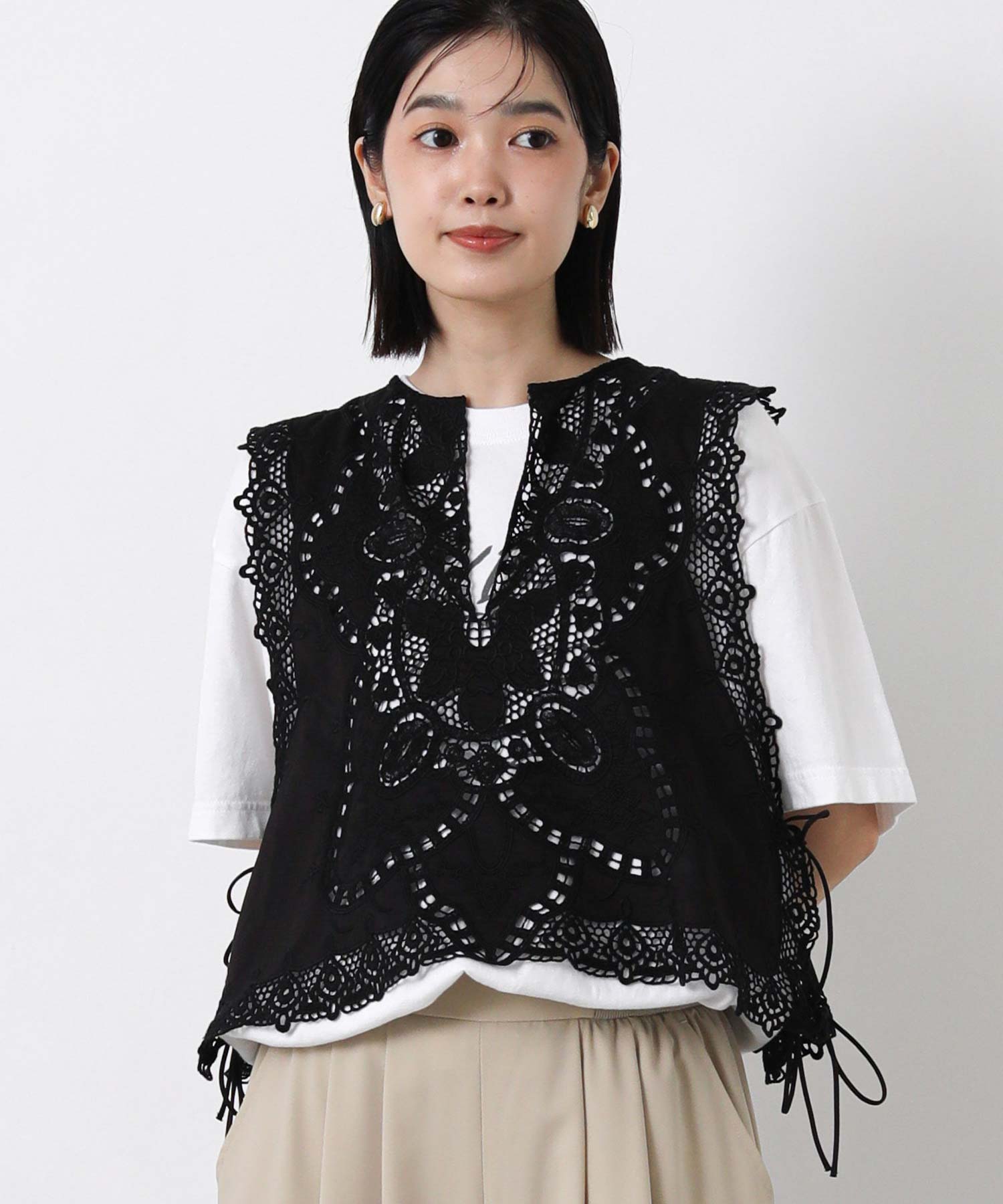 繊細なレースの凹凸が奥行きのある表情を生み出し、コーディネートにさりげない華やかさをプラスしてくれるブラウス。
