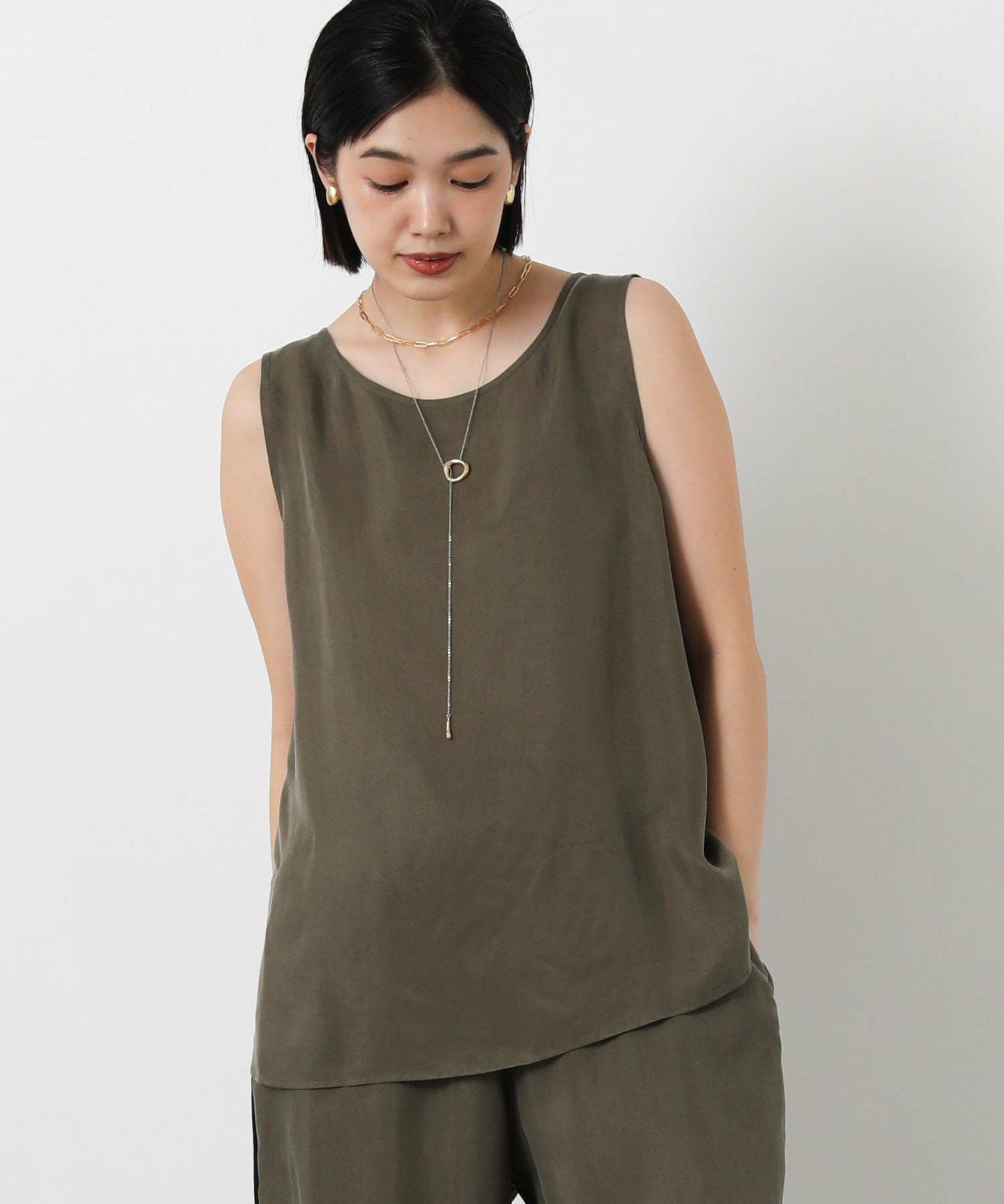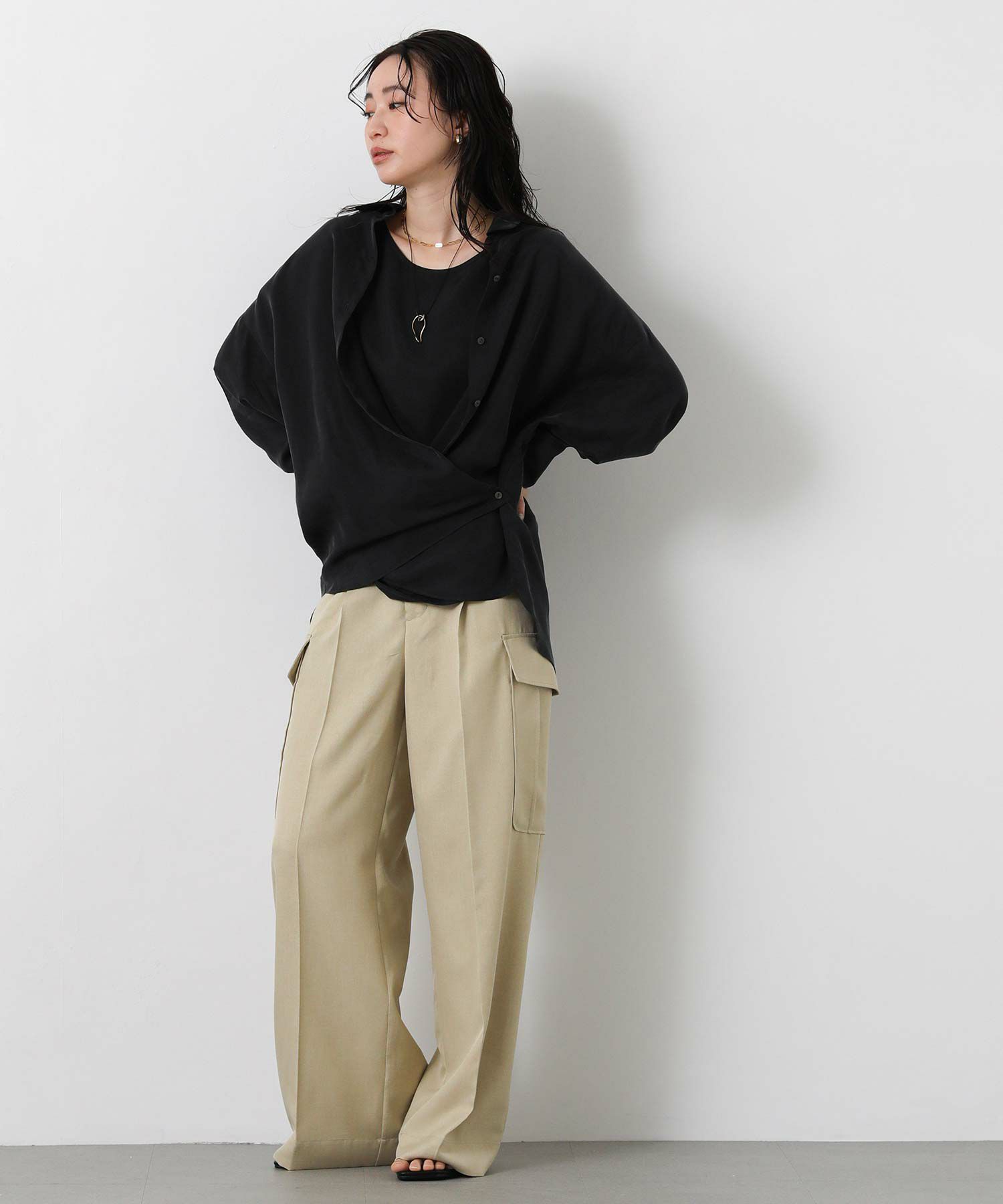 LUキュプラシャツ(OEO455424001)、LUキュプラセミワイド(OEO455426001)と素材感を合わせたセットアップでの着こなしがオススメ。