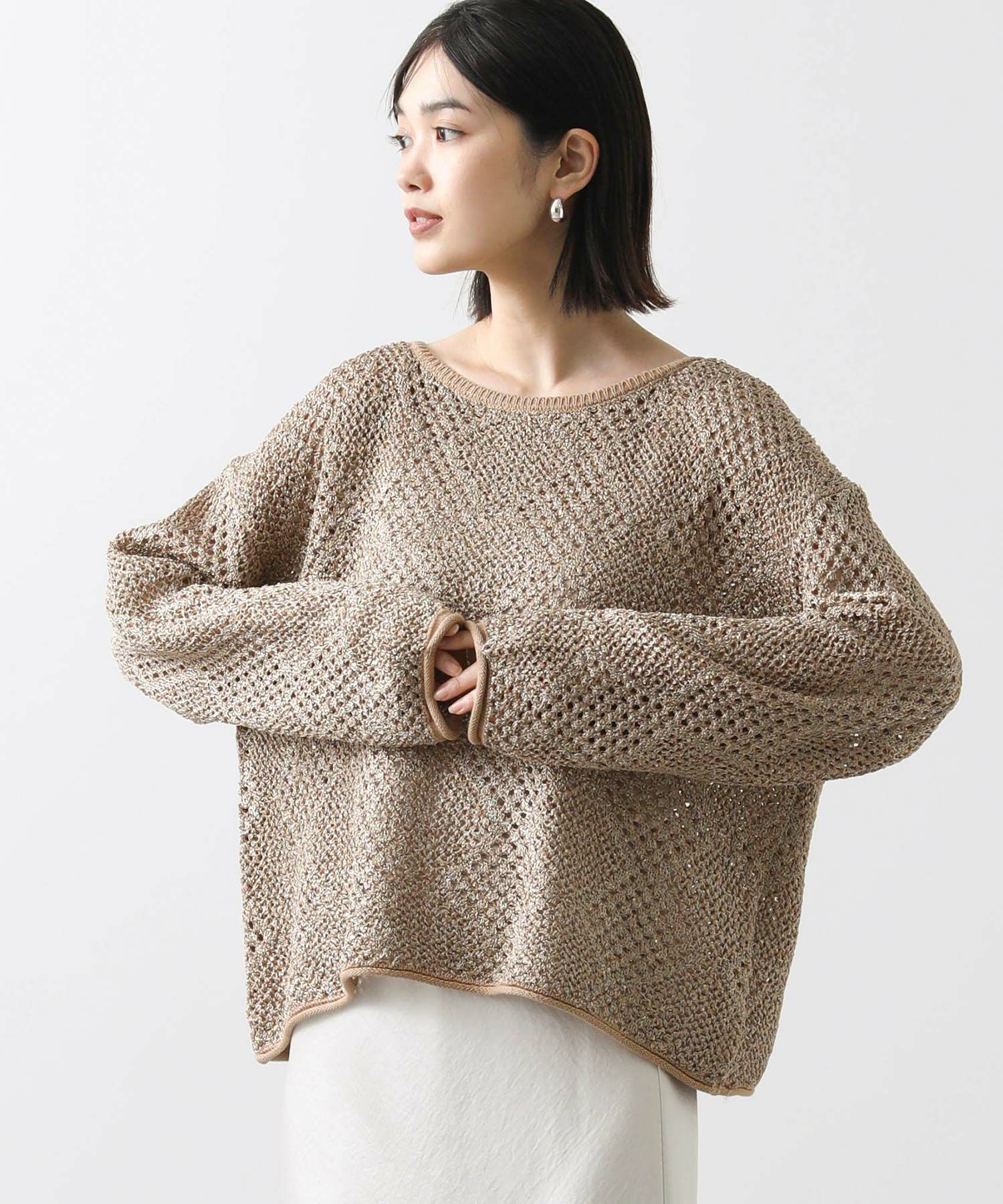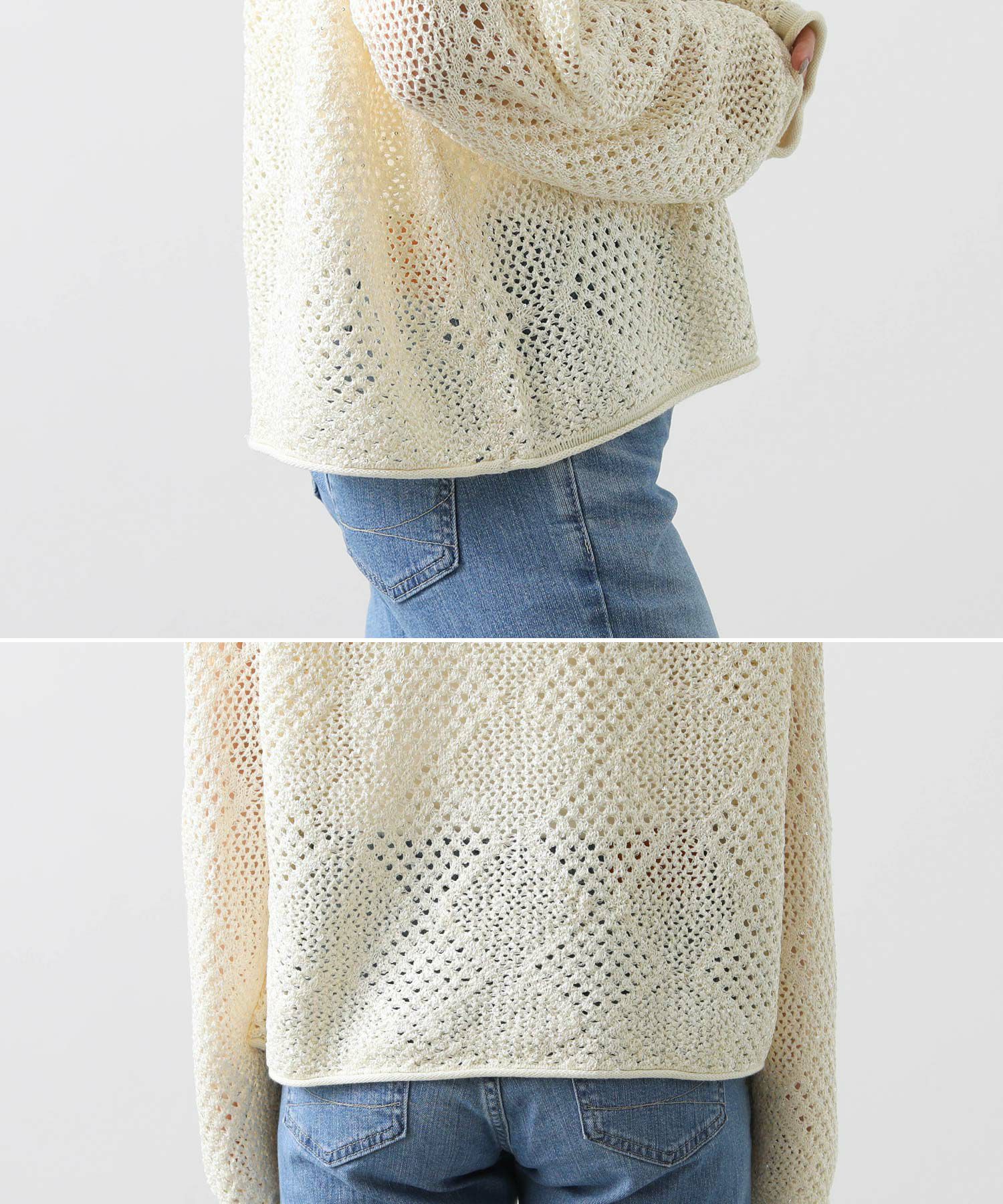【TorrazzoDonna(トラッツォドンナ)】から、小さなスパンコールが散りばめられた、ファンシーヤーンの透かし柄ニットをセレクト。