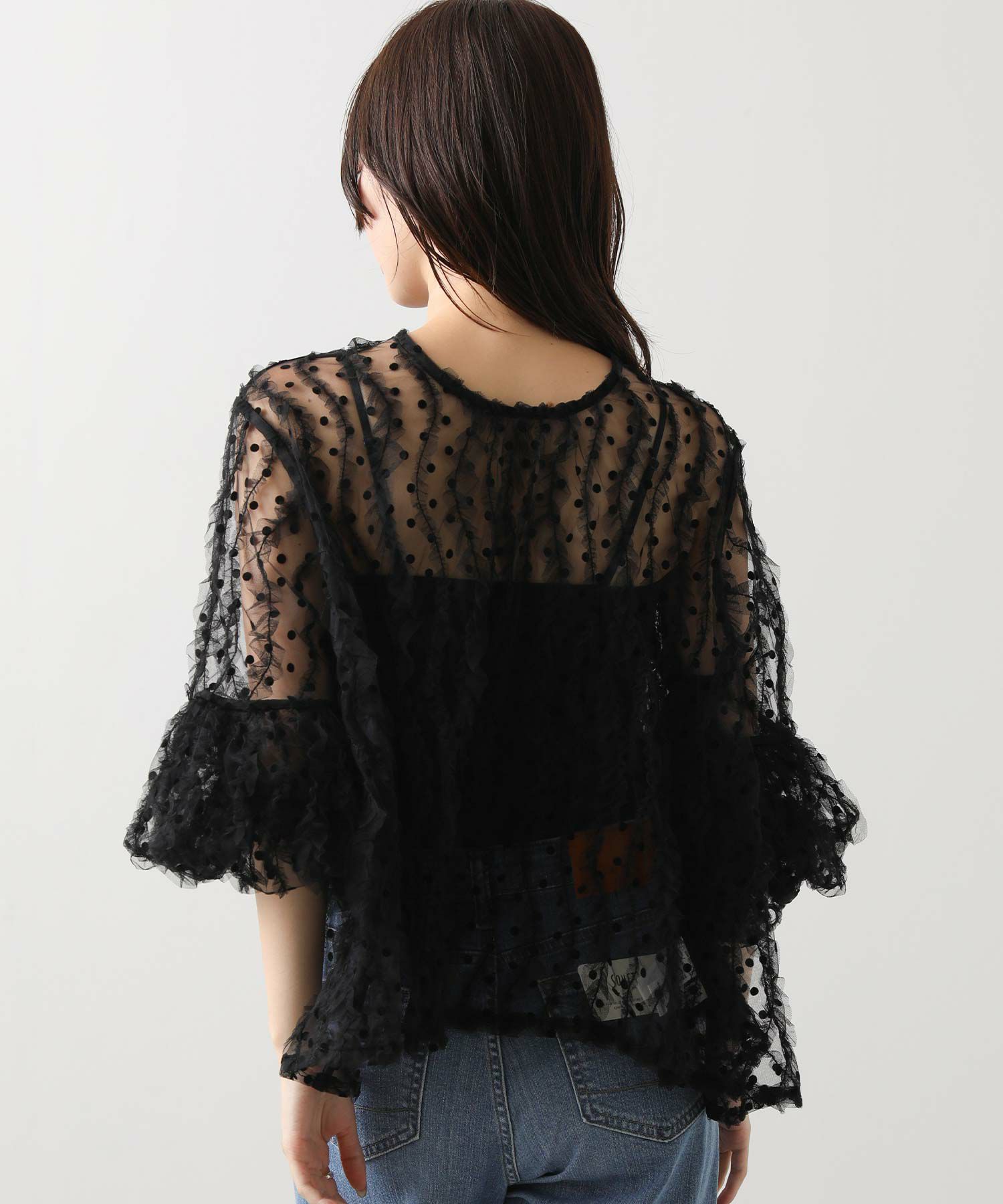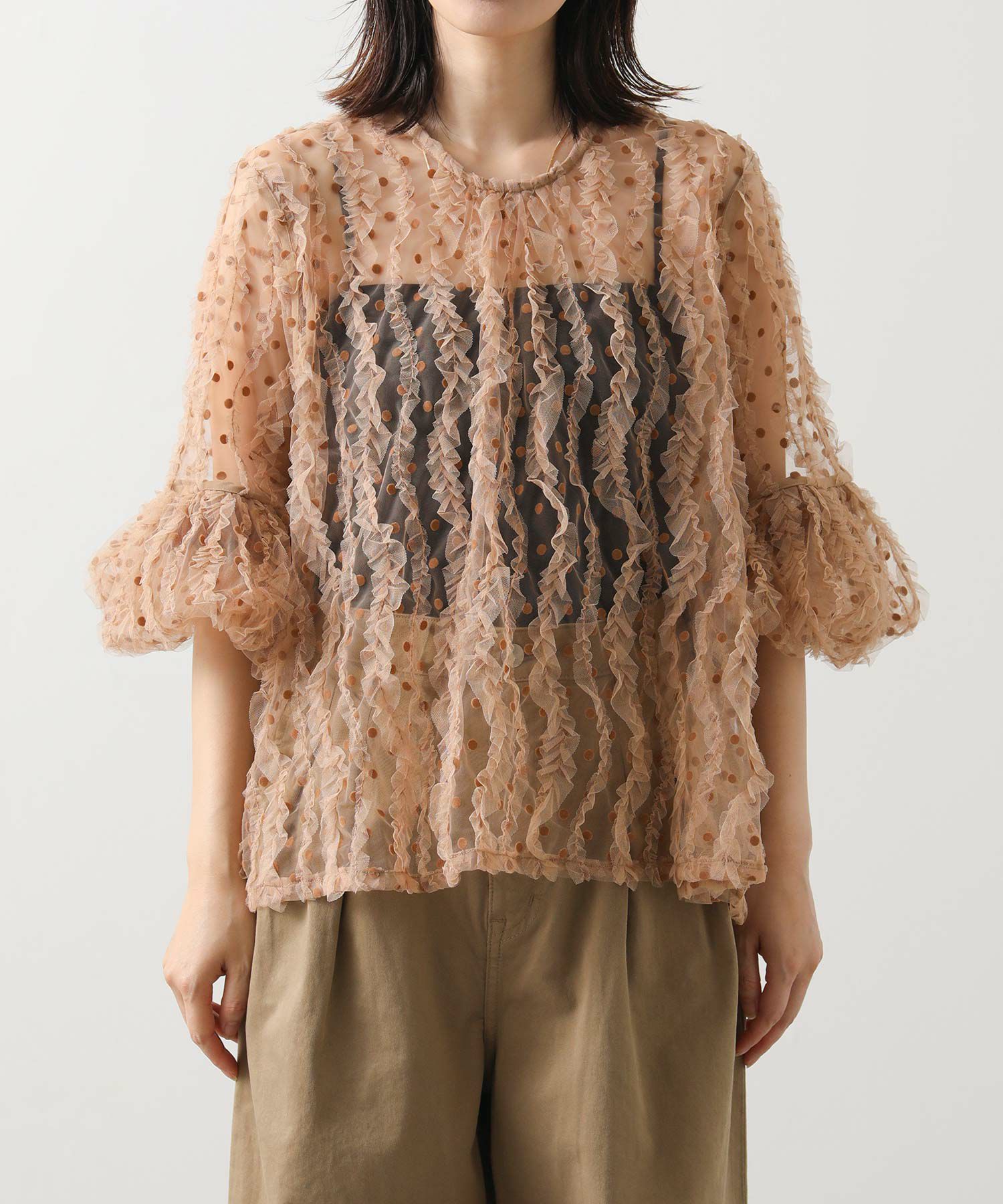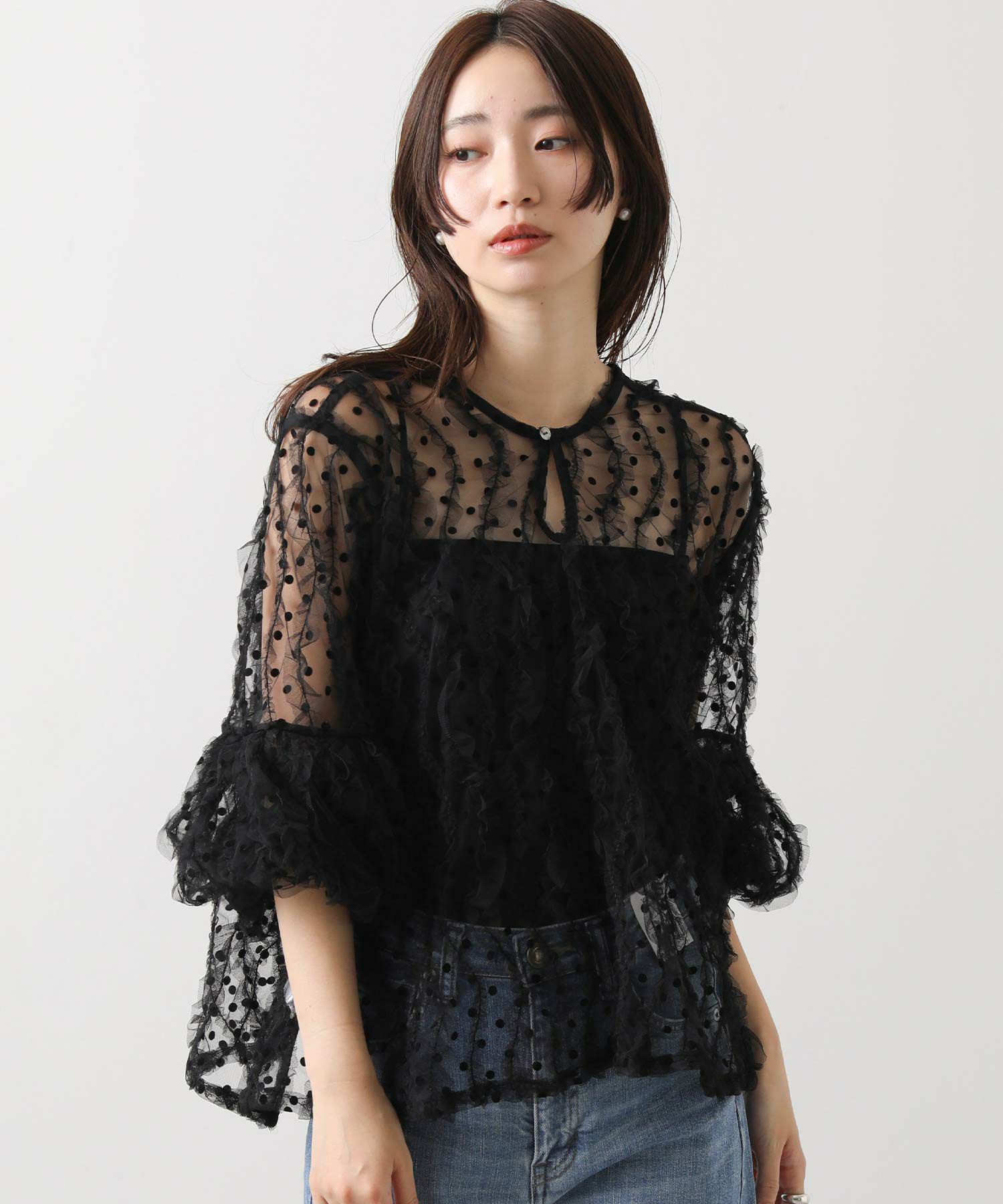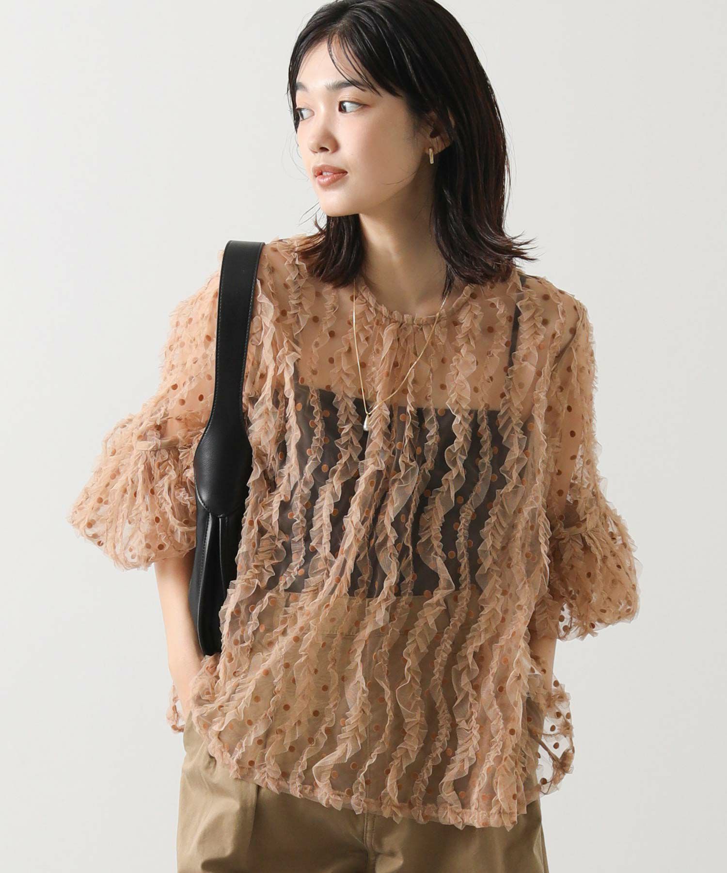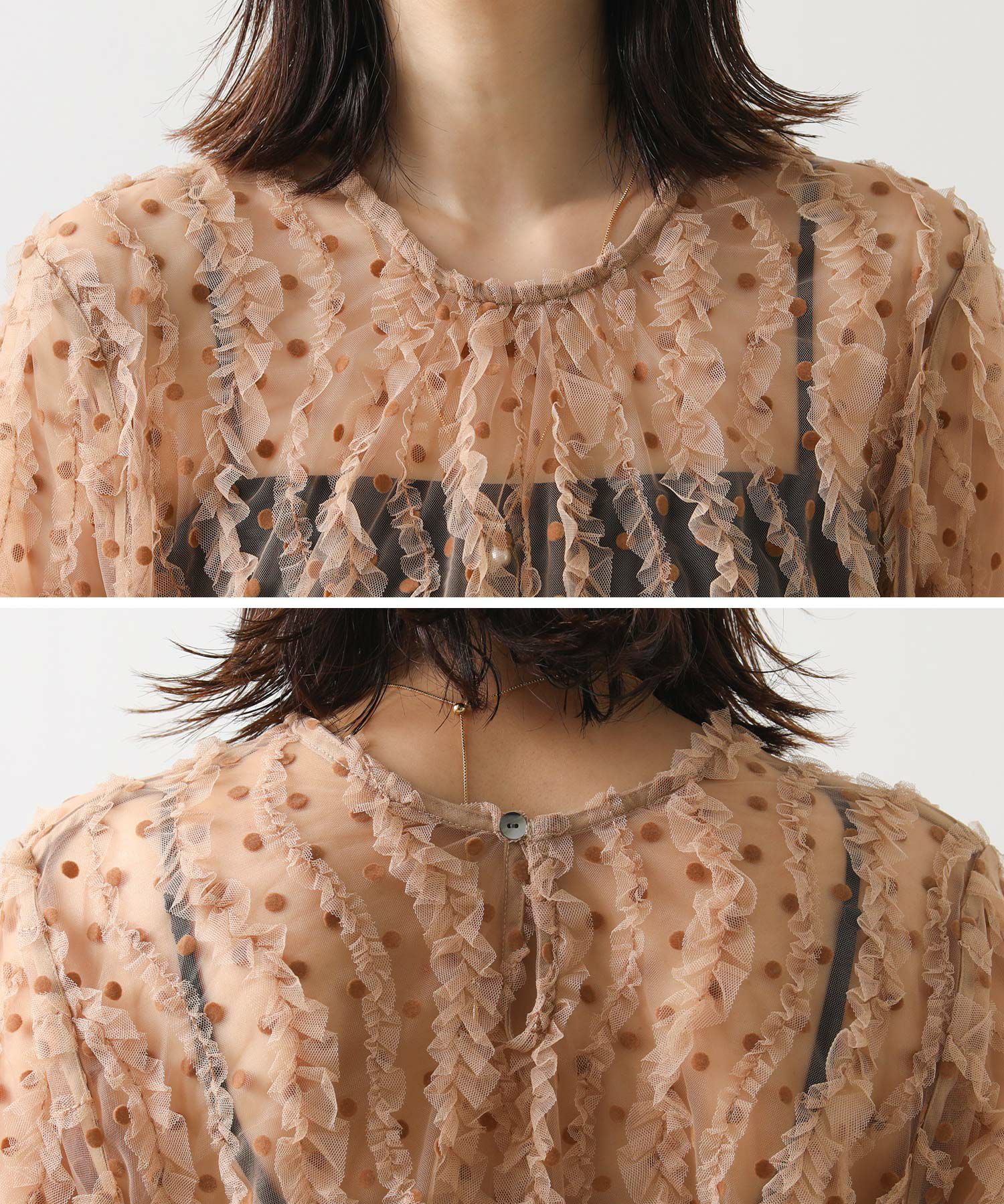 【TorrazzoDonna(トラッツォドンナ】から、チュールにベロアドットがプリントされた生地に、プラスでチュールフリルが波形に縫製されたファンシー生地のブラウスをセレクト。