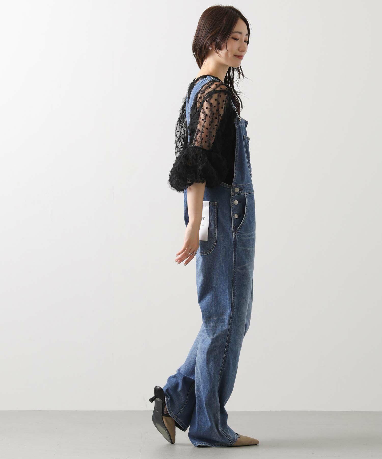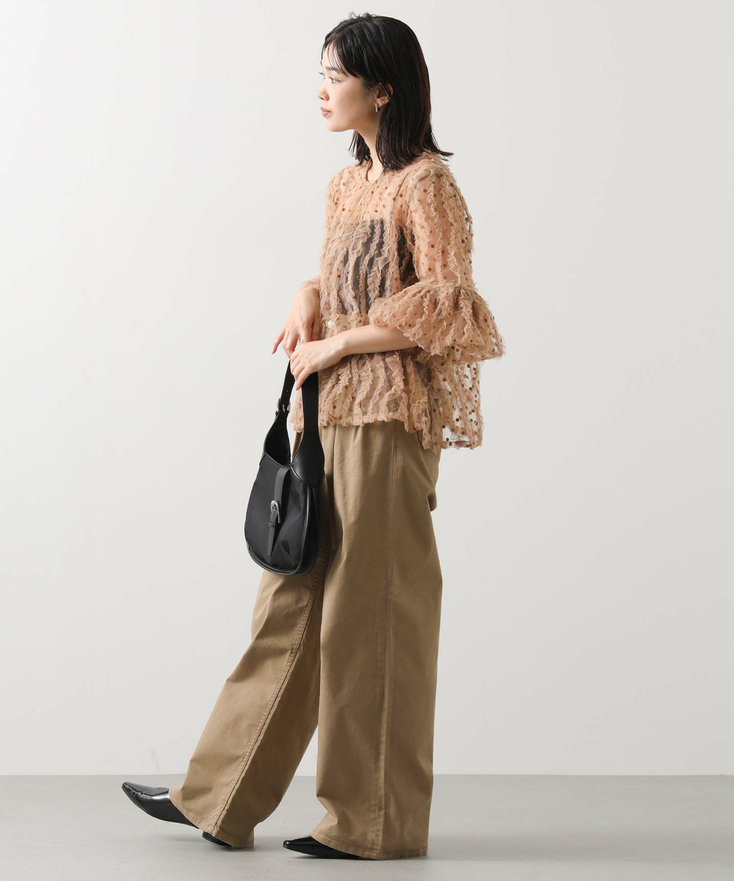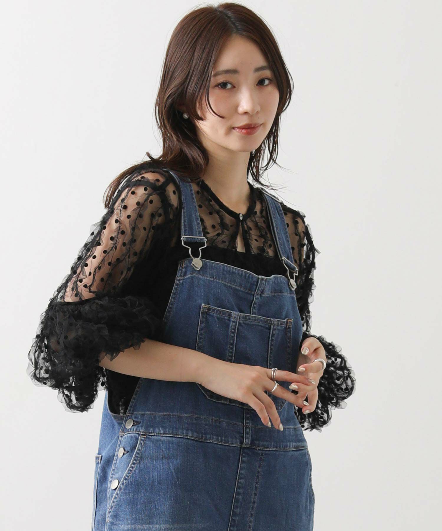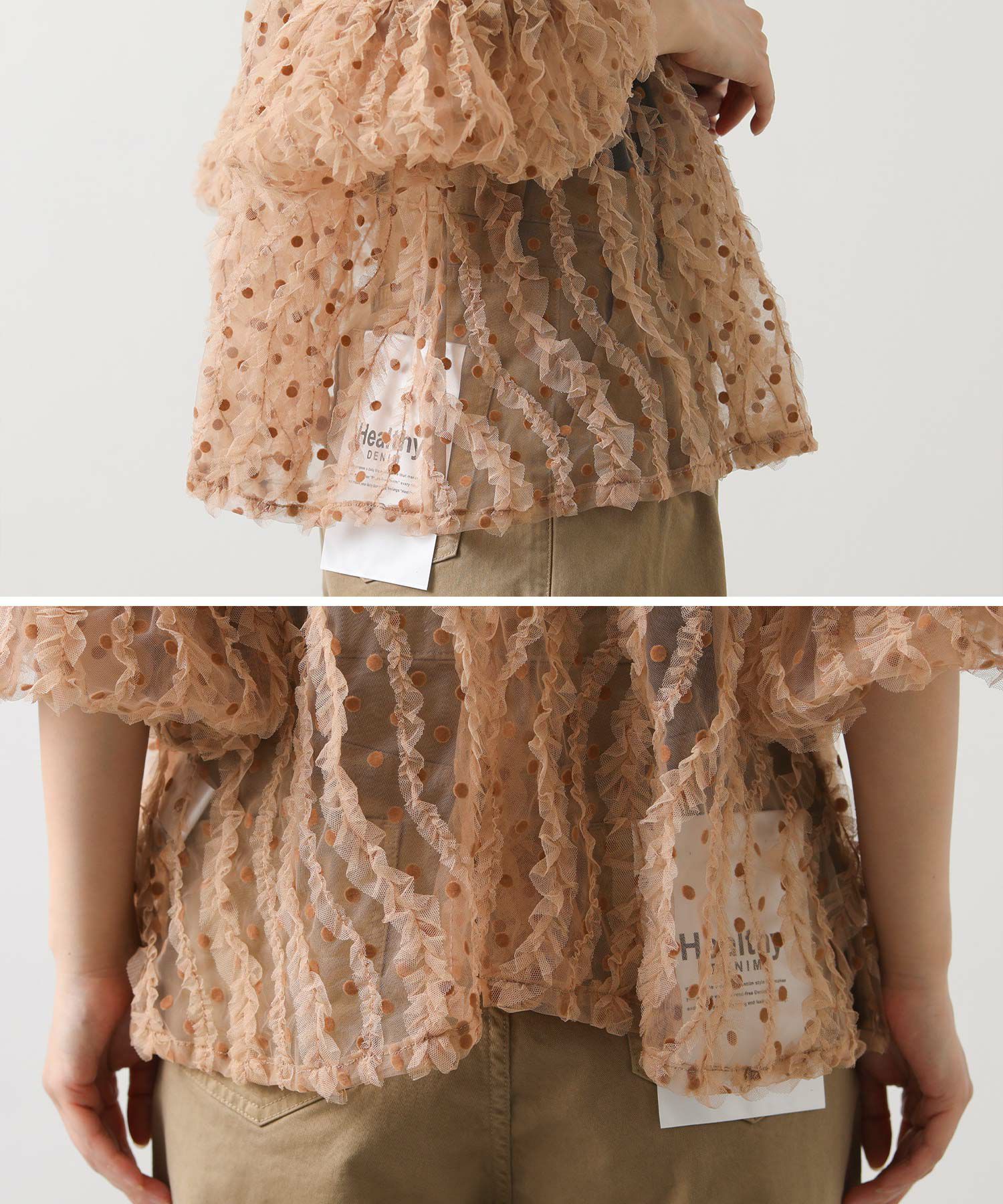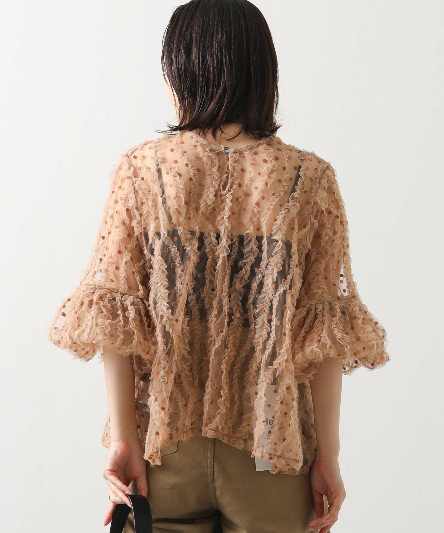 【TorrazzoDonna(トラッツォドンナ】から、チュールにベロアドットがプリントされた生地に、プラスでチュールフリルが波形に縫製されたファンシー生地のブラウスをセレクト。