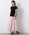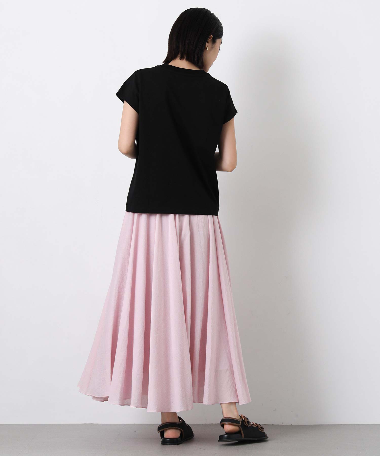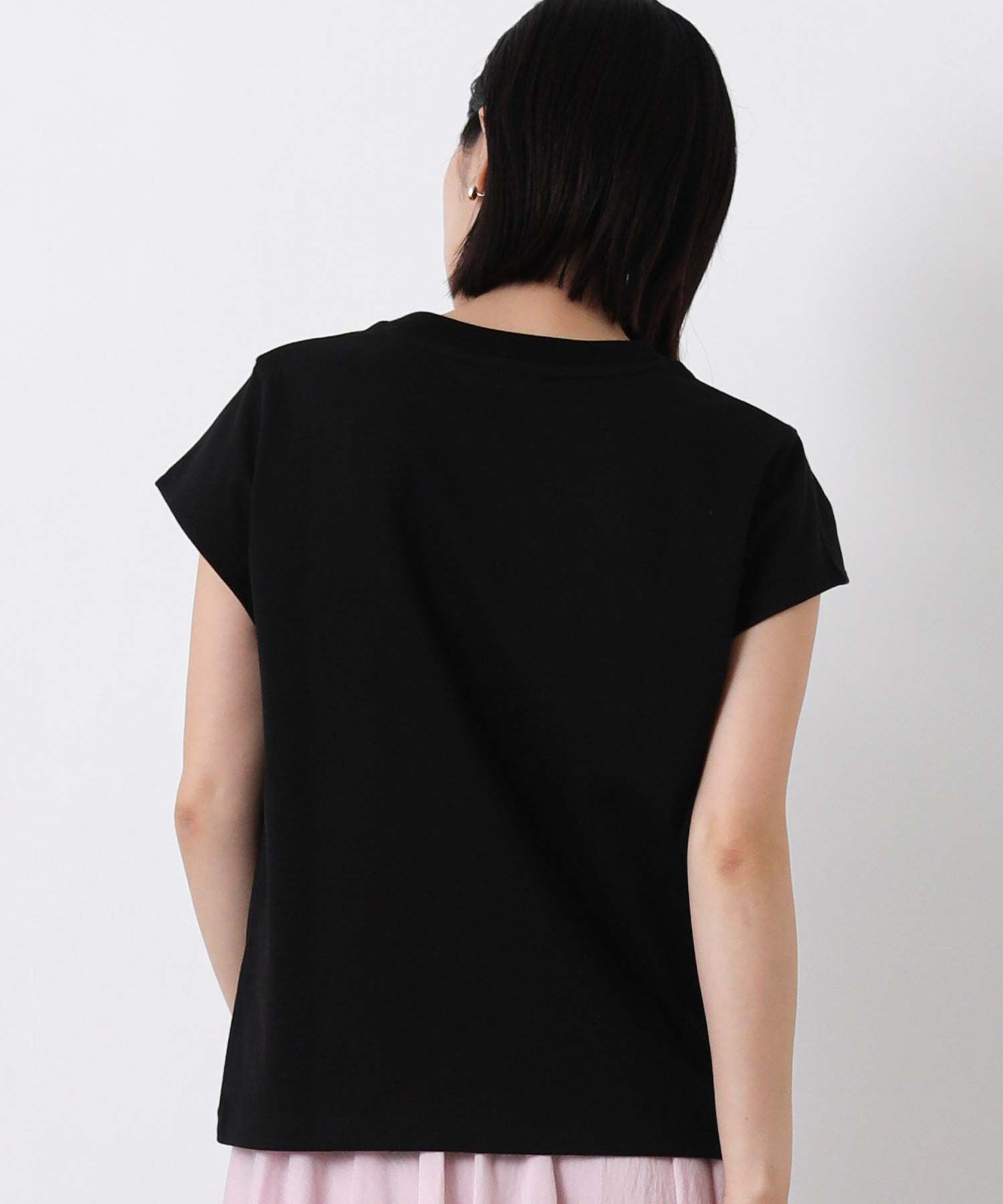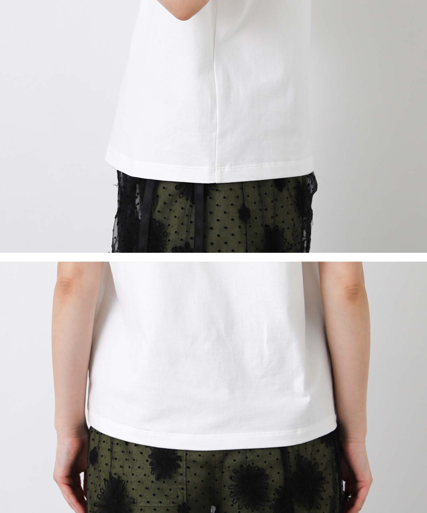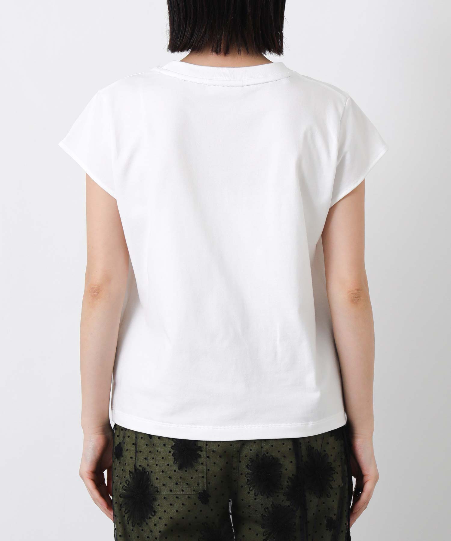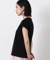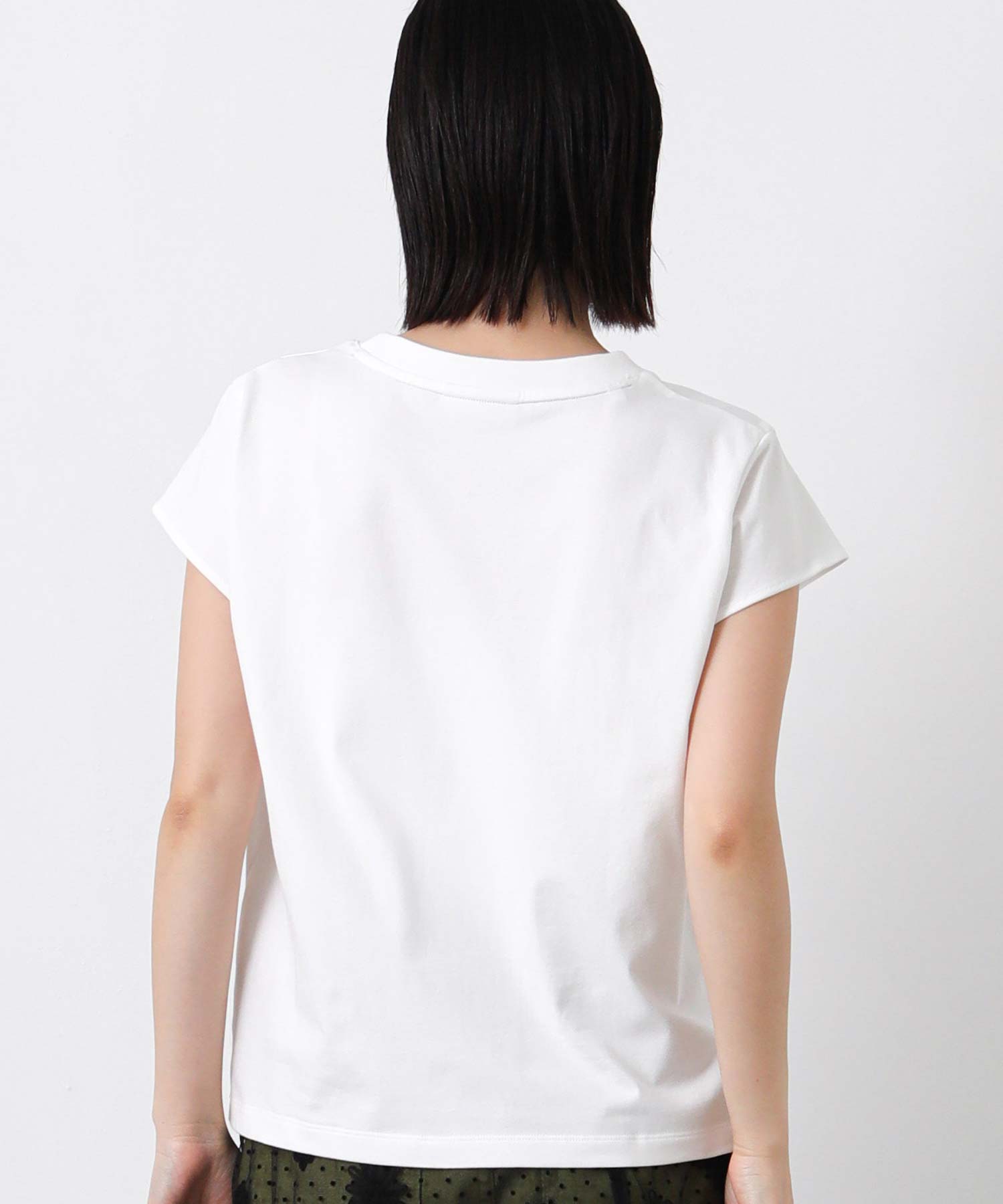シンプルなクルーネックTシャツの肩口をキャップスリーブでフェミニンに仕上げています。